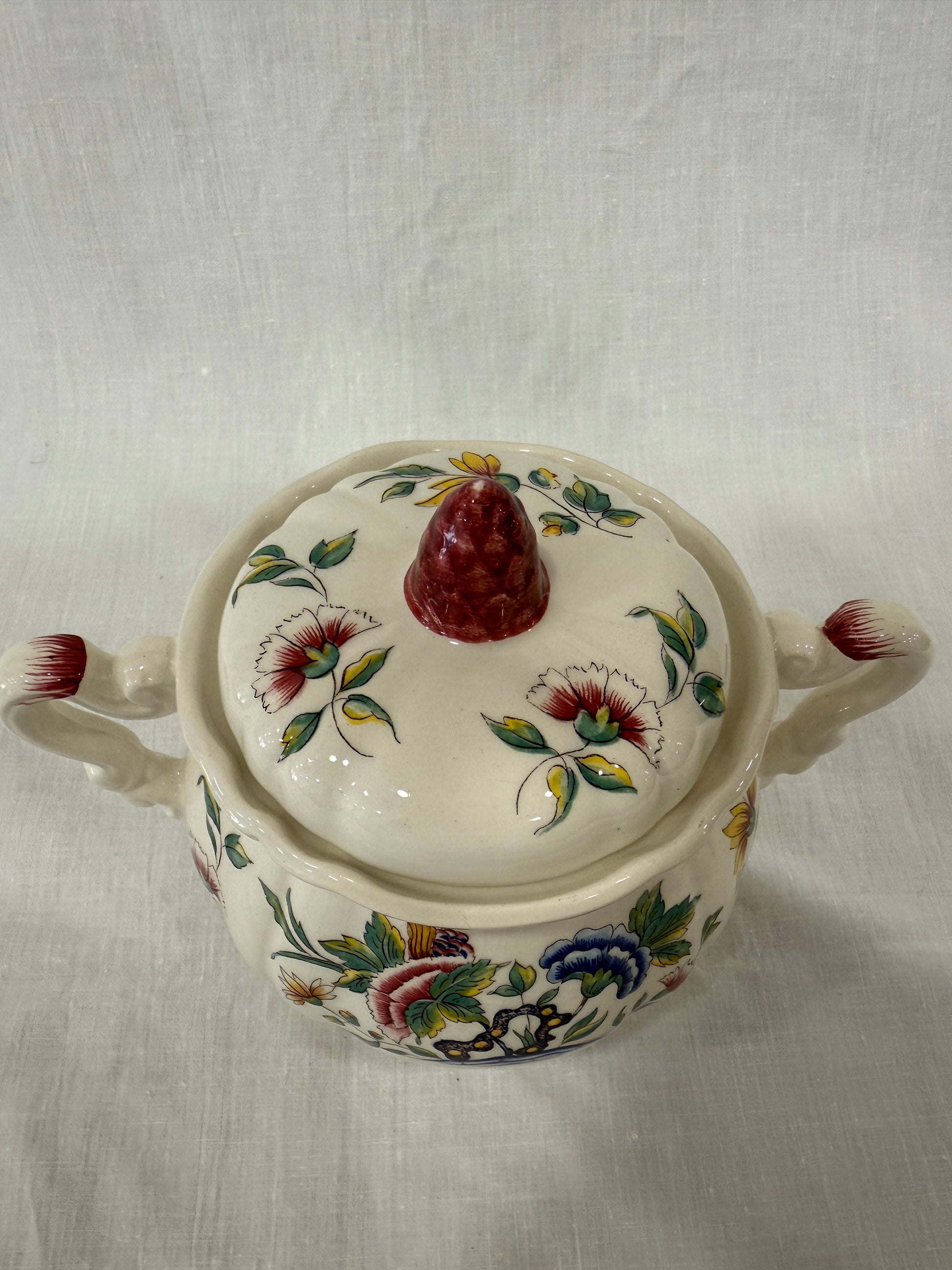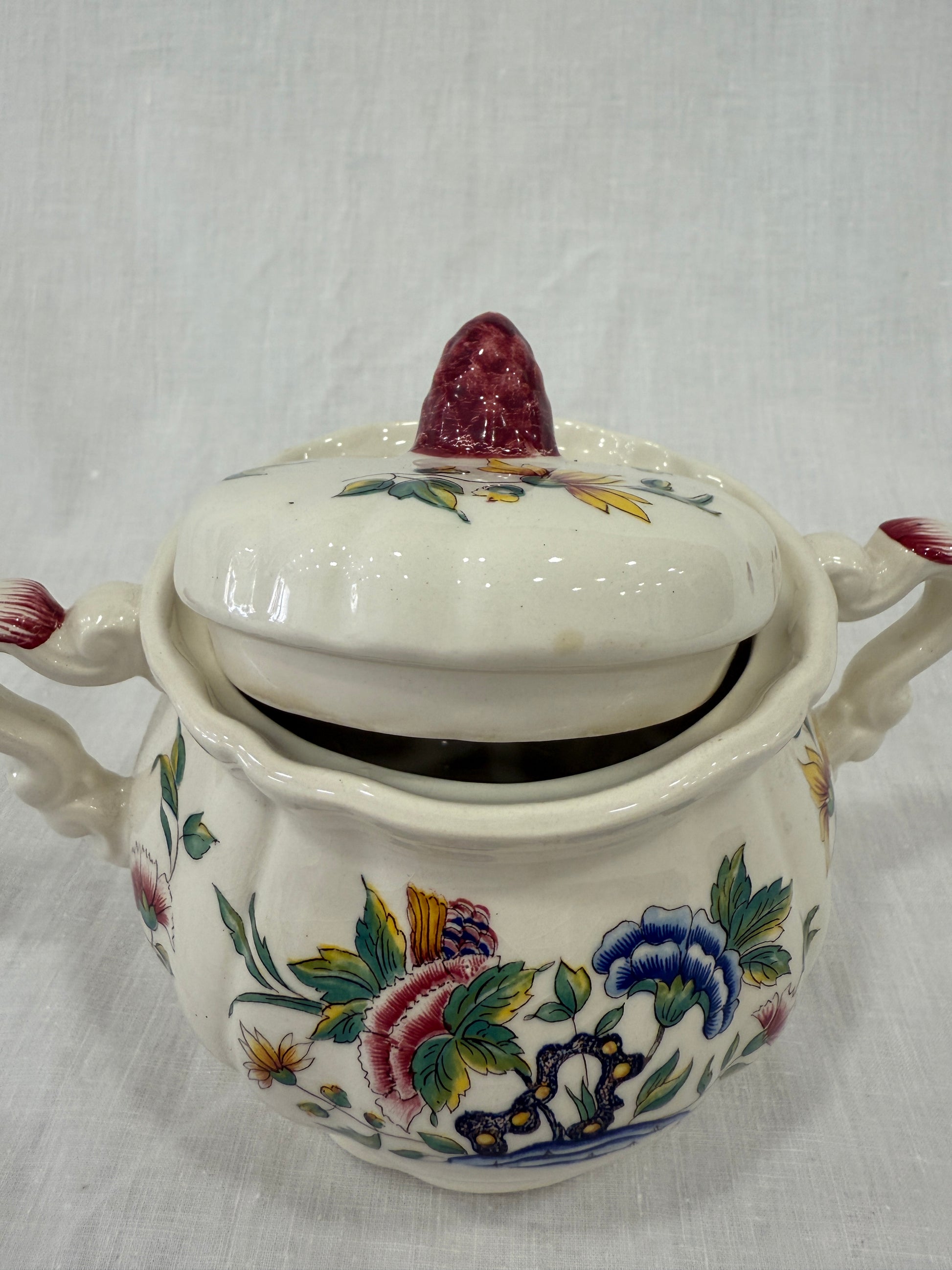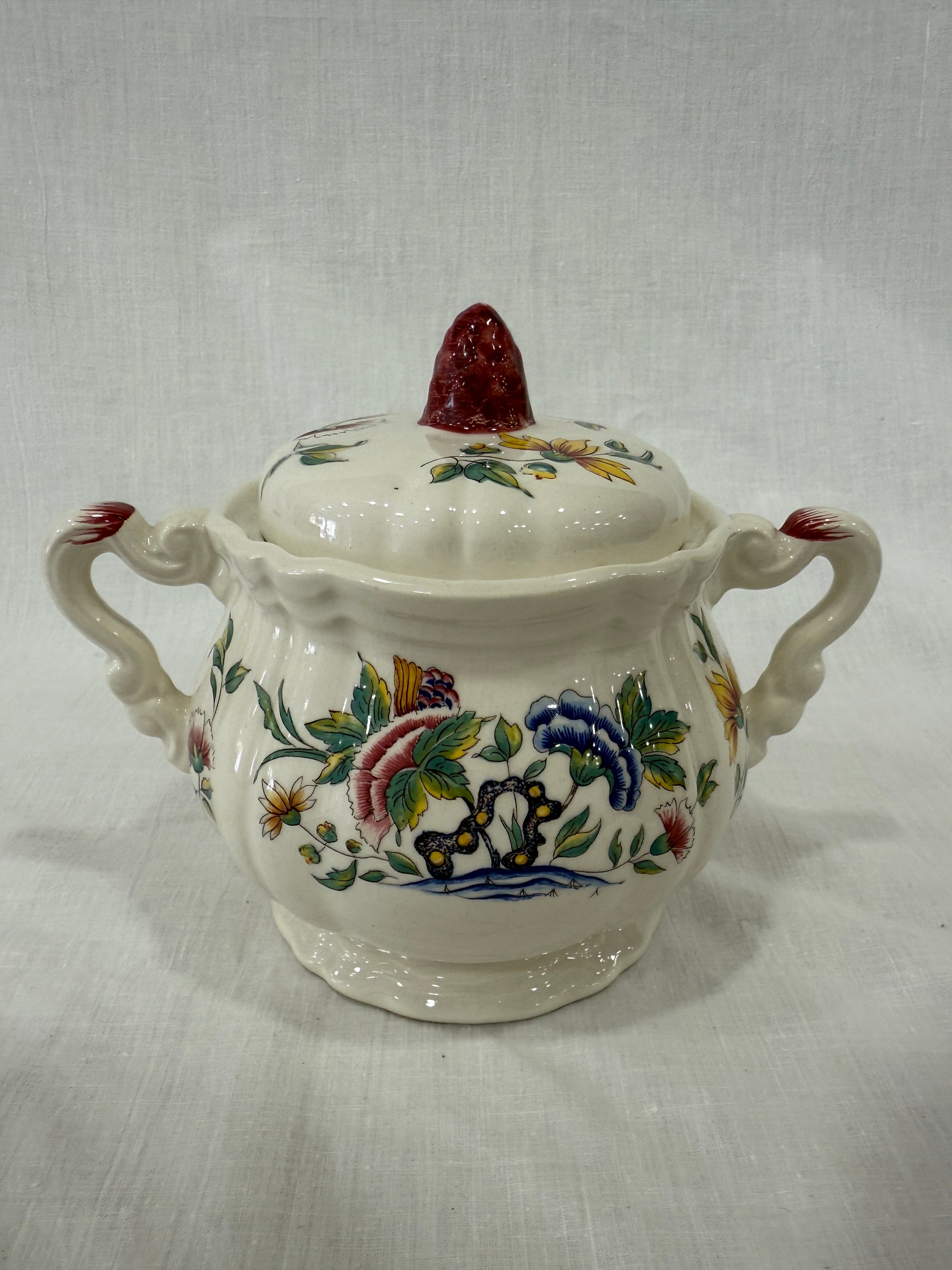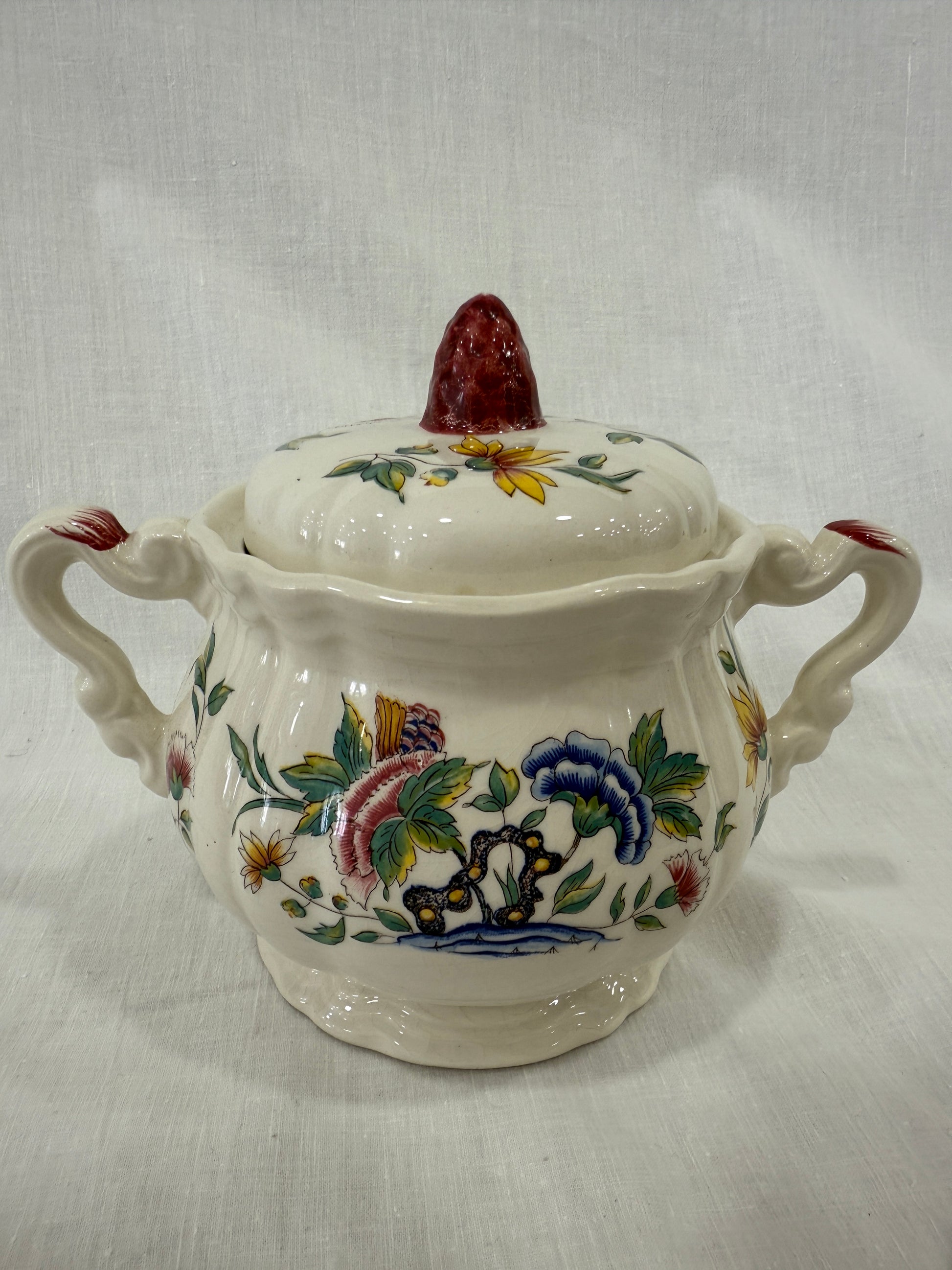 Precioso azucarero antiguo modelo Rouen de la reconocida casa francesa Sarreguemines. Decorado con motivos florales en tonos vivos sobre fondo blanco, este diseño evoca el encanto de la porcelana tradicional francesa. En buen estado de conservación, puede mostrar pequeñas propias del paso del tiempo. Por favor, revise bien las fotografías, ya que son parte importante de la descripción.