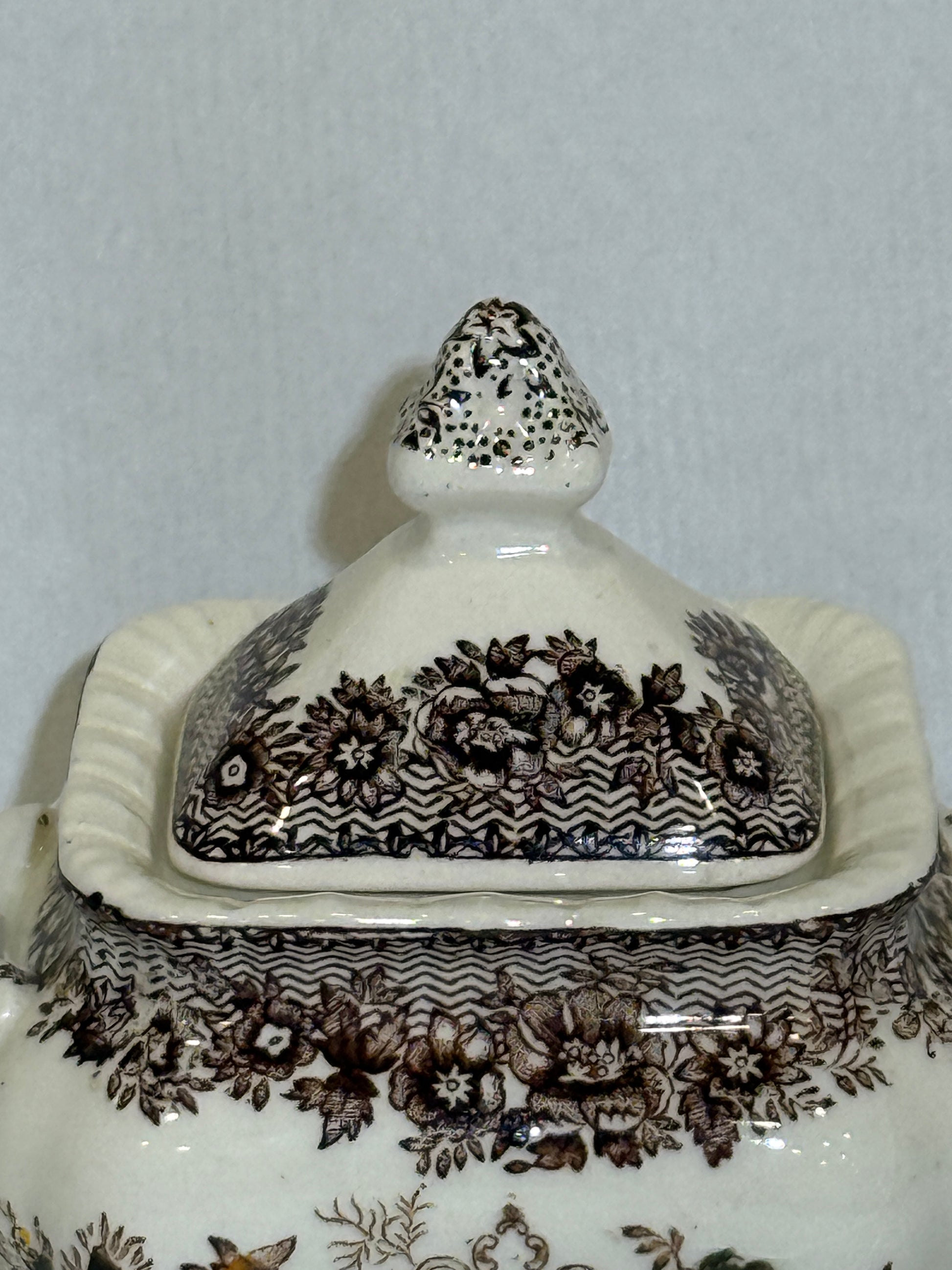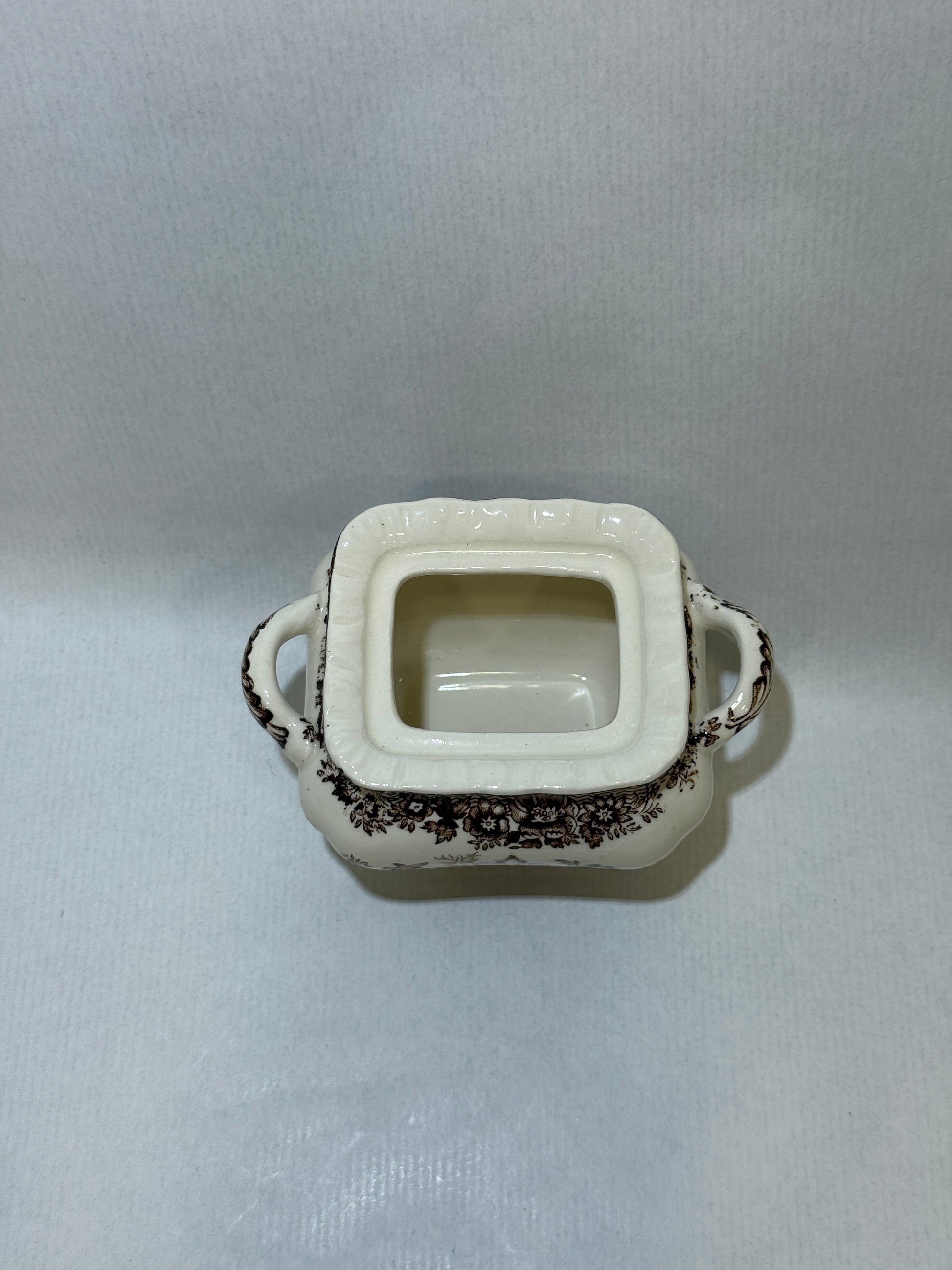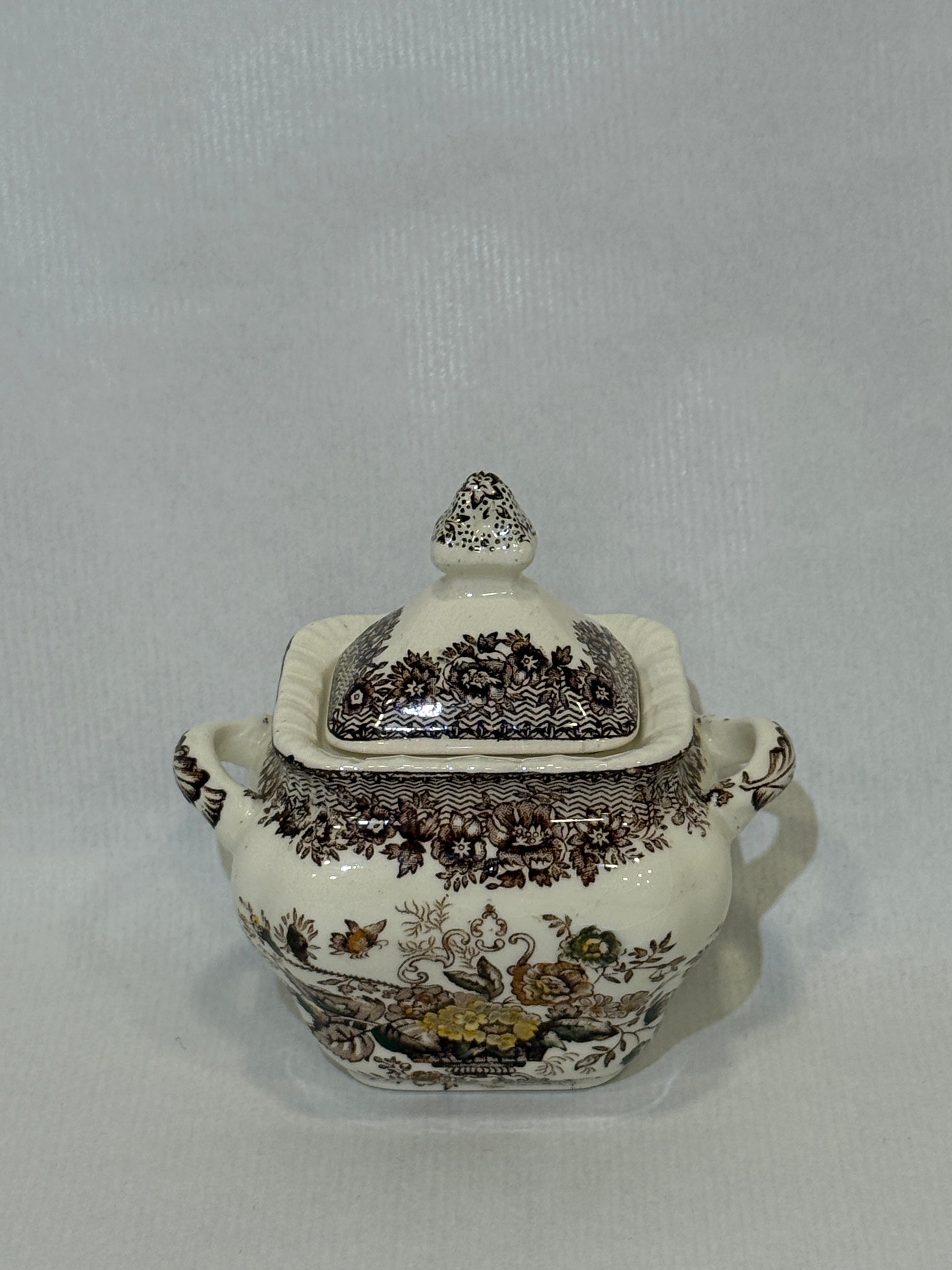 Este encantador azucarero de cerámica inglesa, perteneciente a la prestigiosa firma Mason’s Patent Ironstone, forma parte del elegante patrón Ascot. Decorado con un delicado estampado floral en tonos marrones, ocres y verdes sobre fondo marfil, es una pieza que refleja el refinado gusto victoriano y el saber hacer de la loza inglesa del siglo XX. En buen estado de conservación. Por favor, revise bien las fotografías, ya que son parte importante de la descripción.