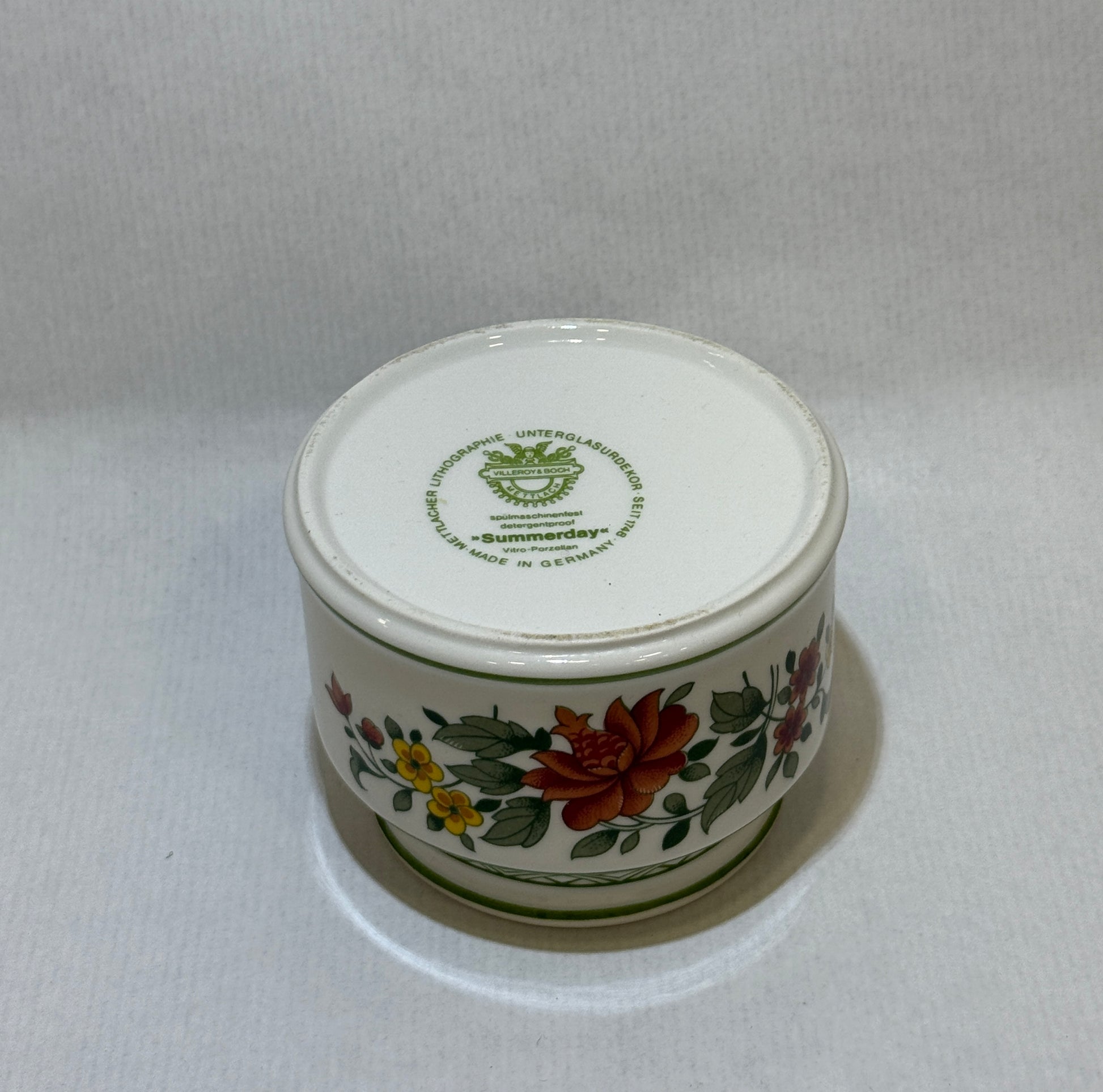 Encantador azucarero de porcelana perteneciente a la icónica colección Summerday de Villeroy & Boch, producida en Alemania. Decorado con un vibrante motivo floral en tonos rojos, amarillos y verdes, evoca la calidez de los veranos en el campo y el encanto de las cocinas de antes. Una pieza ideal tanto para completar tu vajilla Summerday como para añadir un toque vintage con historia a tu hogar. En perfecto estado de conservación. Por favor, revise bien las fotografías, ya que son parte importante de la descripción.