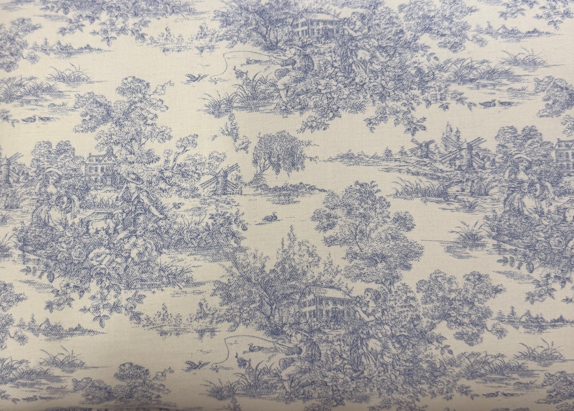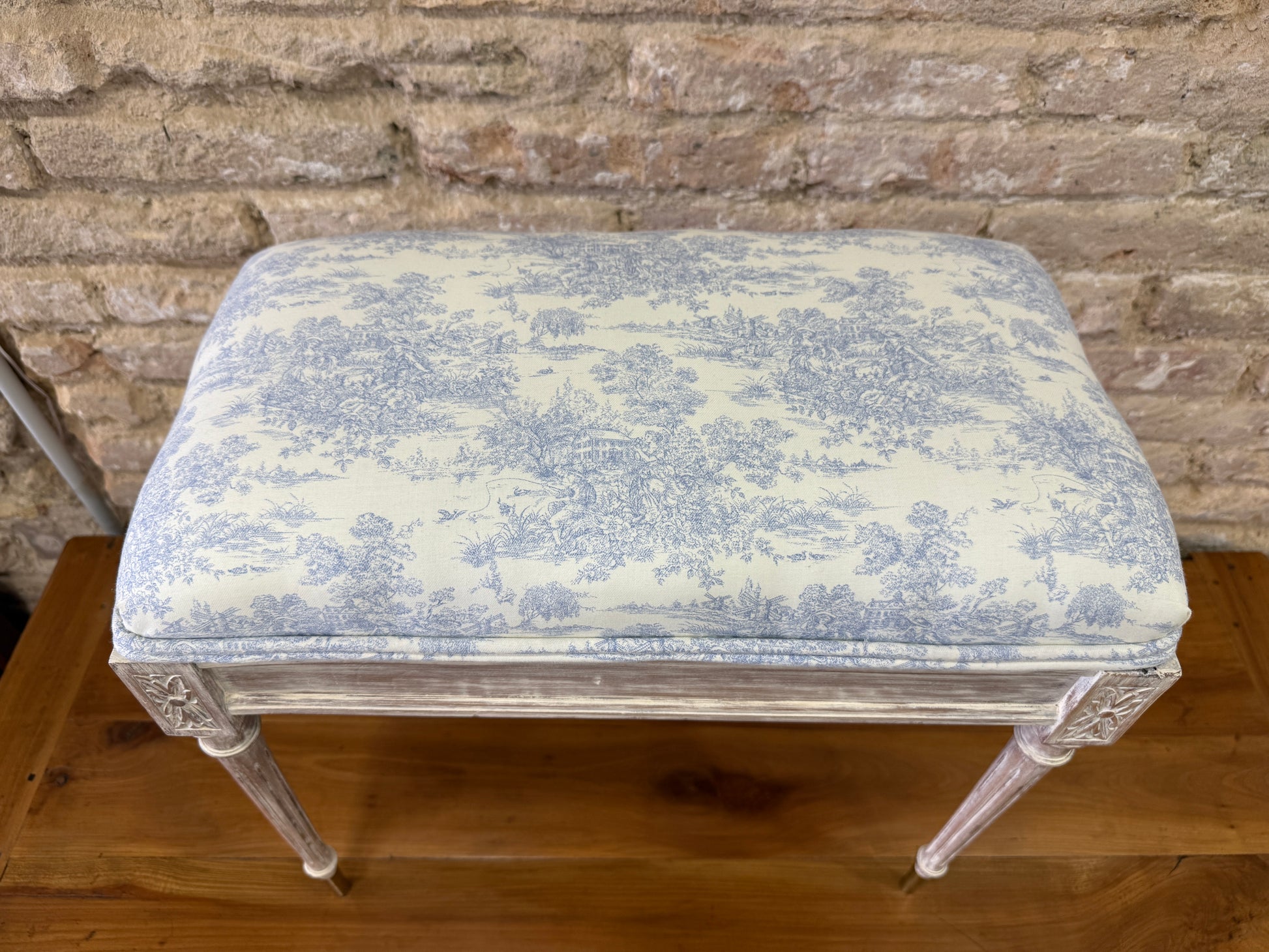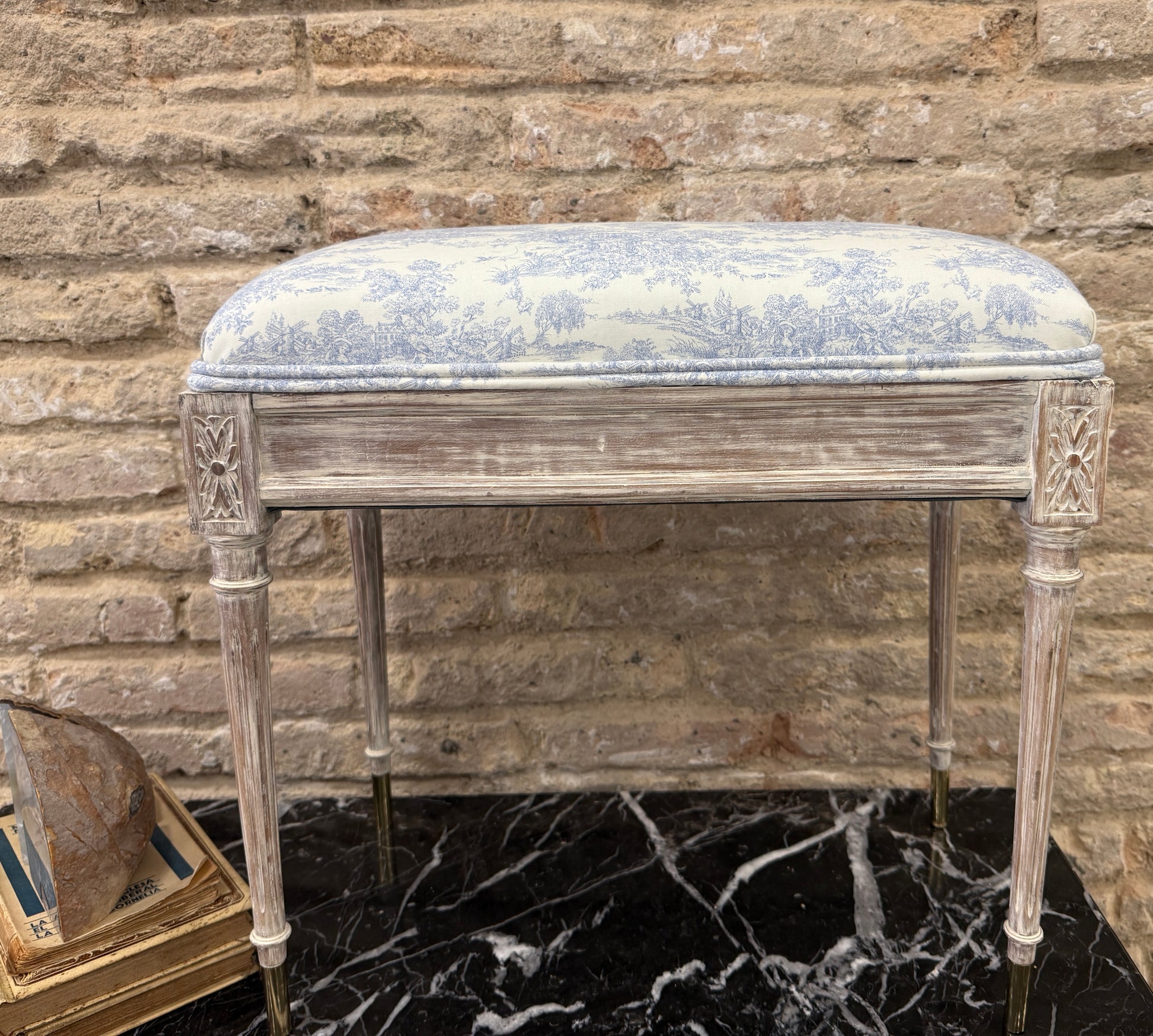 Banqueta única, elaborada a partir de patas antiguas estilo Luis XVI en madera tallada con delicados motivos florales y patas acanaladas. Acabado decapado artesanal en blanco envejecido y detalles de bronce. Tapizado nuevo con una preciosa tela 100% algodón de toile de jouy azul, con estampado clásico francés.
