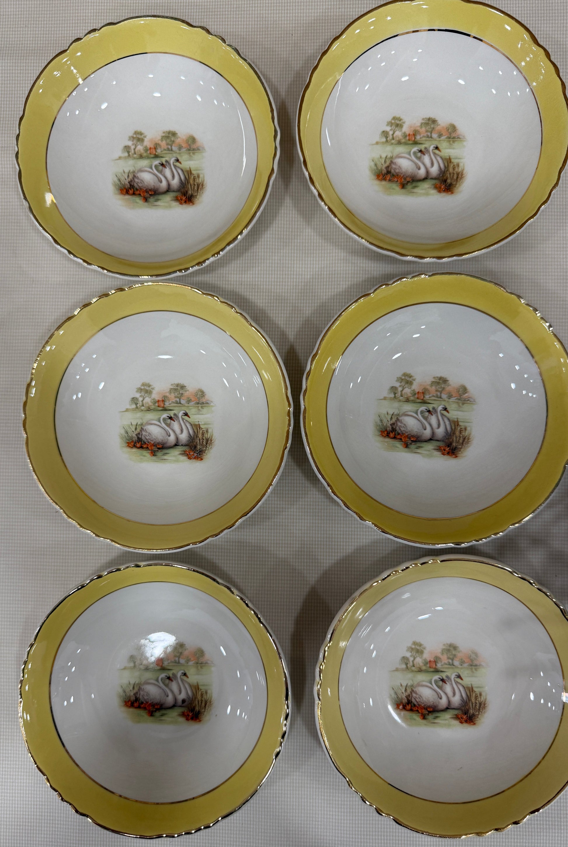 Encantadores bowls antiguos de porcelana francesa Moulin des Loups (Orchies), pertenecientes al modelo Old Orchies, decorados con una delicada escena de cisnes en tonos suaves. Presentan ala amarilla y un elegante filo dorado que realza su diseño clásico y romántico. Muy buen estado de conservación. Por favor, revise bien las fotografías, ya que son parte importante de la descripción. 5 unidades disponibles