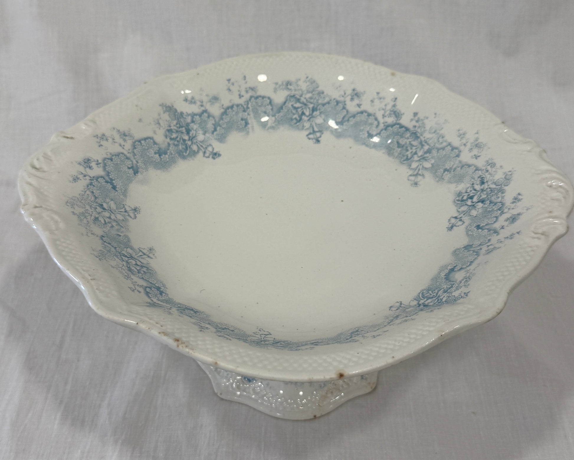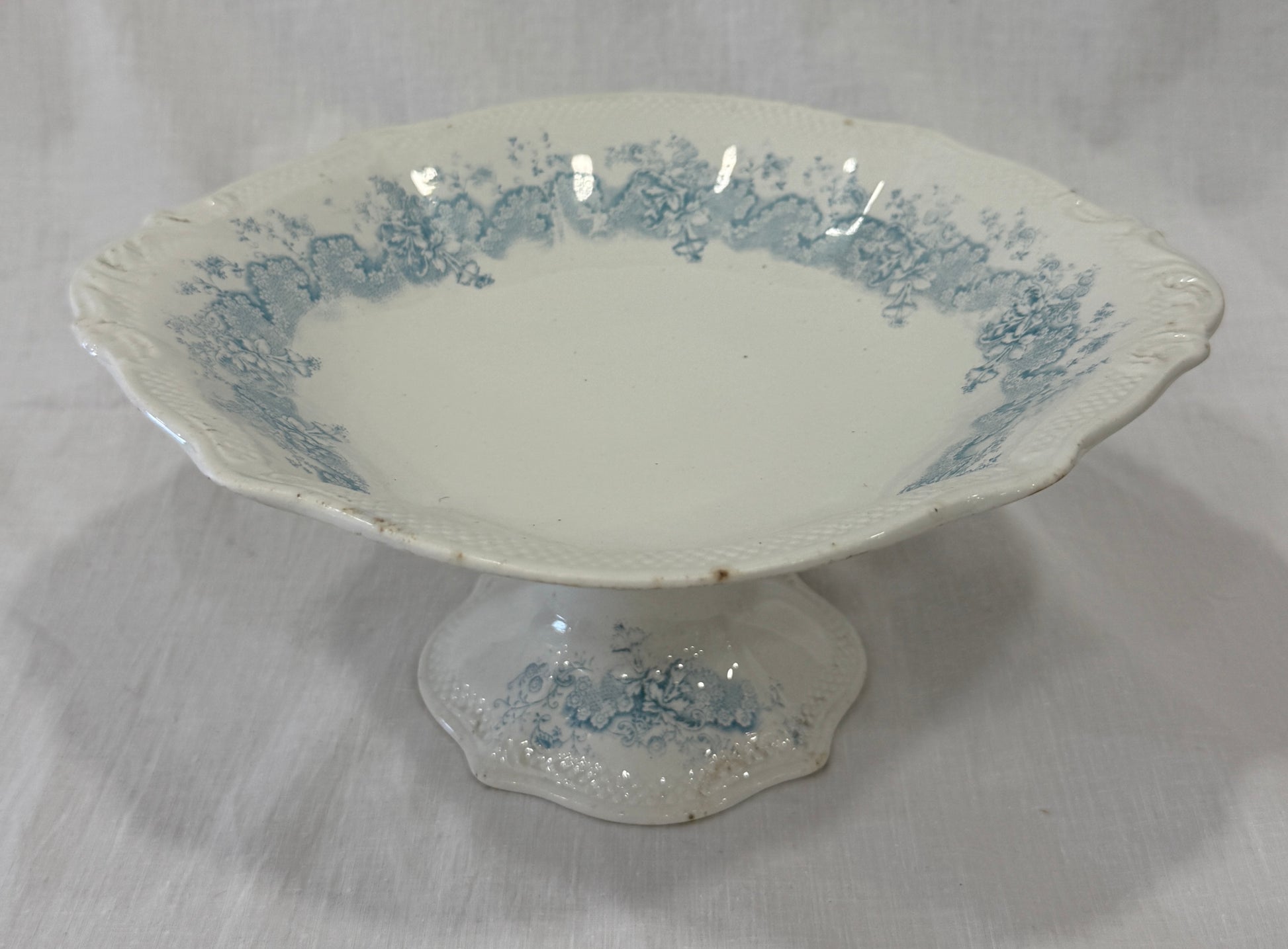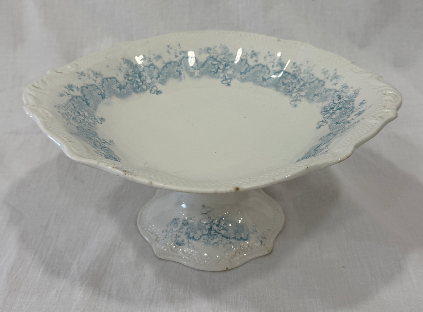 Delicado compotier de loza inglesa fabricado por Grindley (England), con un precioso motivo floral en azul aplicado mediante la técnica de transferware. Su silueta elevada, borde festoneado y pie decorado lo convierten en una pieza especial para servir dulces, frutas o como centro de mesa con encanto. Fabricado entre 1880 y 1910, este compotier se encuentra en buen estado general, con el carácter propio de las piezas antiguas. Presenta un pequeño chip visible en la base (ver fotografía), que no afecta a su estabilidad ni a su valor decorativo. Por favor, revise bien las fotografías, ya que son parte importante de la descripción.