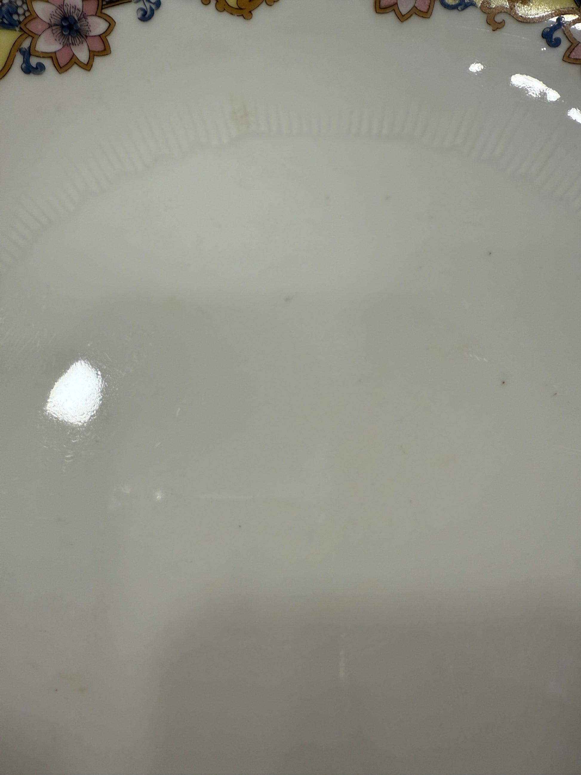 Delicado compotier de porcelana francesa de Limoges, decorado con una elegante cenefa floral en tonos rosa, azul cobalto y amarillo, realzada con bordes dorados aplicados a mano. Su forma elevada y refinada lo convierte en una pieza ideal tanto para presentar fruta o repostería como para destacar en cualquier rincón decorativo. En la base figura el sello en forma de cinta con la inscripción “Limoges France”, utilizado entre 1920 y 1950 por talleres decoradores independientes de la región. Estos talleres adquirían porcelana blanca de alta calidad producida localmente y aplicaban a mano sus propios motivos decorativos, dando lugar a piezas únicas con gran valor estético y coleccionista. En buen estado de conservación. Por favor, revise bien las fotografías, ya que son parte importante de la descripción.