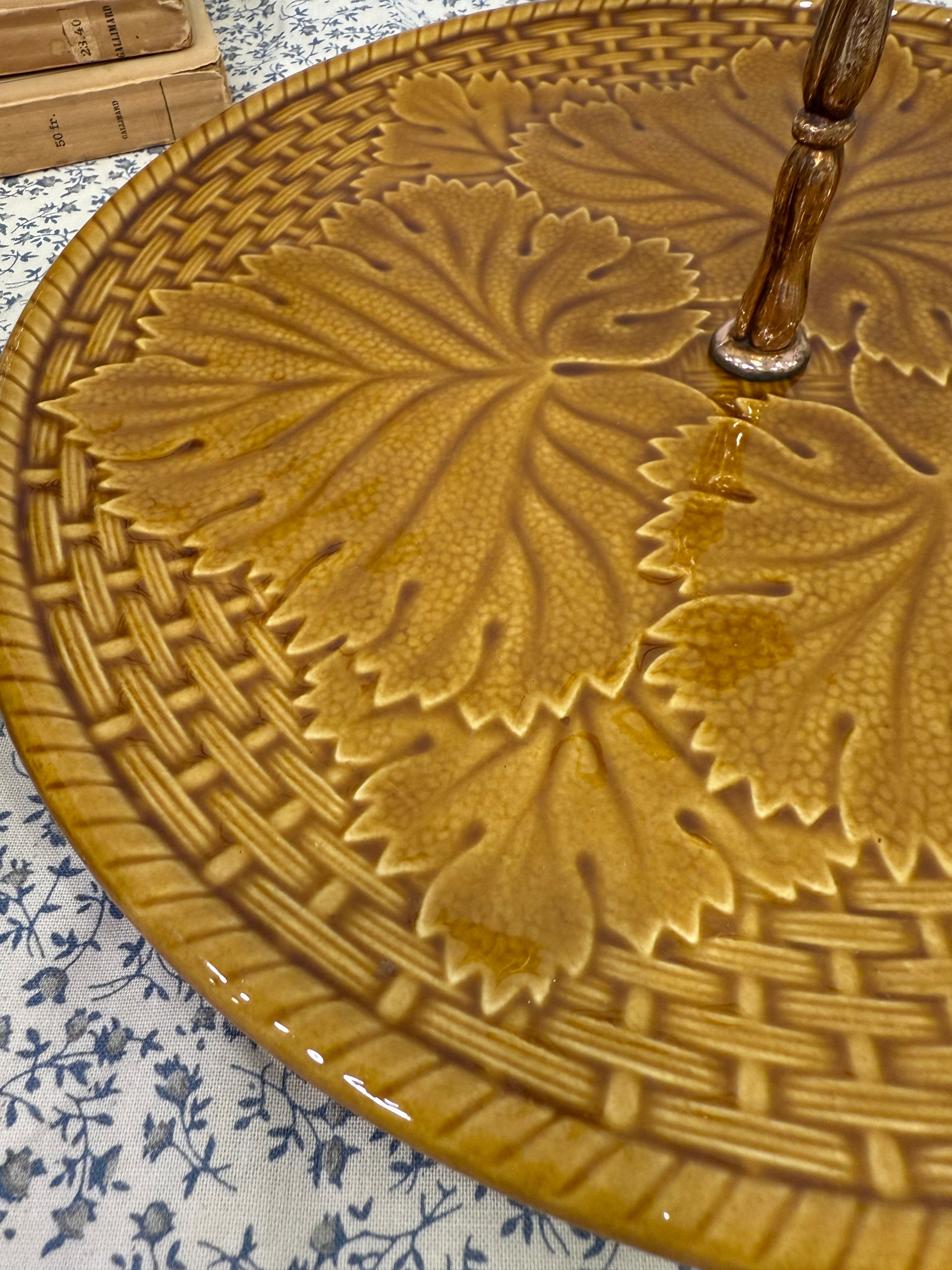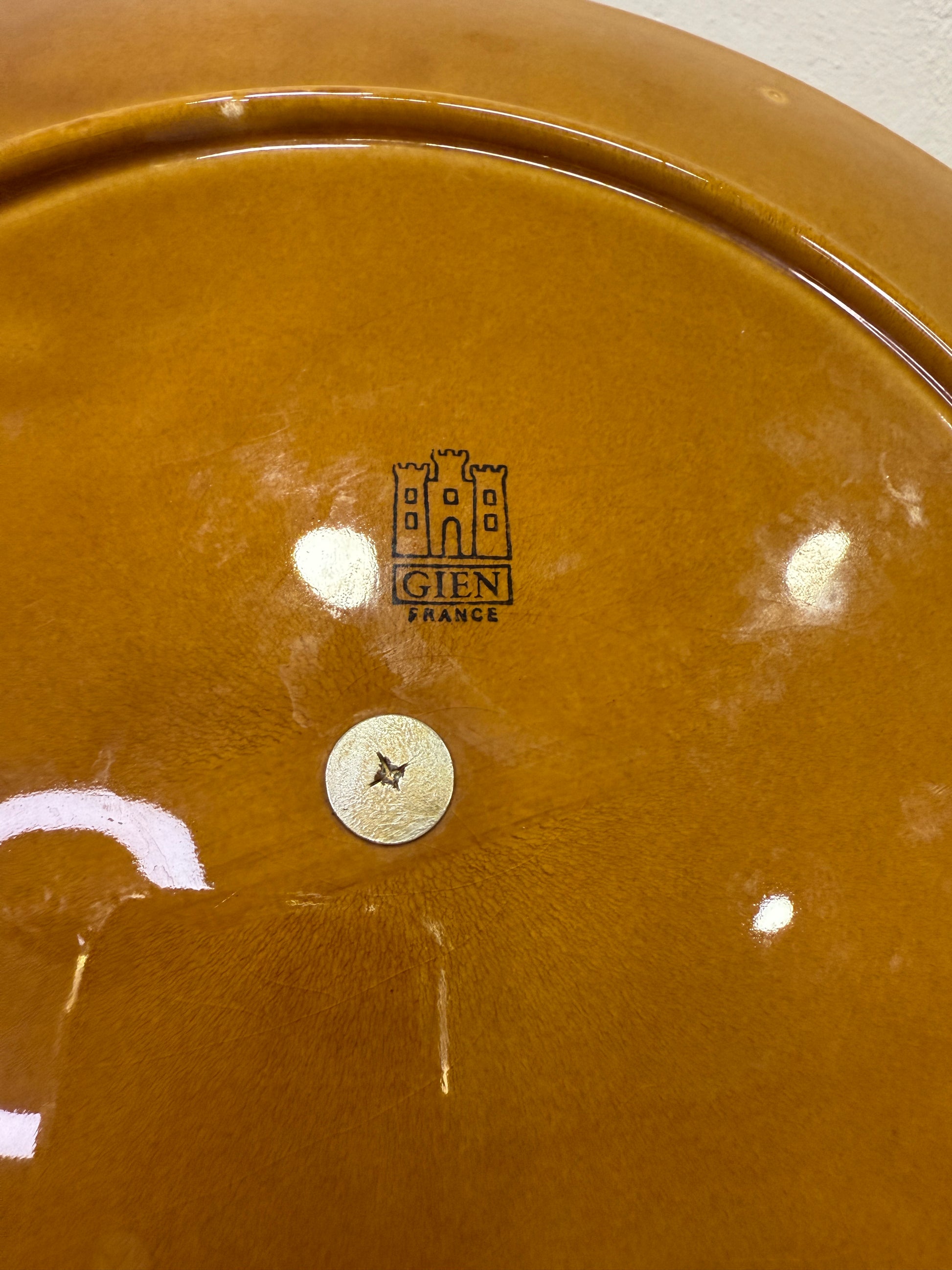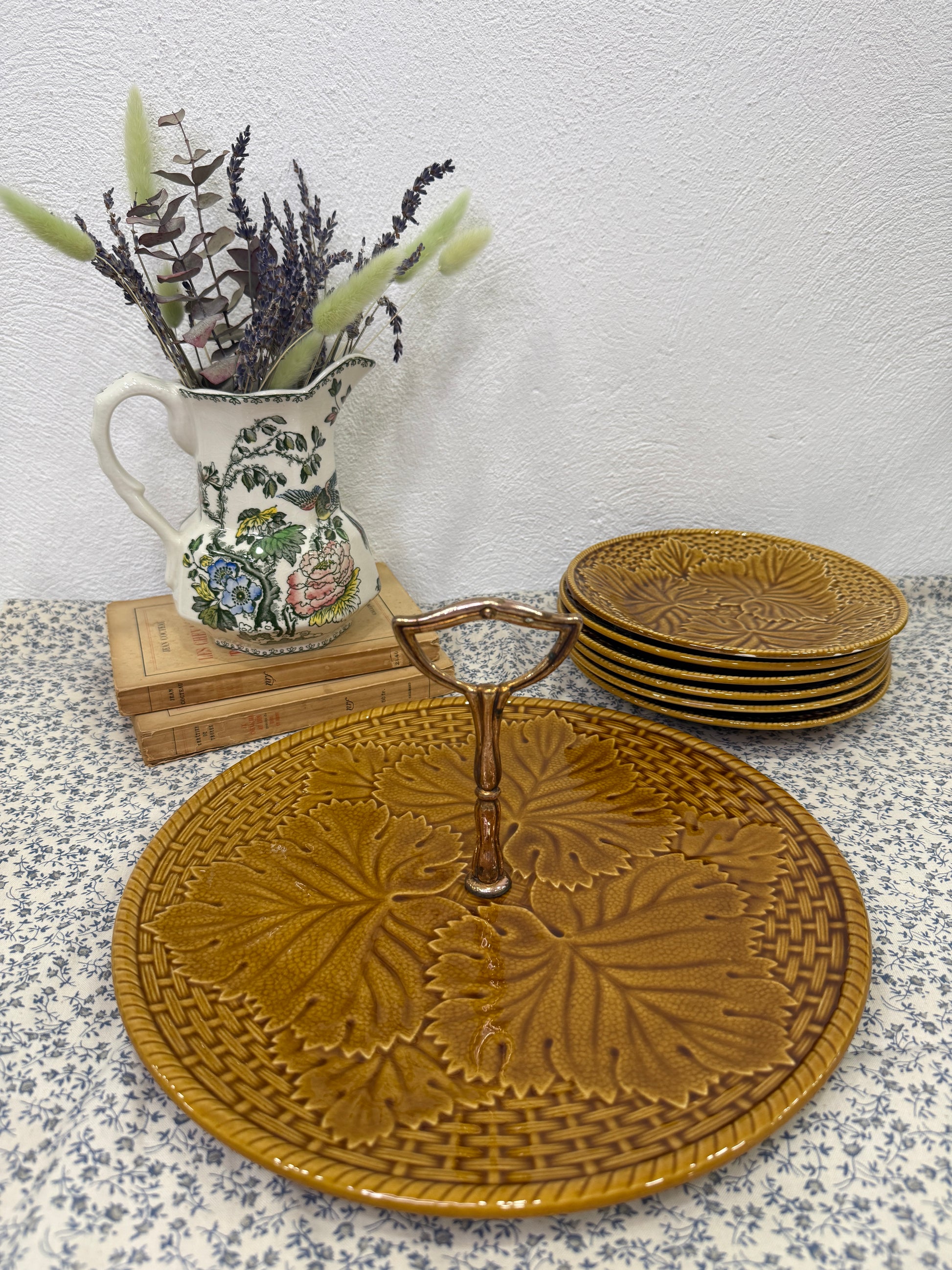 Conjunto vintage original de la prestigiosa manufactura francesa GIEN, elaborado en cerámica vidriada en tono miel y decorado con un delicado relieve de hojas sobre fondo efecto cestería. Una pieza de mediados del siglo XX, muy típica del estilo francés rústico y cálido, ideal para presentar quesos, dulces, bollería o aperitivos con un toque de elegancia clásica. Su presencia en la mesa resulta especialmente decorativa: combina funcionalidad con estética, y aporta una nota de calidez a cocinas, comedores y mesas de celebración.