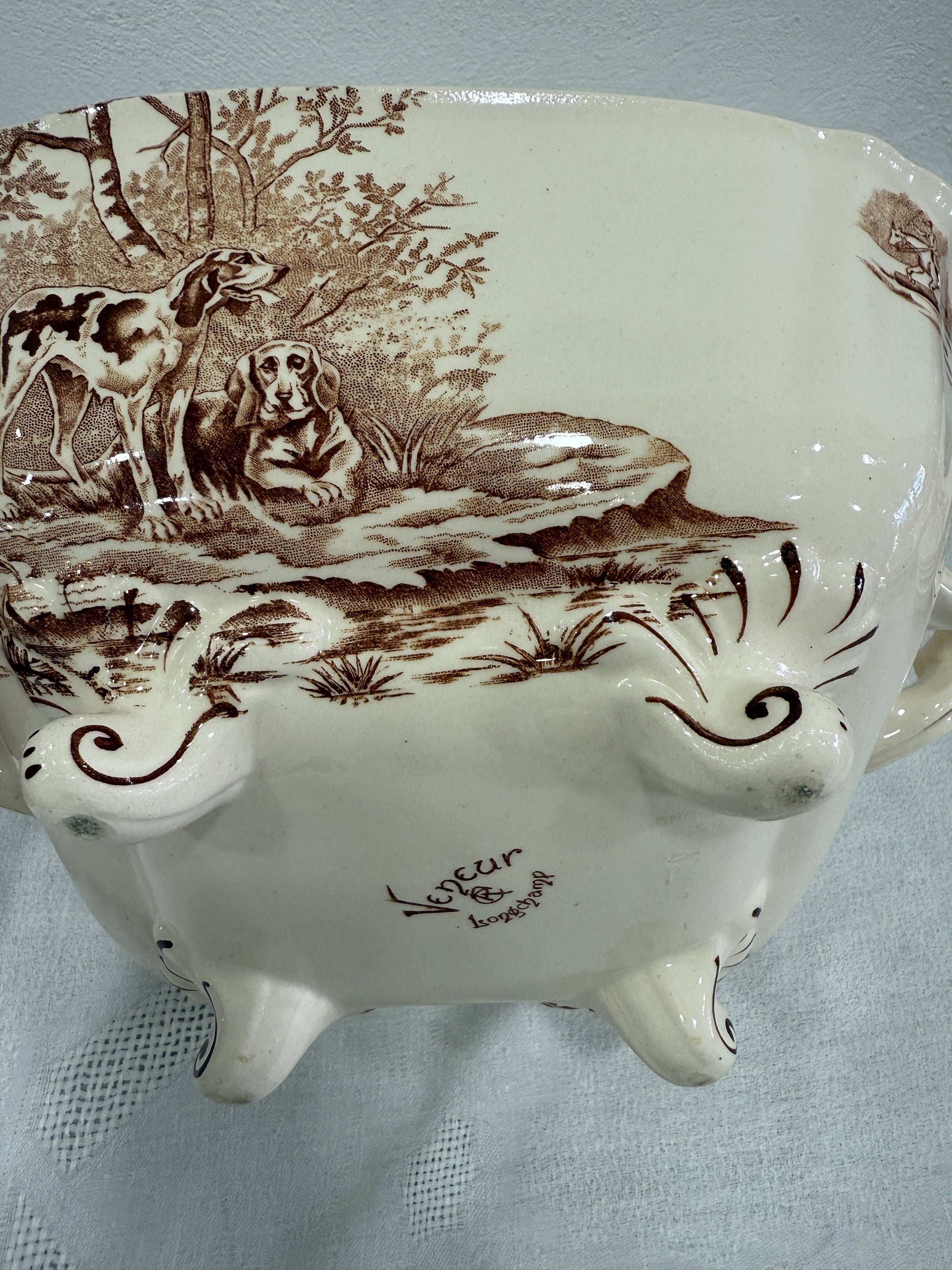 La pieza, de forma cuadrada con asas y patas torneadas, presenta una exquisita decoración en tonos sepia: perros de caza en primer plano y, al fondo, un jinete a caballo con sabuesos. Una escena cinegética muy apreciada en la Francia de finales del XIX.