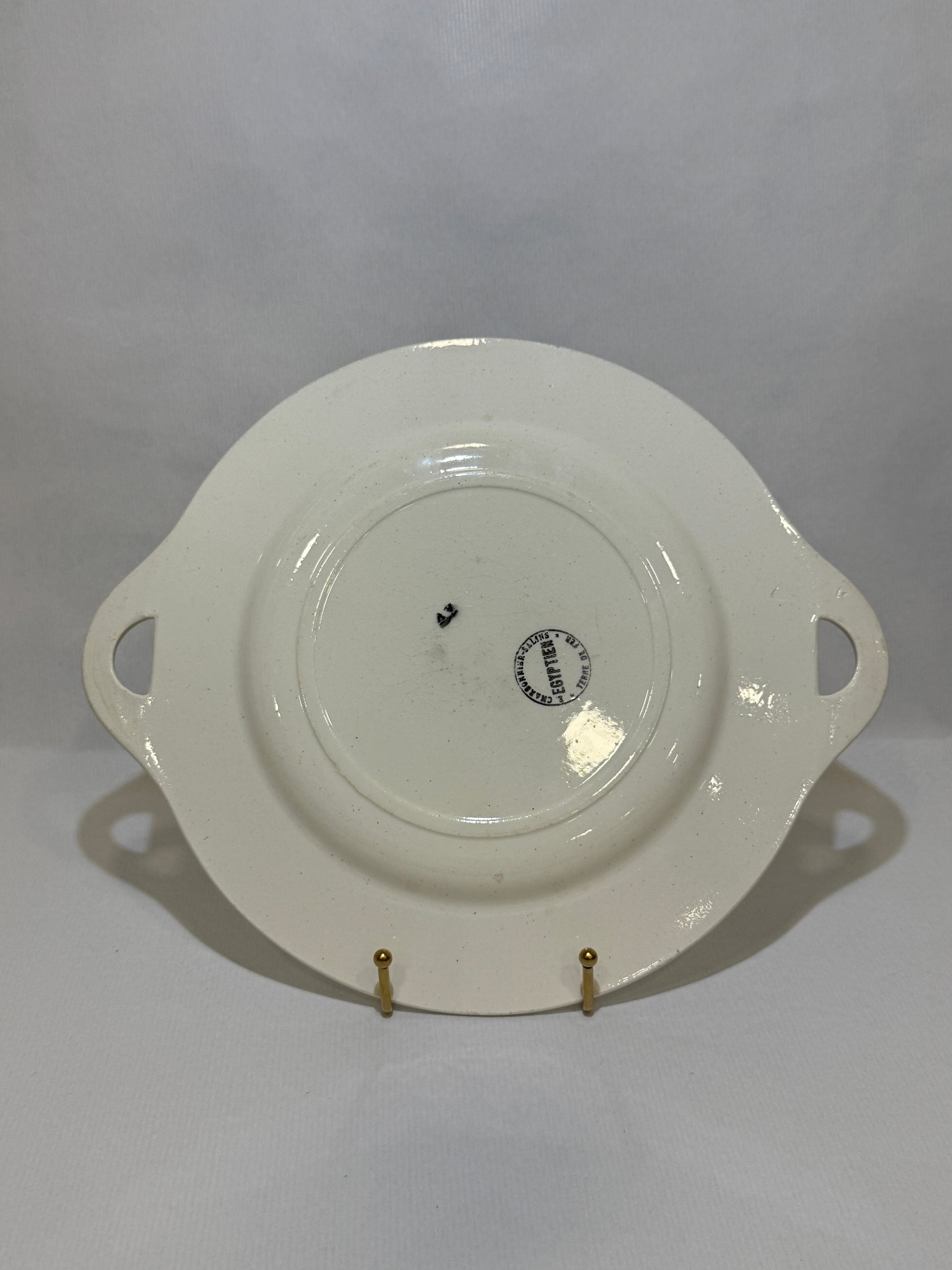 Pieza única de loza antigua francesa del modelo Egyptien, fabricada por la reconocida casa Salins-les-Bains a finales del siglo XIX o principios del XX (aprox. 1890–1920). Realizada en terre de fer (loza fina vitrificada), esta fuente o plato con asas destaca por su estética orientalista y su elegante decoración pintada a mano en tonos burdeos, verde y negro. Con un diseño estructural poco común, presenta dobles asas perforadas y detalles en relieve que realzan su carácter artesanal. Cada abanico pintado a mano aporta color y personalidad, convirtiendo esta pieza no solo en un objeto funcional, sino también en un elemento decorativo con historia. En muy buen estado de conservación. Por favor, revise bien las fotografías, ya que son parte importante de la descripción.