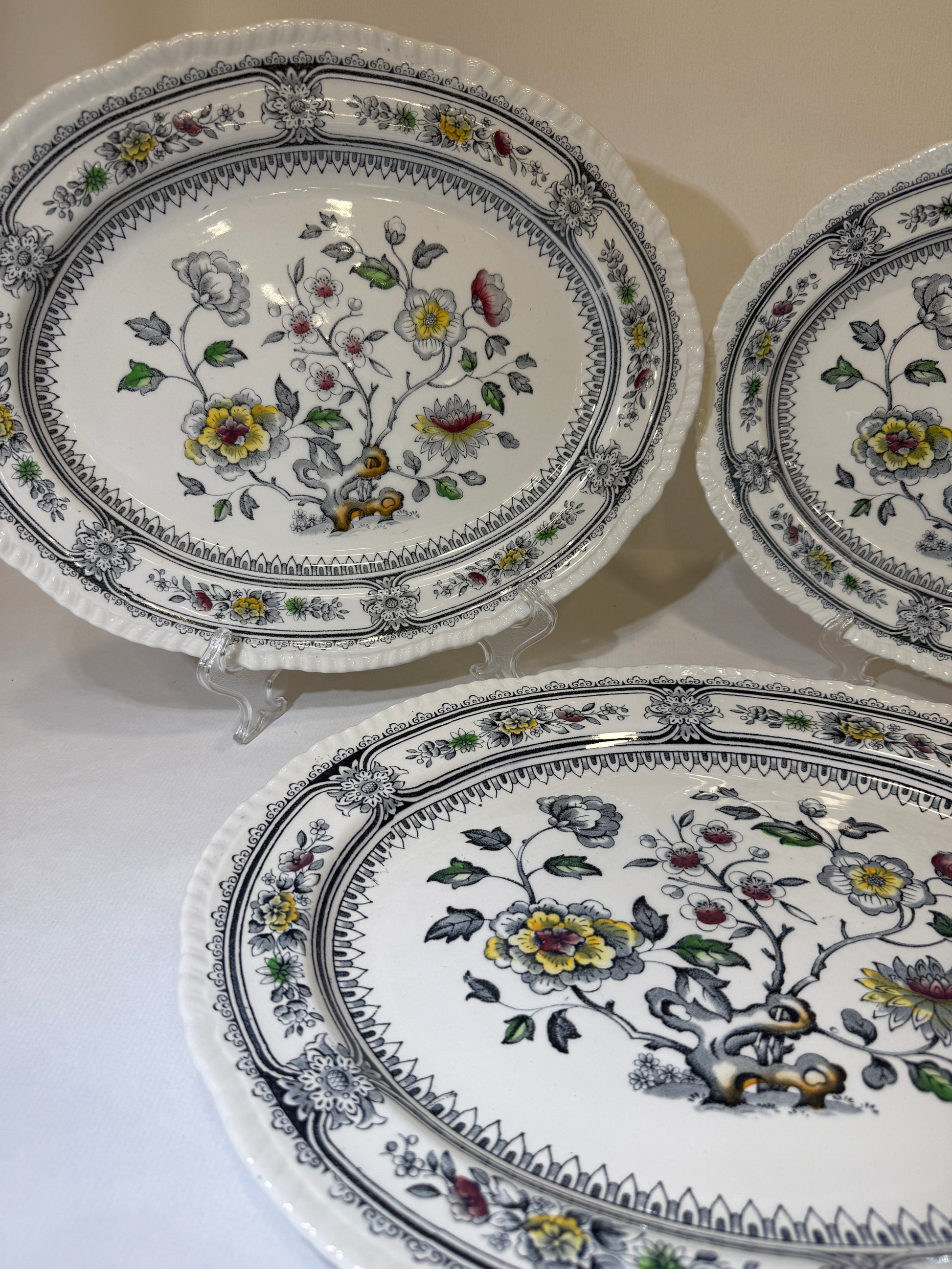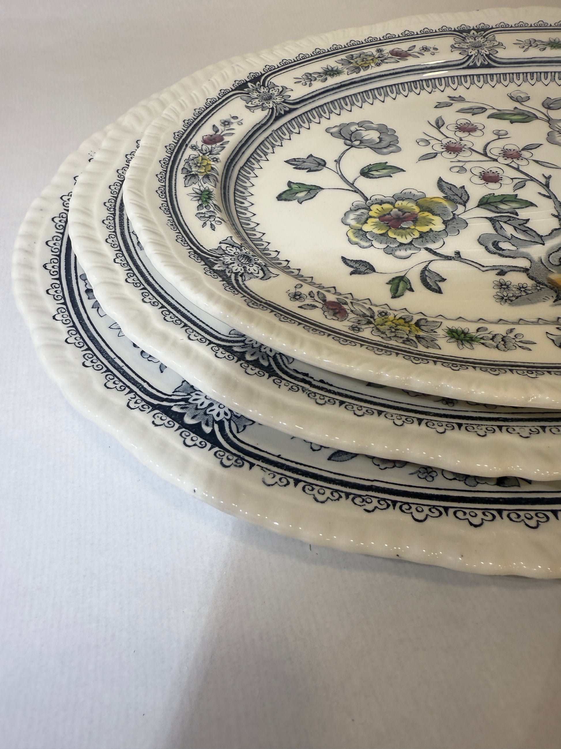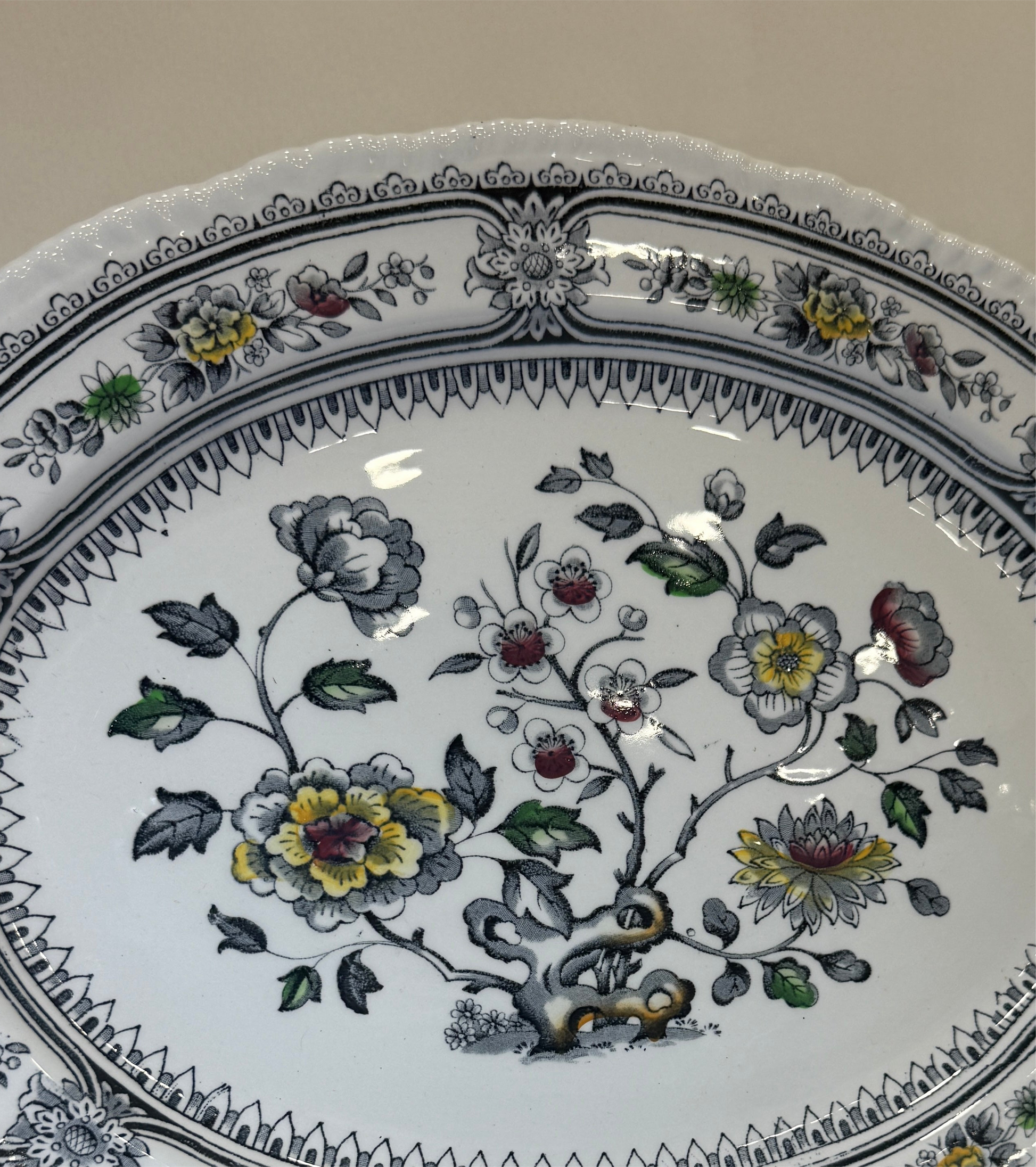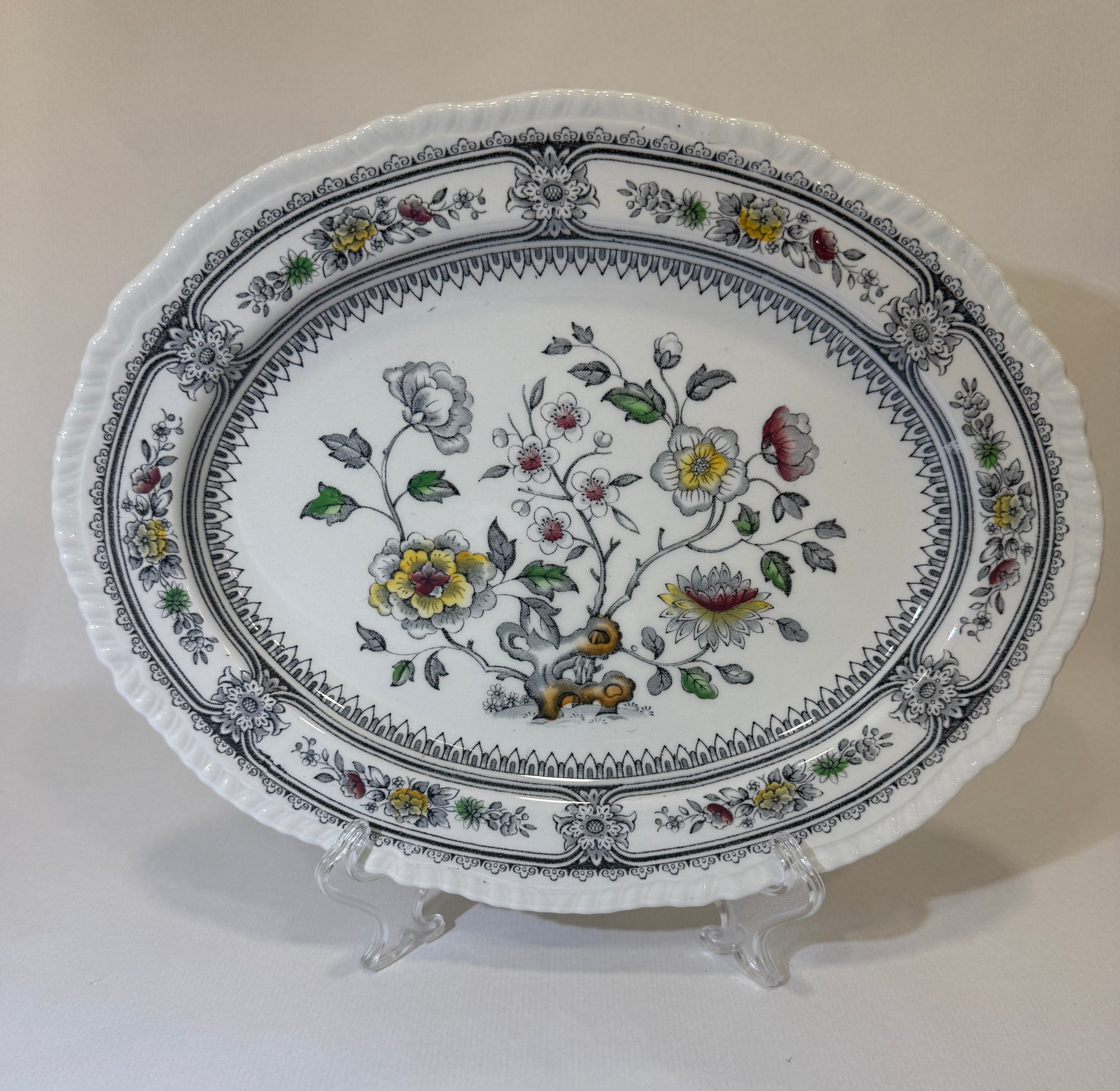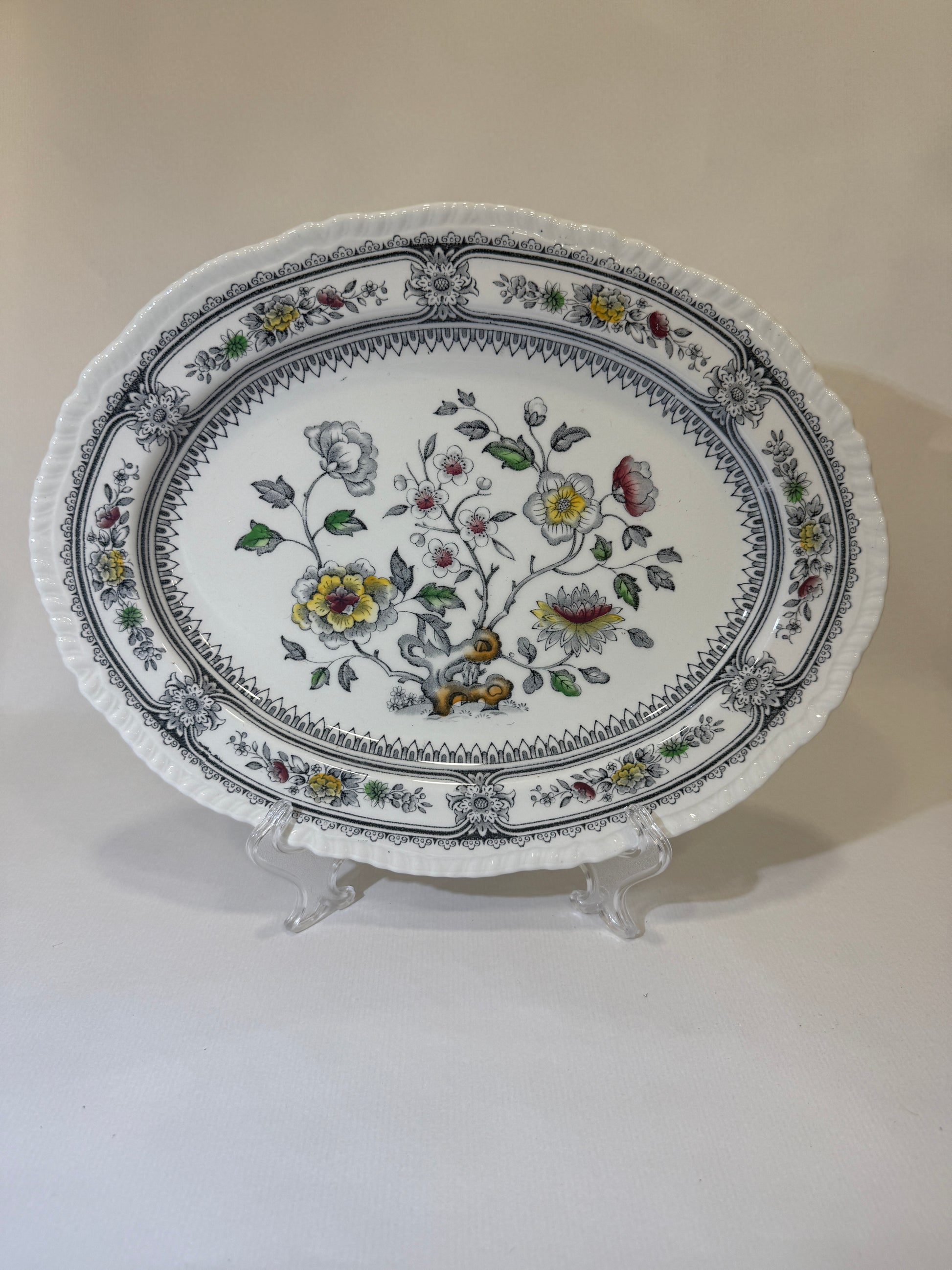 Elegante fuente de loza inglesa producida por la histórica firma Wood & Sons en Burslem, Staffordshire, durante las décadas de 1950–1960. Pertenece al clásico modelo “Dorset”, decorado con un delicado motivo floral en tonos grises, amarillos, verdes y rojos, típico del estilo inglés de mediados del siglo XX. La decoración está aplicada bajo el esmalte (pattern under the glaze), lo que asegura una excelente durabilidad frente al uso cotidiano, detergentes y productos ácidos. Su silueta ovalada, el relieve en el borde y el contraste cromático la convierten en una pieza ideal tanto para servir como para decorar. En perfecto estado de conservación. Por favor, revise bien las fotografías, ya que son parte importante de la descripción.
