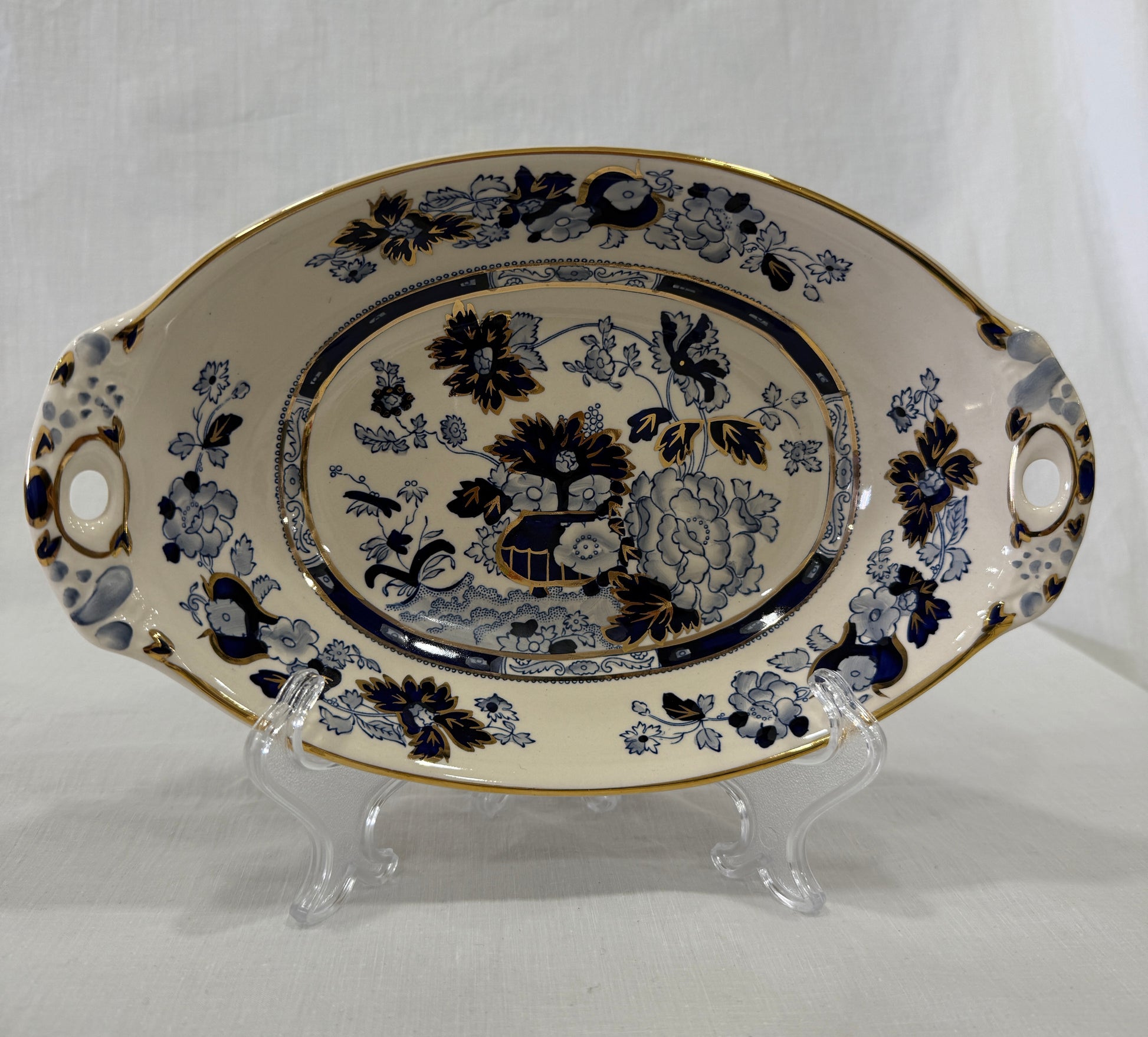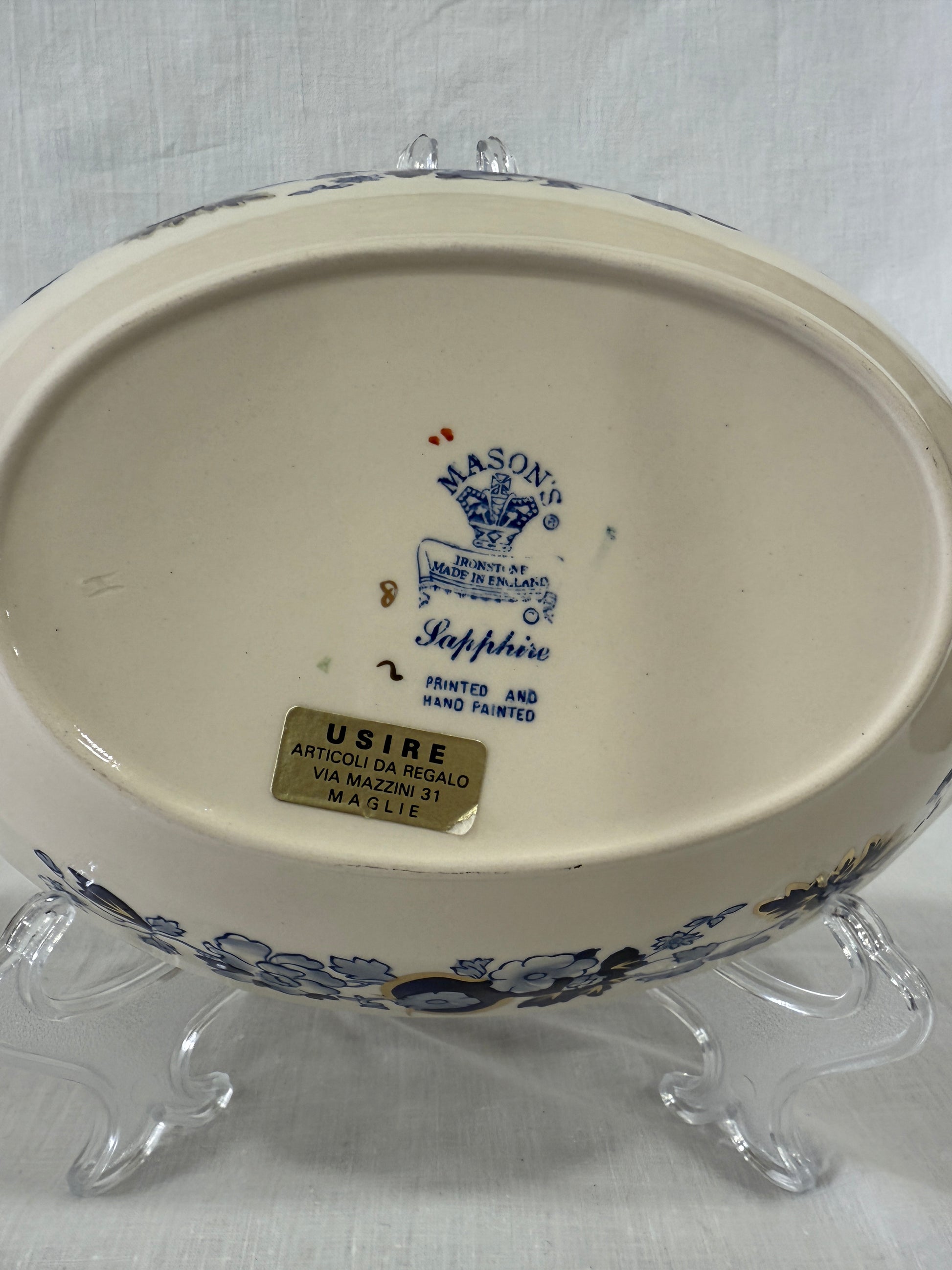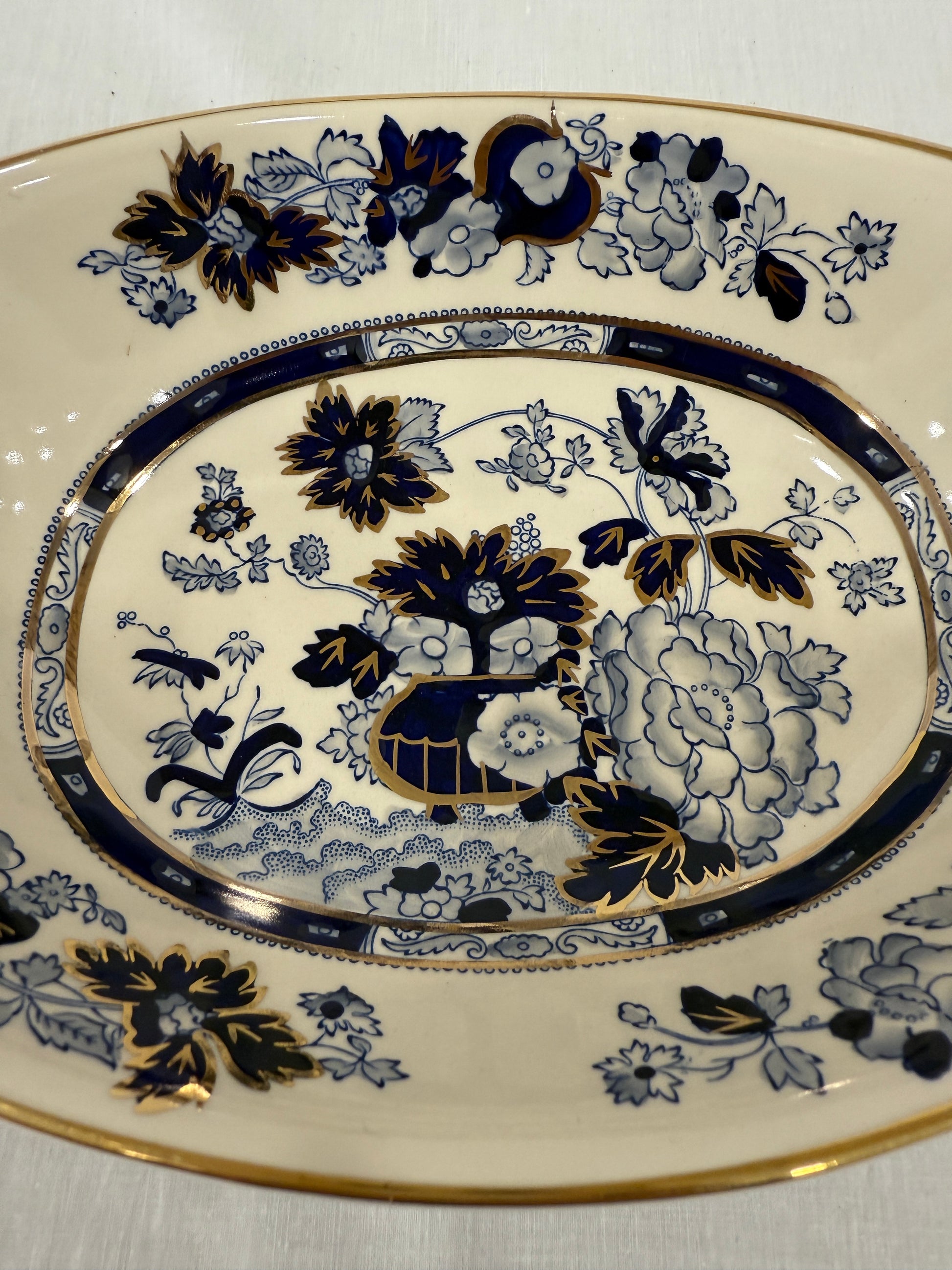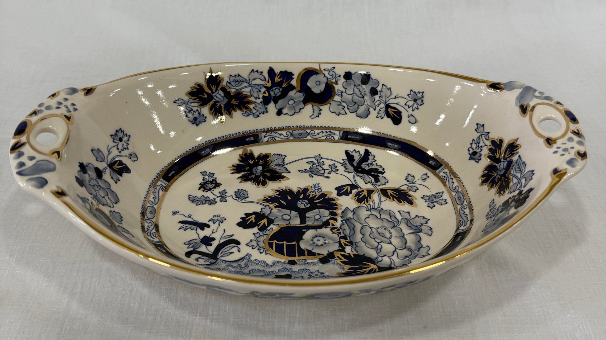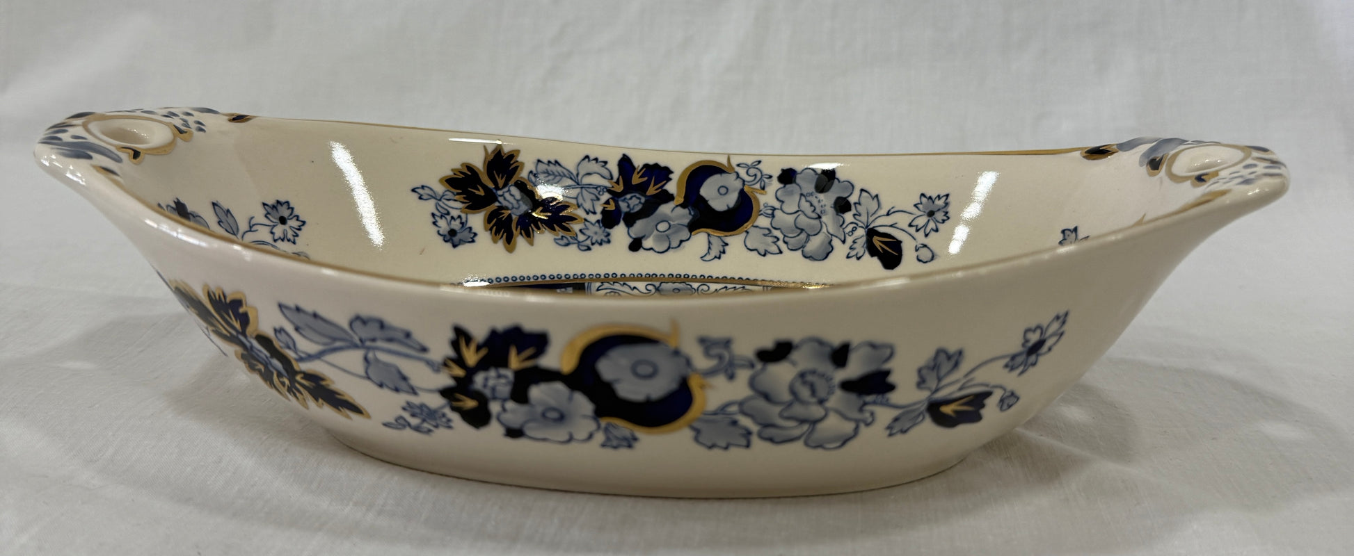 Fuente honda de loza inglesa Mason’s Ironstone, modelo Sapphire, una pieza elegante y sofisticada decorada con motivos florales de inspiración oriental en azul cobalto y detalles en pan de oro aplicados a mano. Su forma ovalada con asas perforadas y borde suavemente ondulado la convierten en una pieza tan decorativa como funcional. Fabricada en ironstone, una loza especialmente resistente, esta fuente combina técnicas industriales con acabados artesanales: está impresa y pintada a mano, lo que aporta un encanto único a cada ejemplar. Perfecta para servir con estilo en ocasiones especiales o como pieza decorativa en una vitrina o aparador. En perfecto estado de conservación. Por favor, revise bien las fotografías, ya que son parte importante de la descripción.