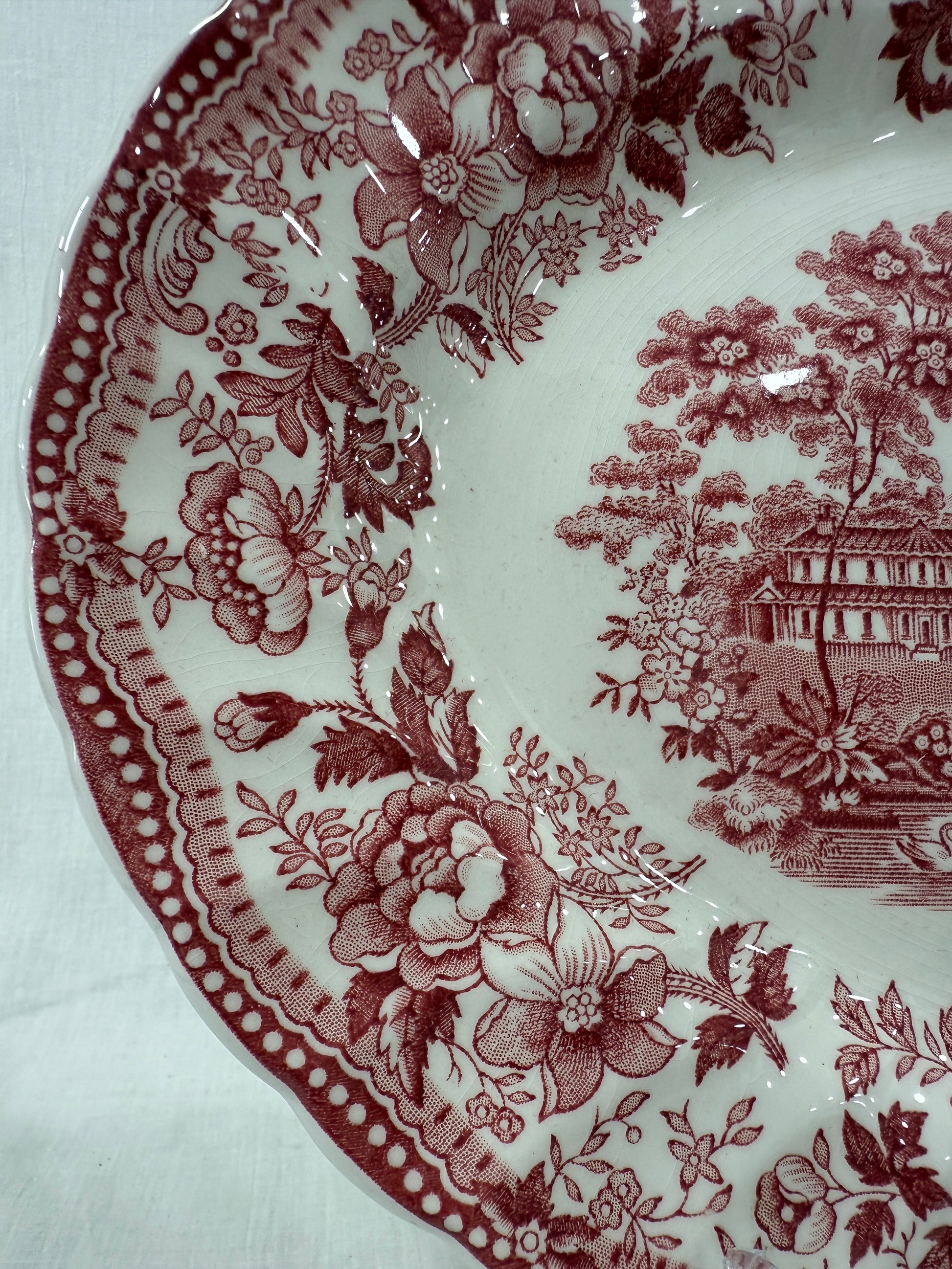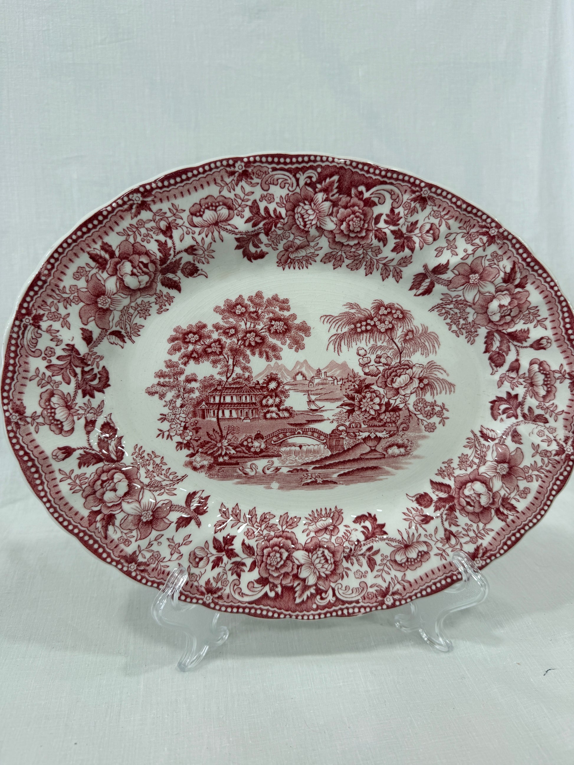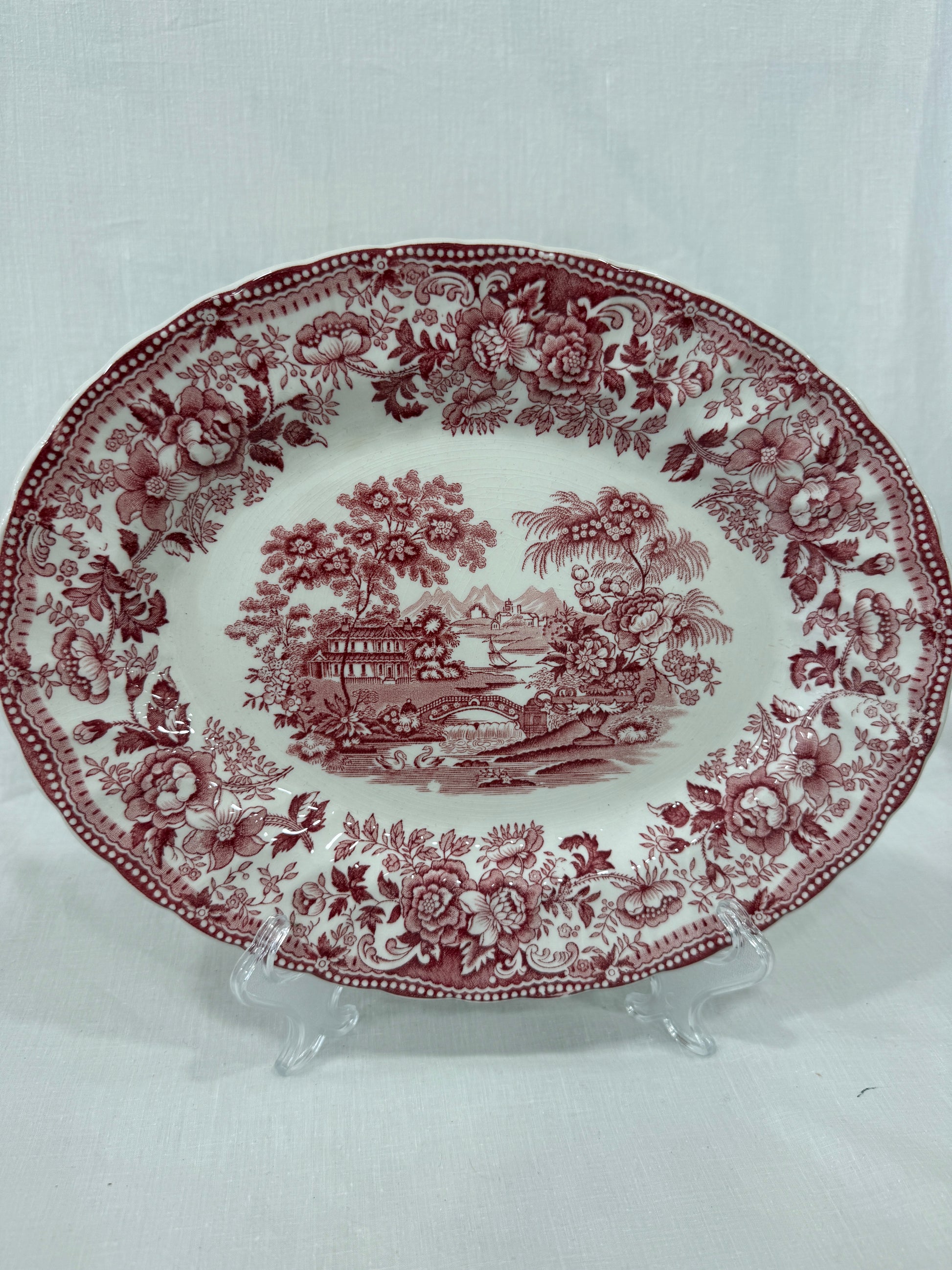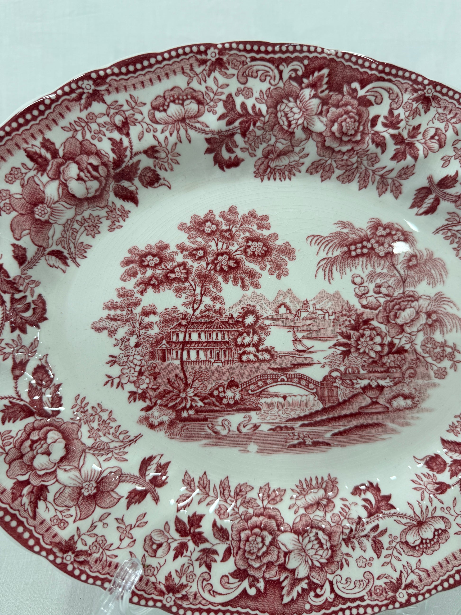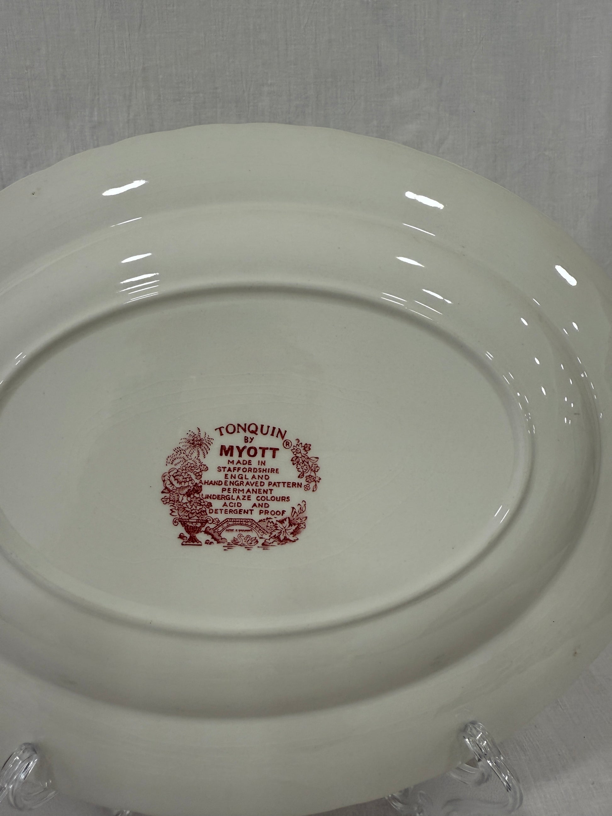 Fuente ovalada de loza inglesa, fabricada por Myott (Staffordshire) en Inglaterra, perteneciente al clásico modelo Tonquin. Decorada con un elaborado motivo de inspiración oriental en rojo burdeos (transferware), presenta un paisaje central rodeado por un borde floral impreso y grabado a mano, característico del estilo tradicional británico. Esta pieza fue producida en la década de 1980, durante la etapa final de la firma Myott, y destaca por su resistencia gracias a la loza tipo ironstone. En buen estado de conservación. Por favor, revise bien las fotografías, ya que son parte importante de la descripción.