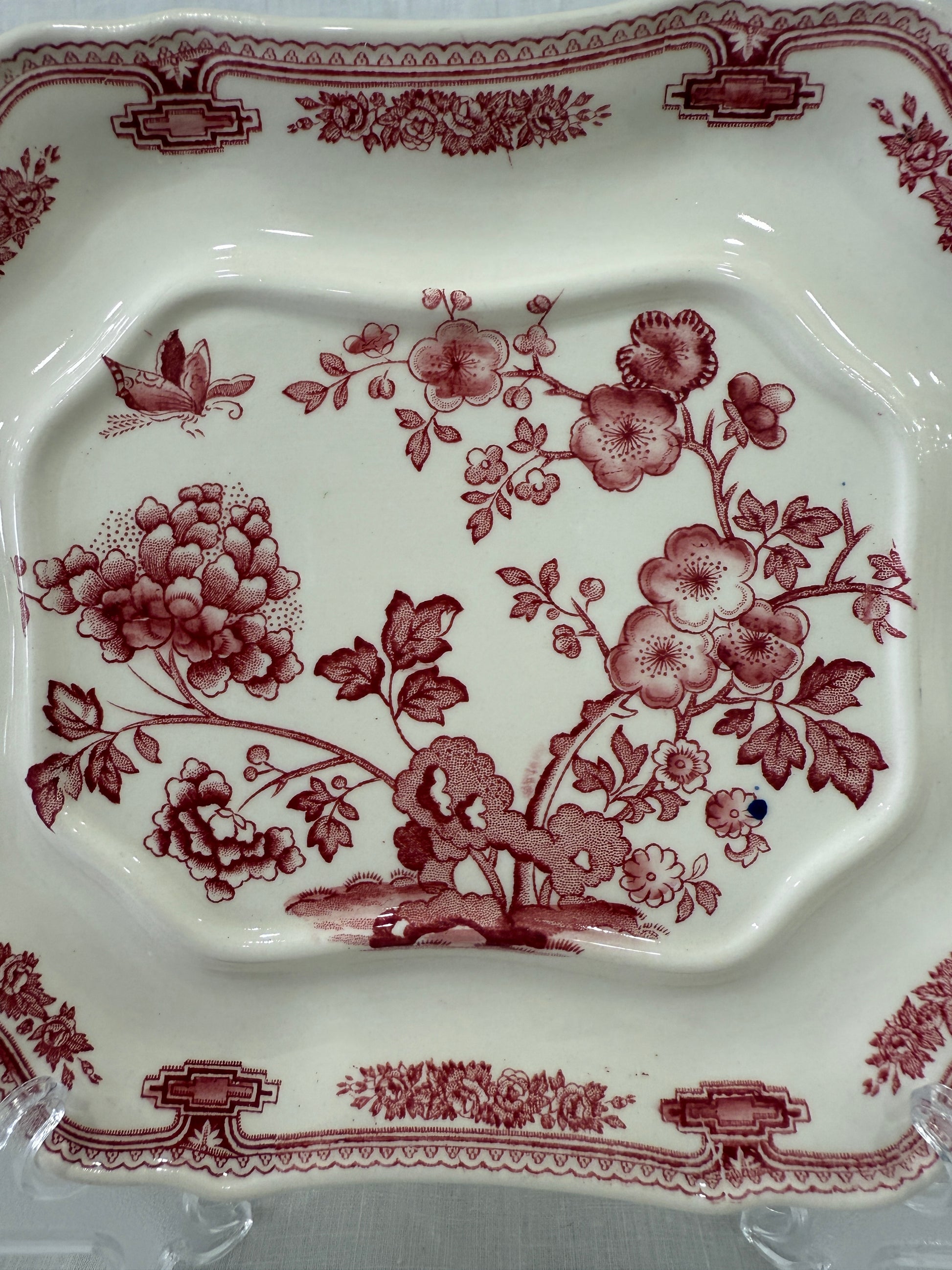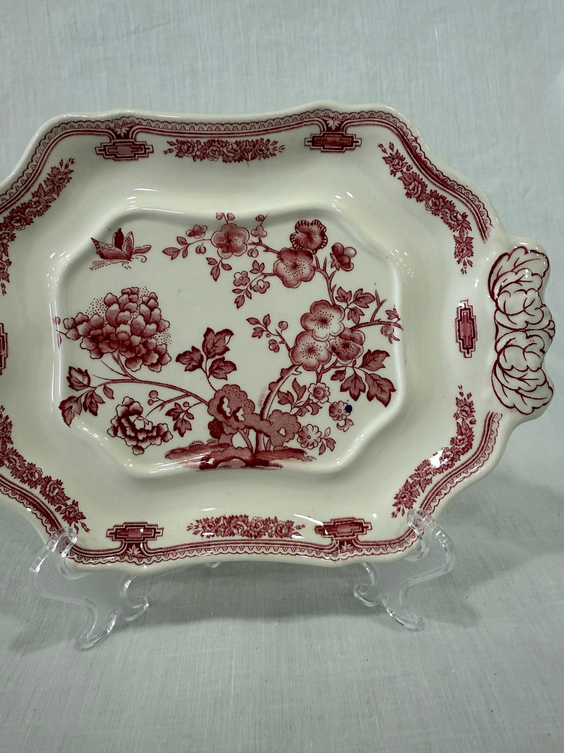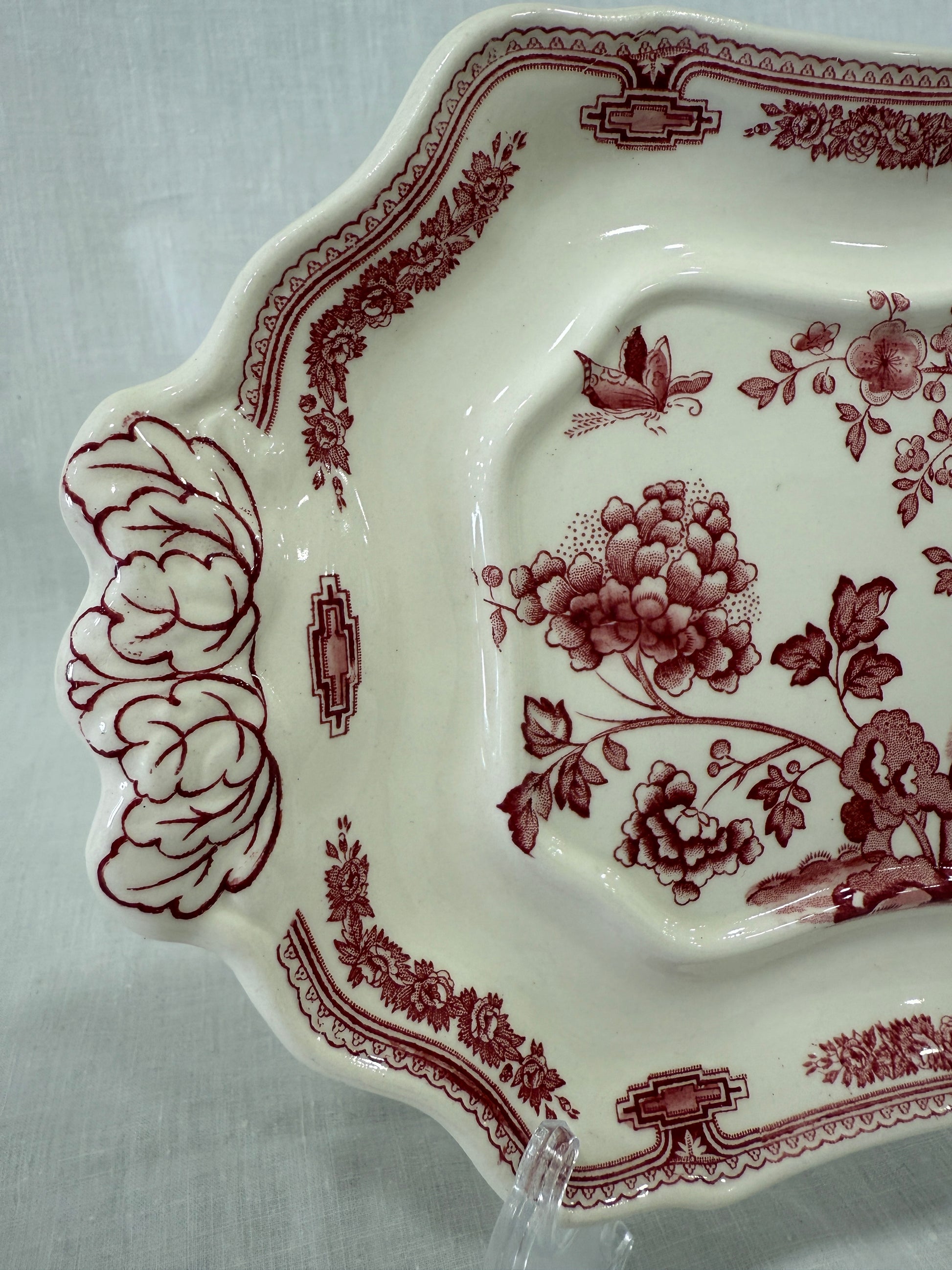 Fuente rectangular de loza inglesa de la reconocida marca Mason’s Patent Ironstone, decorada con el emblemático motivo oriental del modelo “Manchu” en un delicado tono burdeos, aplicado mediante la técnica transferware. Producida en Inglaterra entre 1940 y 1960, esta pieza destaca por sus bordes ondulados, asas en relieve y su cuidada composición floral con aves. Es una pieza versátil que puede usarse como bandeja decorativa en el baño para perfumes o jabones, como vacía bolsillos en una entrada, como reposa cucharas en la cocina o incluso para presentar dulces o pequeños aperitivos. En buen estado de conservación. Por favor, revise bien las fotografías, ya que son parte importante de la descripción.