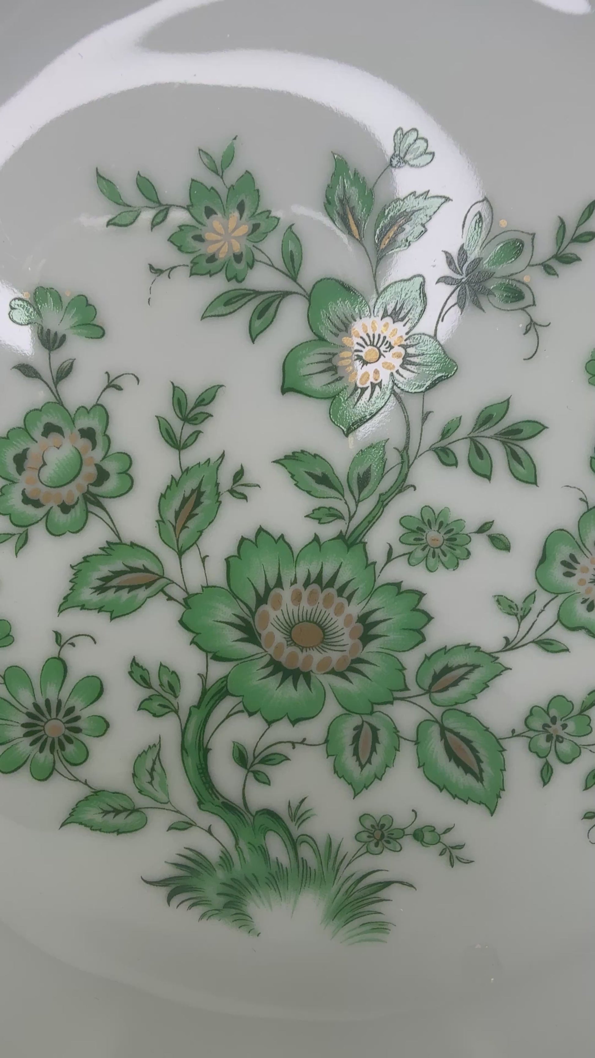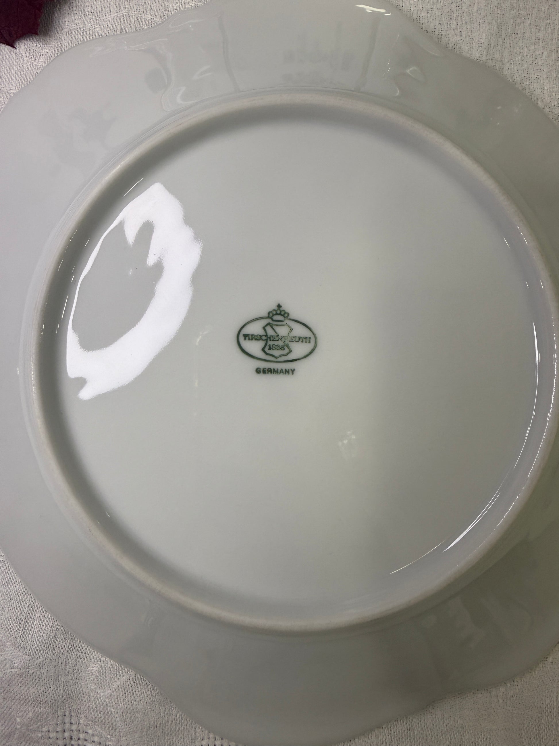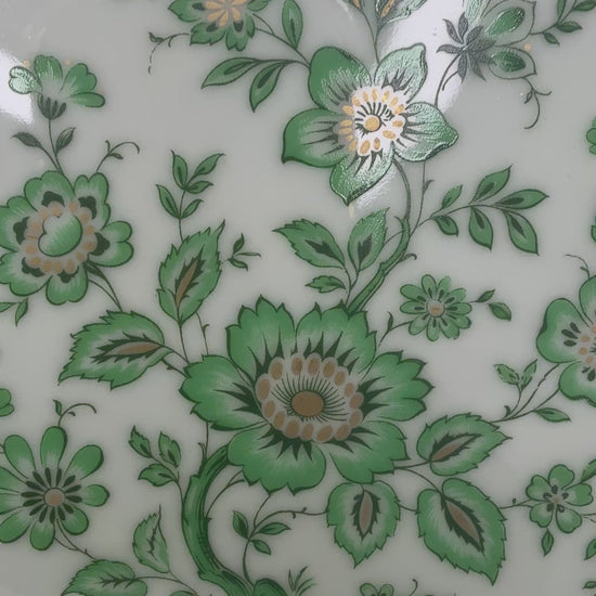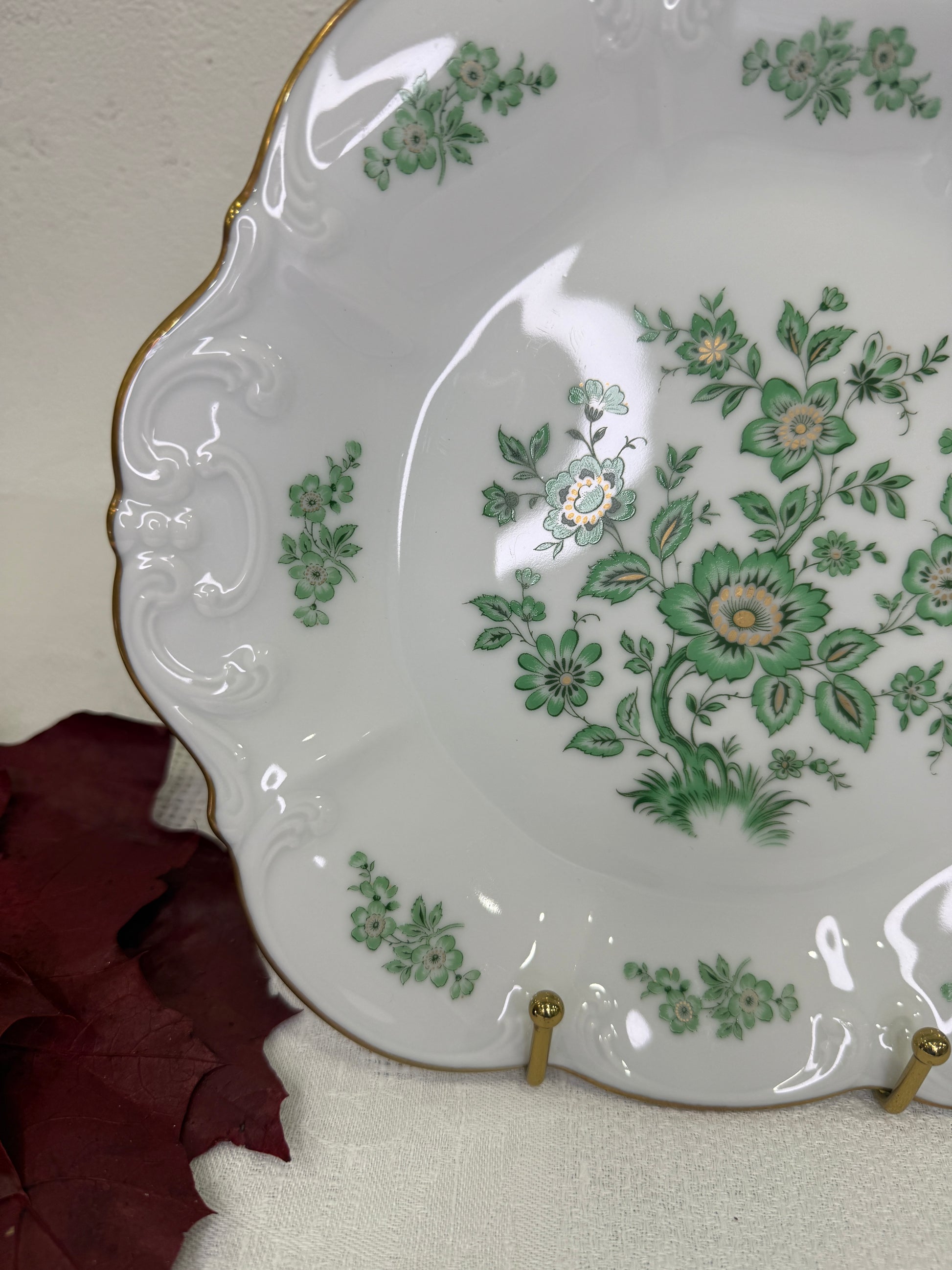 Elegante fuente redonda de porcelana alemana, fabricada por la prestigiosa manufactura Alt Tirschenreuth (Baviera). Está decorada con un delicado motivo floral en tonos verdes, de inspiración Árbol de la Vida, y rematada con un fino borde dorado ondulado. Su formato clásico y equilibrado la hace ideal para servir en mesa (entrantes, frutas, dulces o pan) o para lucir como pieza decorativa en aparadores y vitrinas. Una fuente atemporal que combina perfectamente con vajillas europeas tradicionales. Fabricada en Alemania durante la segunda mitad del siglo XX (aprox. años 60–70), destaca por la calidad de la porcelana y la armonía de su diseño.
