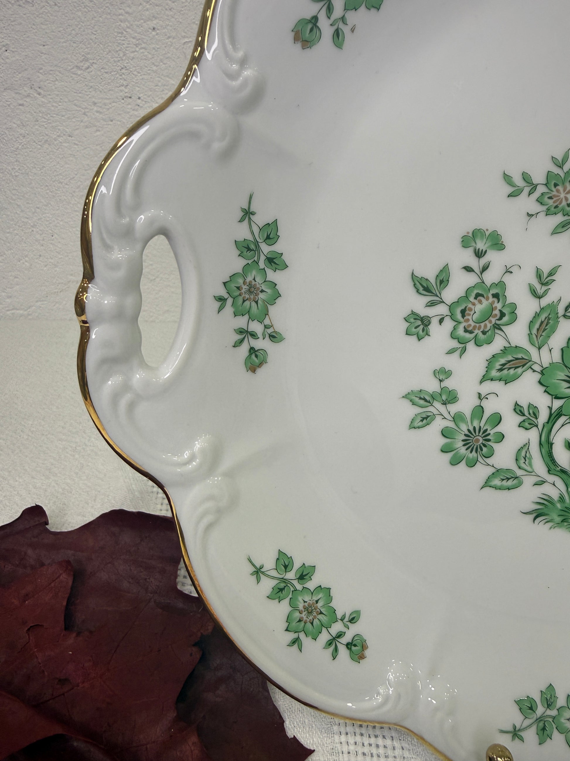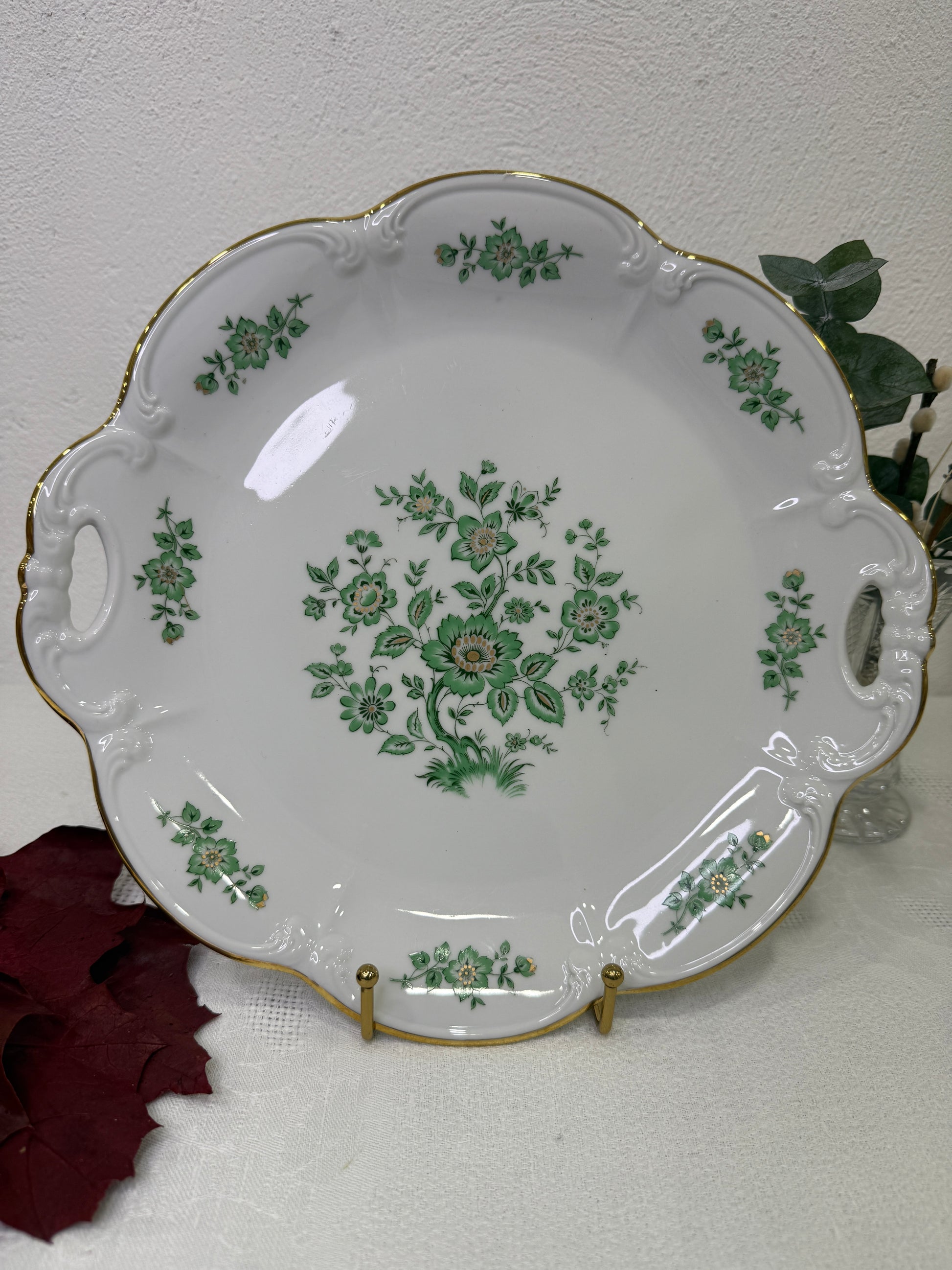 Elegante fuente redonda de porcelana alemana con asas, fabricada por la prestigiosa manufactura Alt Tirschenreuth (Baviera). Está decorada con un delicado motivo floral en tonos verdes, de inspiración Árbol de la Vida, y rematada con un fino borde dorado. Su forma redonda con borde ondulado y asas laterales le aporta un carácter clásico y refinado, ideal tanto para servir en mesa como para decorar aparadores, vitrinas o mesas auxiliares. Una pieza atemporal que encaja perfectamente en mesas cuidadas y vajillas europeas tradicionales. Fabricada en Alemania durante la segunda mitad del siglo XX (aprox. años 60–70), destaca por la calidad de la porcelana y la armonía de su diseño.
