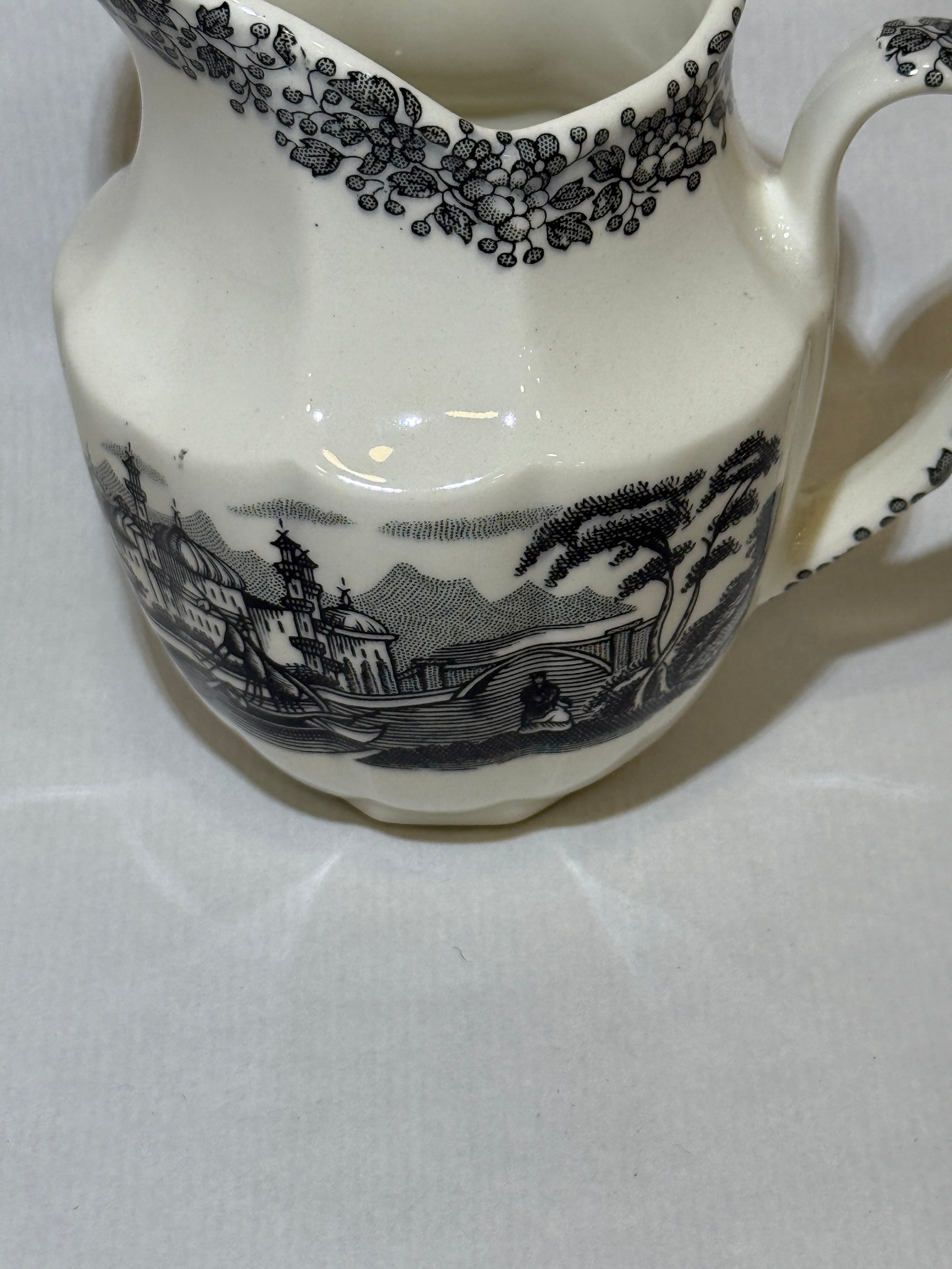 Esta elegante jarra de leche pertenece al modelo Ochavano Negro de La Cartuja de Sevilla Pickman, una colección emblemática de la cerámica española. Decorada en negro sobre loza blanca mediante la técnica transferware, presenta escenas arquitectónicas inspiradas en paisajes orientales, así como delicadas cenefas florales en el cuello, el asa y la base. En perfecto estado de conservación. Por favor, revise bien las fotografías, ya que son parte importante de la descripción.