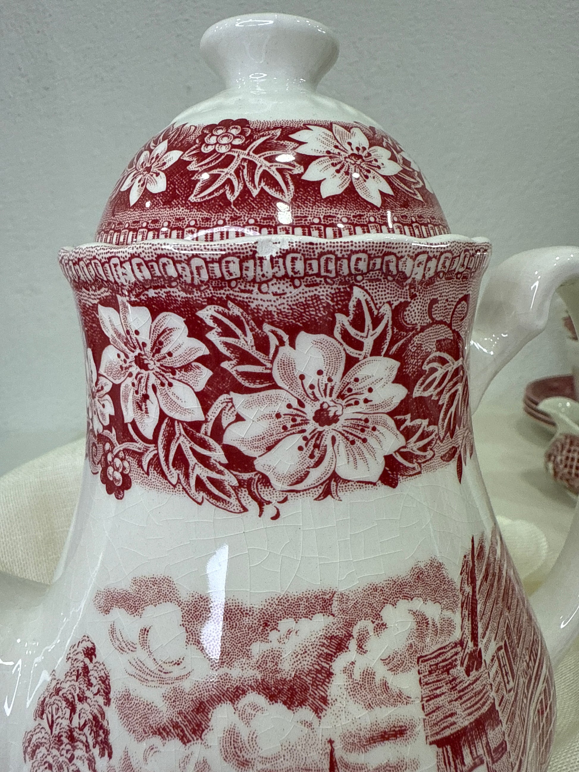 Encantador juego de desayuno vintage inglés del modelo Coaching Taverns de Royal Tudor Ware – Staffordshire (Inglaterra), decorado con escenas de diligencias y paisajes rurales en un elegante tono burdeos.