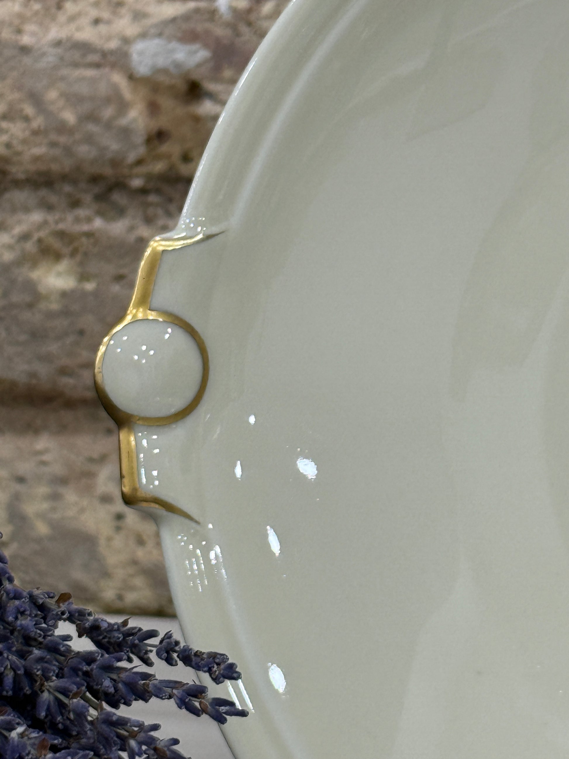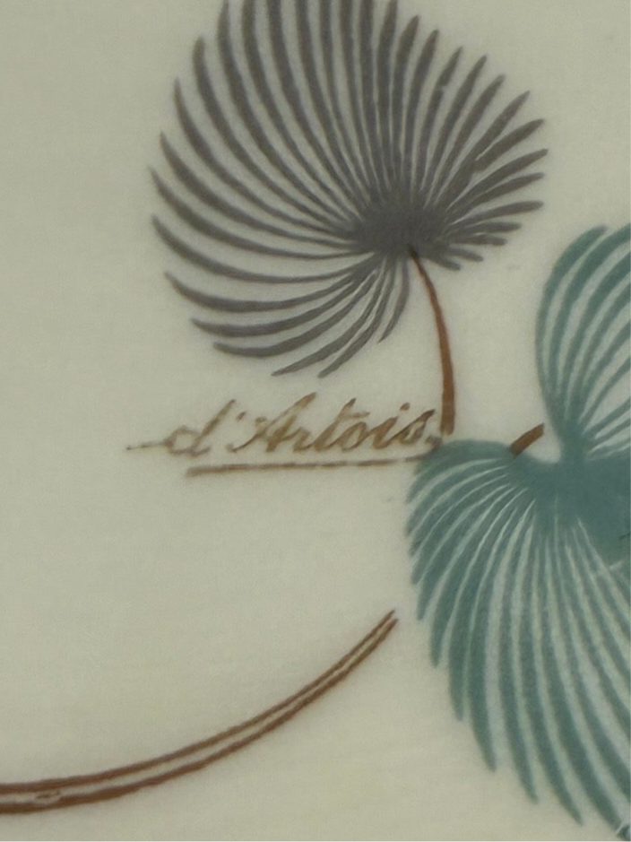 Espectacular juego de postre procedente de la fábrica más antigua de Limoges, cuna de la porcelana francesa desde el siglo XVIII. Se trata de la prestigiosa Ancienne Fabrique Royale, reconocida por su excelencia y tradición artesanal. Decoración d’Artois, un motivo de mediados del siglo XX caracterizado por sus delicadas hojas en tonos grises y verdes, de estilo elegante y atemporal. Sobre el nombre d’Artois: hace referencia al Conde de Artois, hermano del rey Luis XVI, quien fue protector de la manufactura de Limoges en el siglo XVIII. En el siglo XX, este término se recuperó como nombre de colección y decoración en honor a esa herencia real, evocando la elegancia y tradición de la porcelana francesa. En muy buen estado. Por favor, revise bien las fotografías, ya que son parte importante de la descripción.