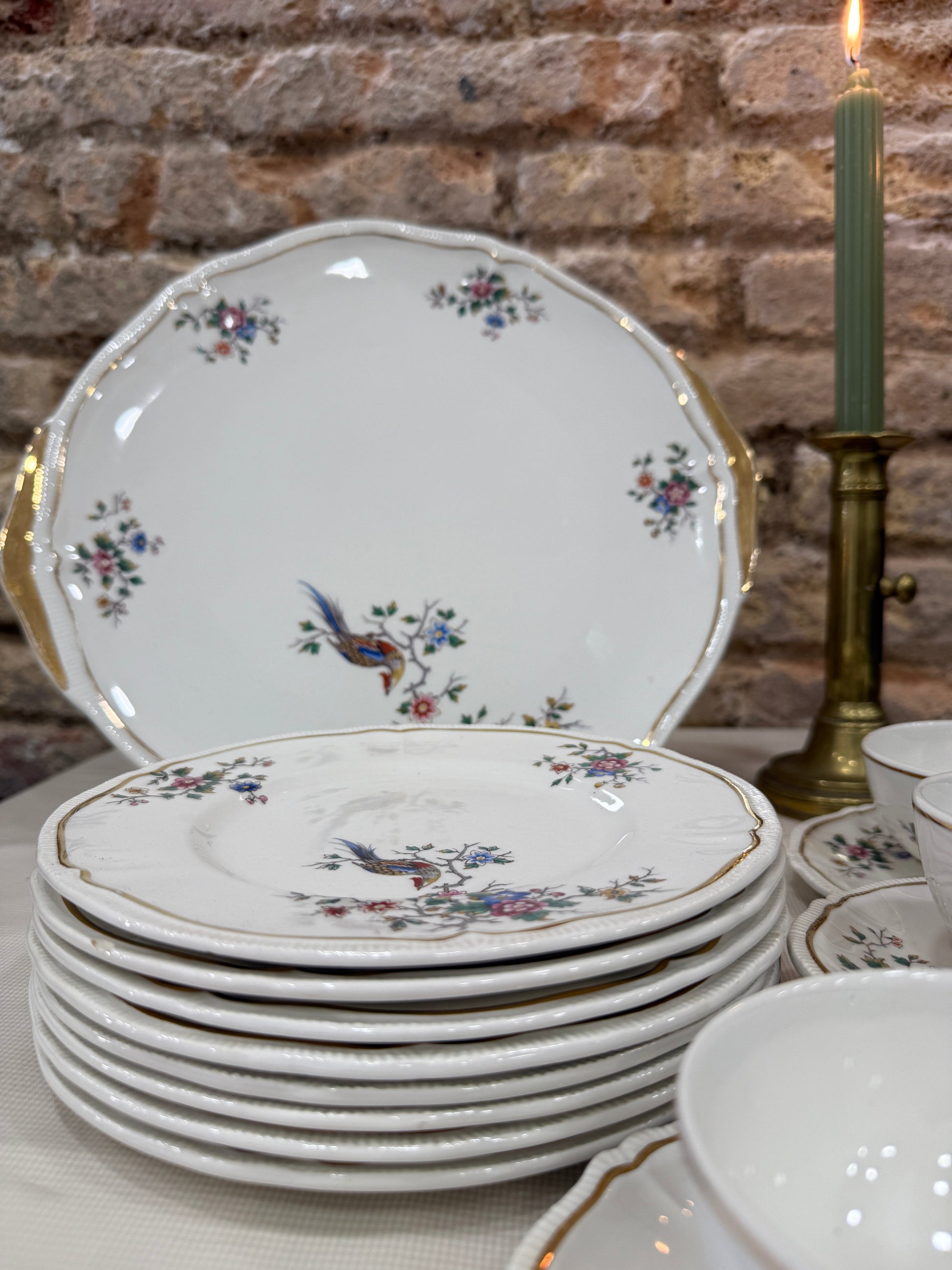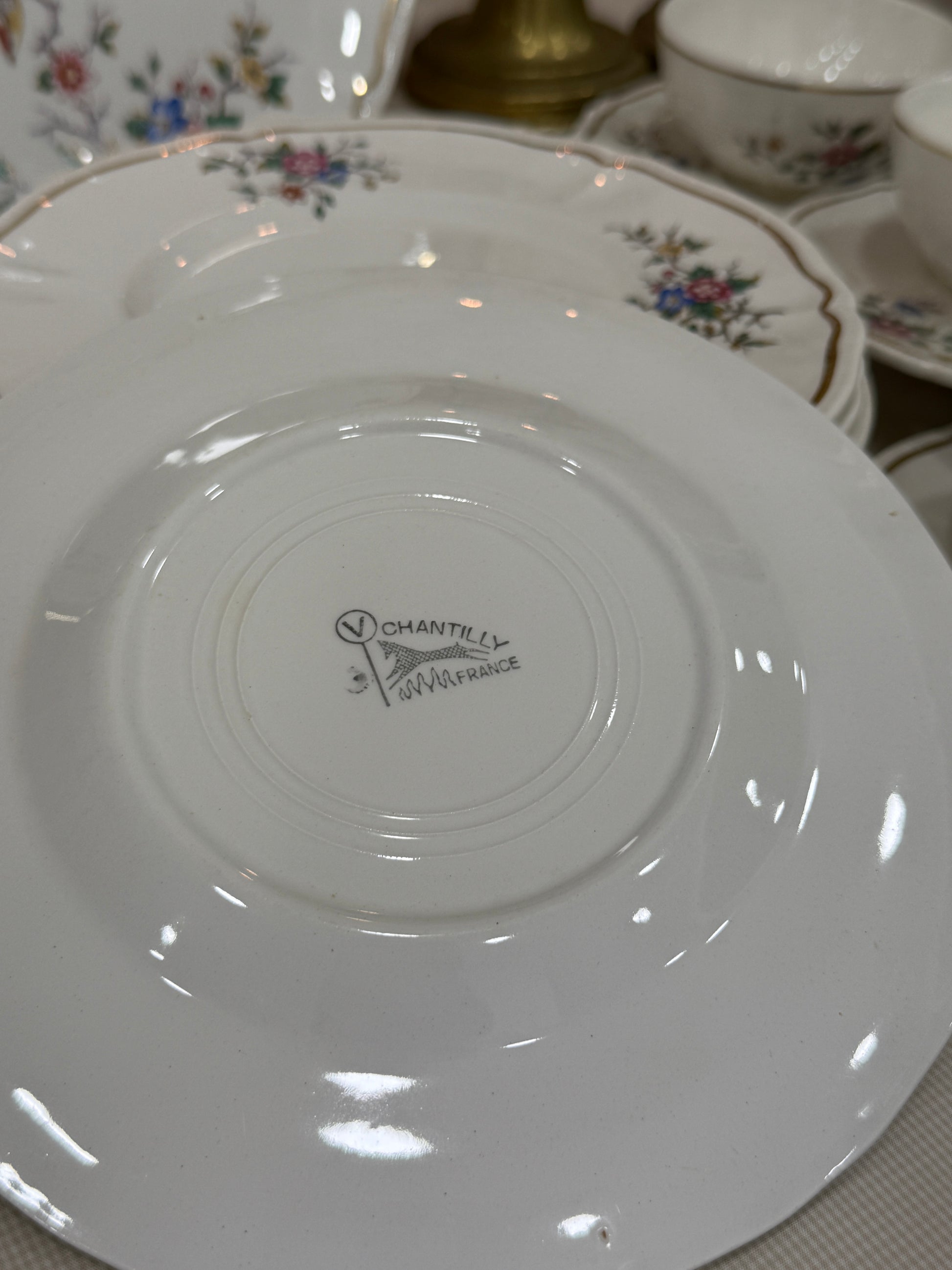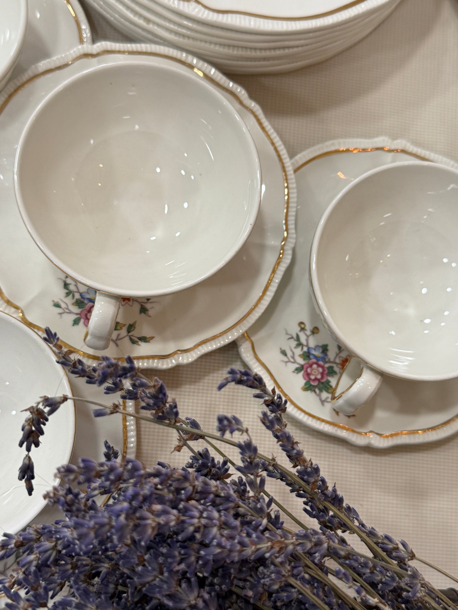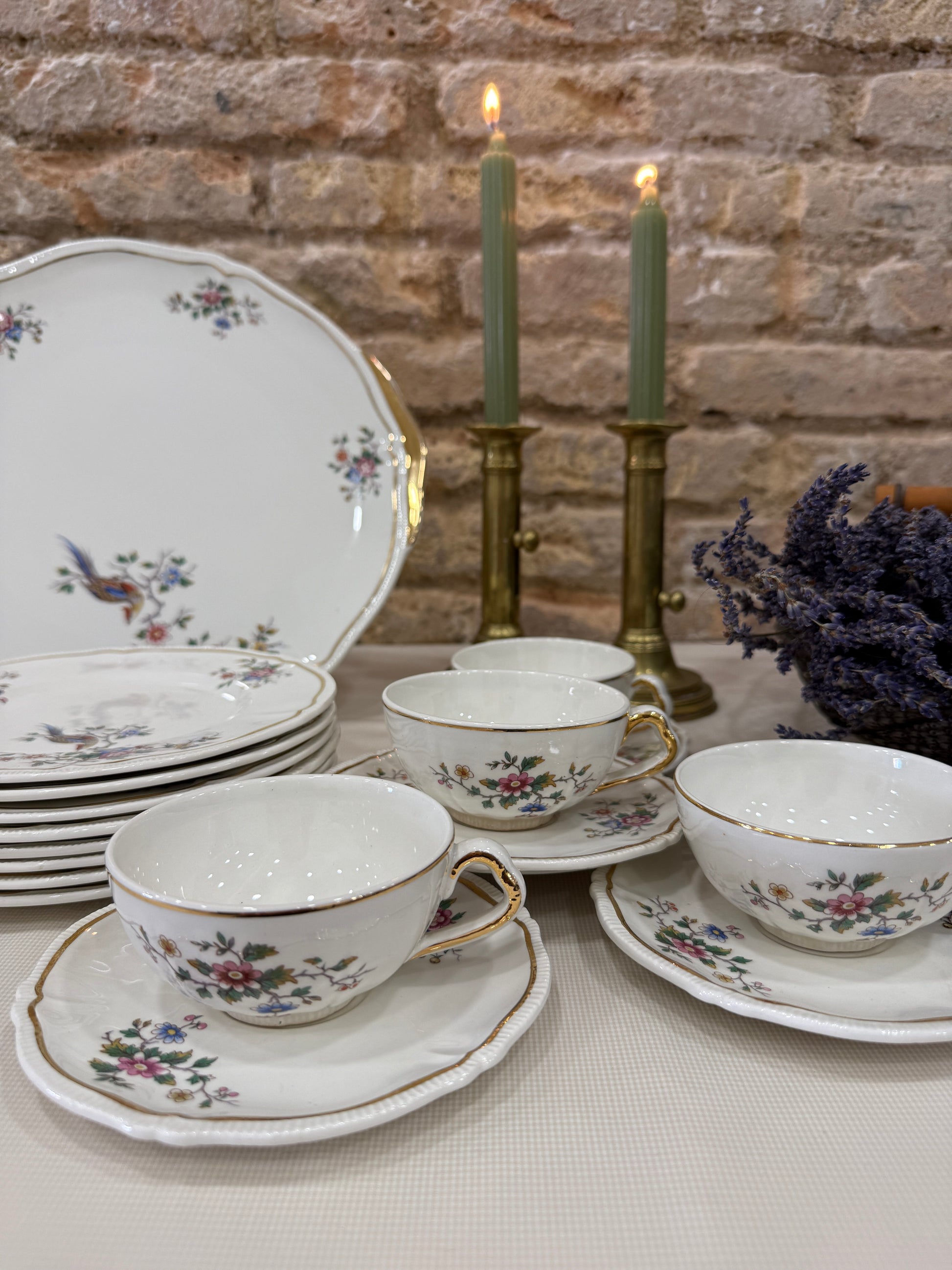 Este elegante conjunto pertenece al modelo Chantilly de la reconocida fábrica Longchamp (Francia), una de las casas históricas de porcelana francesa del siglo XX. Su diseño destaca por la decoración floral policromada y el fileteado dorado que realza el borde. El conjunto se encuentra en muy buen estado general. Un plato de postre presenta un pequeño chip en el borde. Las tazas conservan ligera pátina en la base exterior, fruto del paso del tiempo, mientras que su interior está impecable. Estos detalles no afectan al uso ni a la belleza de la vajilla, y refuerzan su carácter auténtico y vintage.