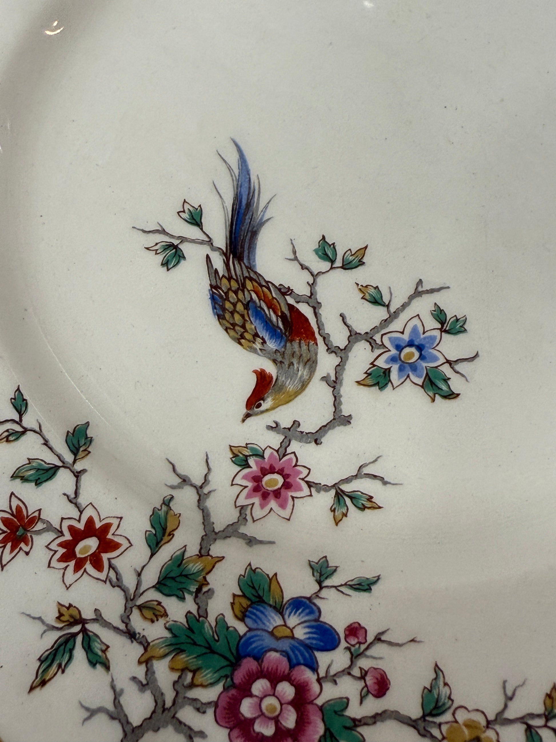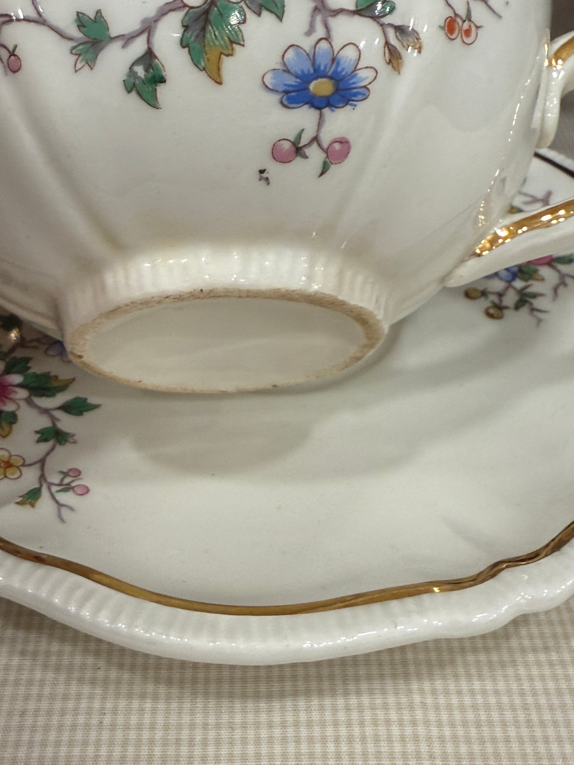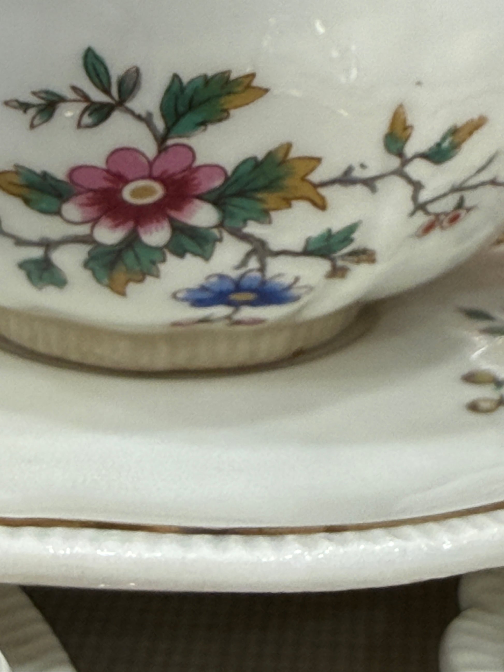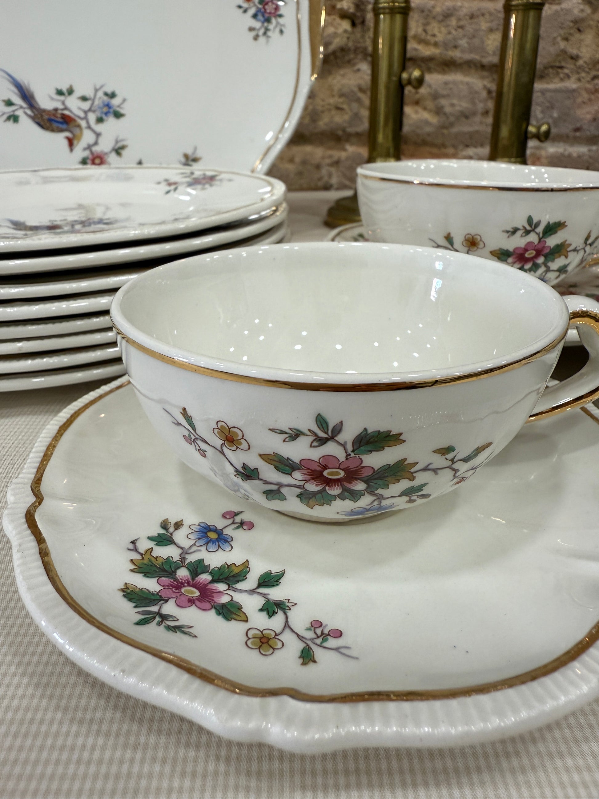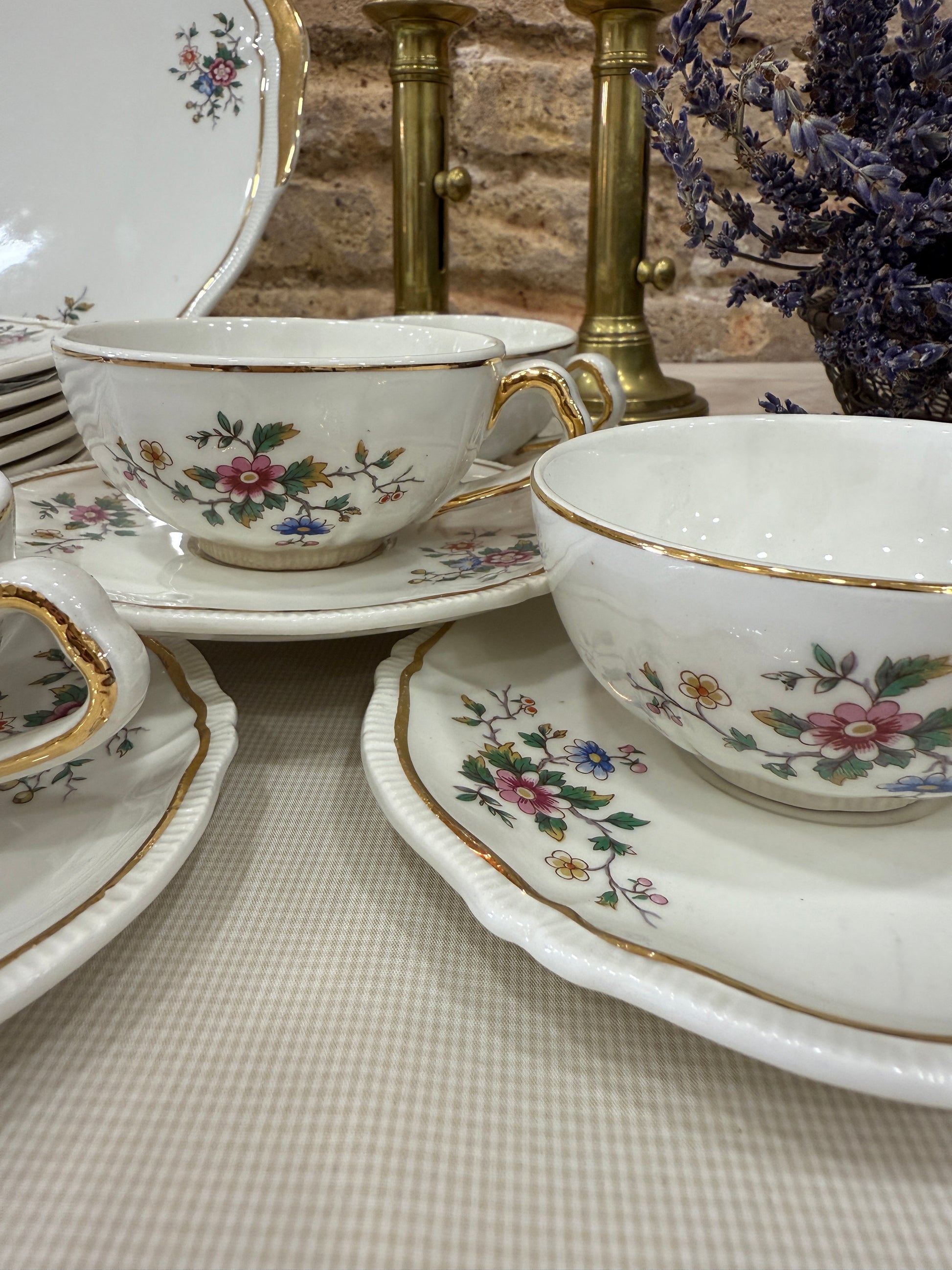 Este elegante conjunto pertenece al modelo Chantilly de la reconocida fábrica Longchamp (Francia), una de las casas históricas de porcelana francesa del siglo XX. Su diseño destaca por la decoración floral policromada y el fileteado dorado que realza el borde. El conjunto se encuentra en muy buen estado general. Un plato de postre presenta un pequeño chip en el borde. Las tazas conservan ligera pátina en la base exterior, fruto del paso del tiempo, mientras que su interior está impecable. Estos detalles no afectan al uso ni a la belleza de la vajilla, y refuerzan su carácter auténtico y vintage.