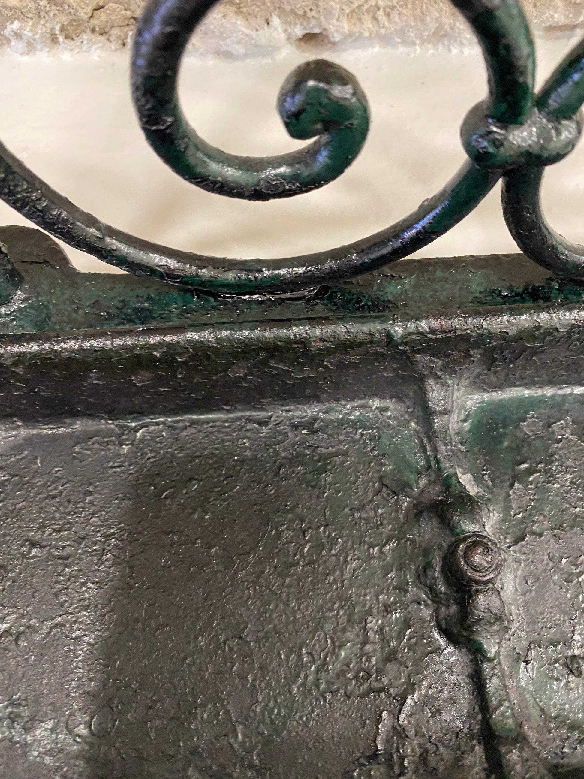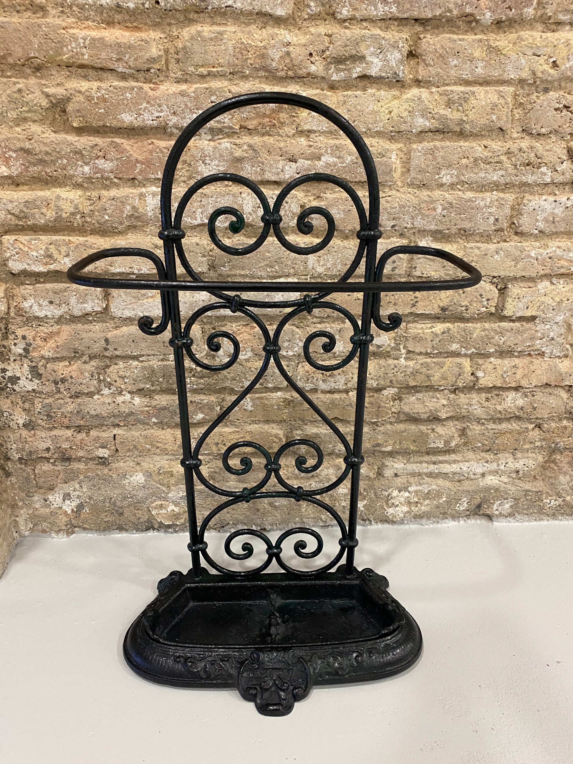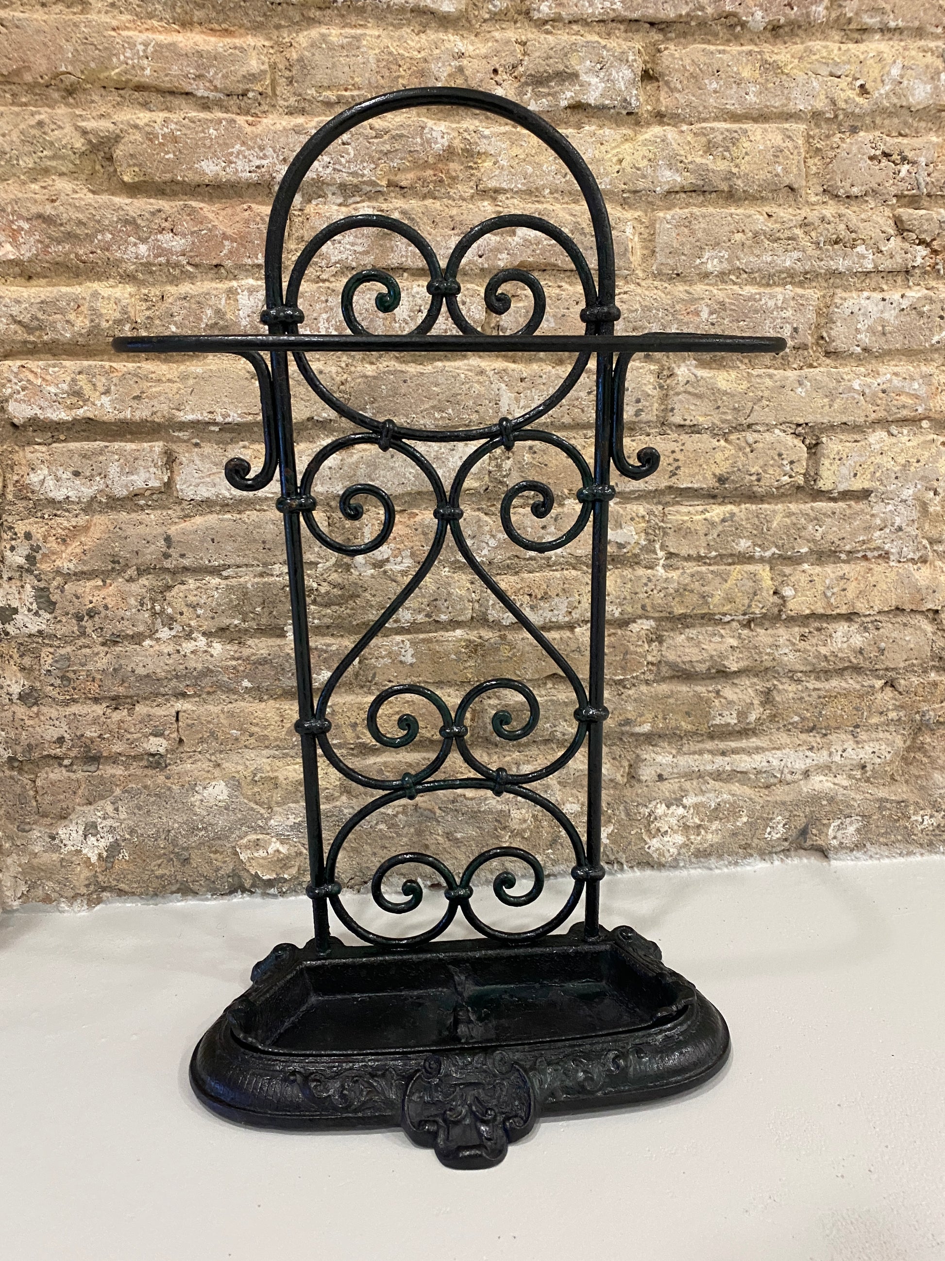 Elegante paragüero antiguo francés de hierro forjado con base de hierro fundido, una pieza sólida y decorativa que combina funcionalidad y carácter. Su diseño destaca por las volutas ornamentales trabajadas a mano y su estructura abierta, que permite una correcta ventilación de los paraguas. Muy buen estado de conservación, respetando su pátina original y el carácter antiguo de la pieza. Por favor, revise bien las fotografías, ya que son parte importante de la descripción.