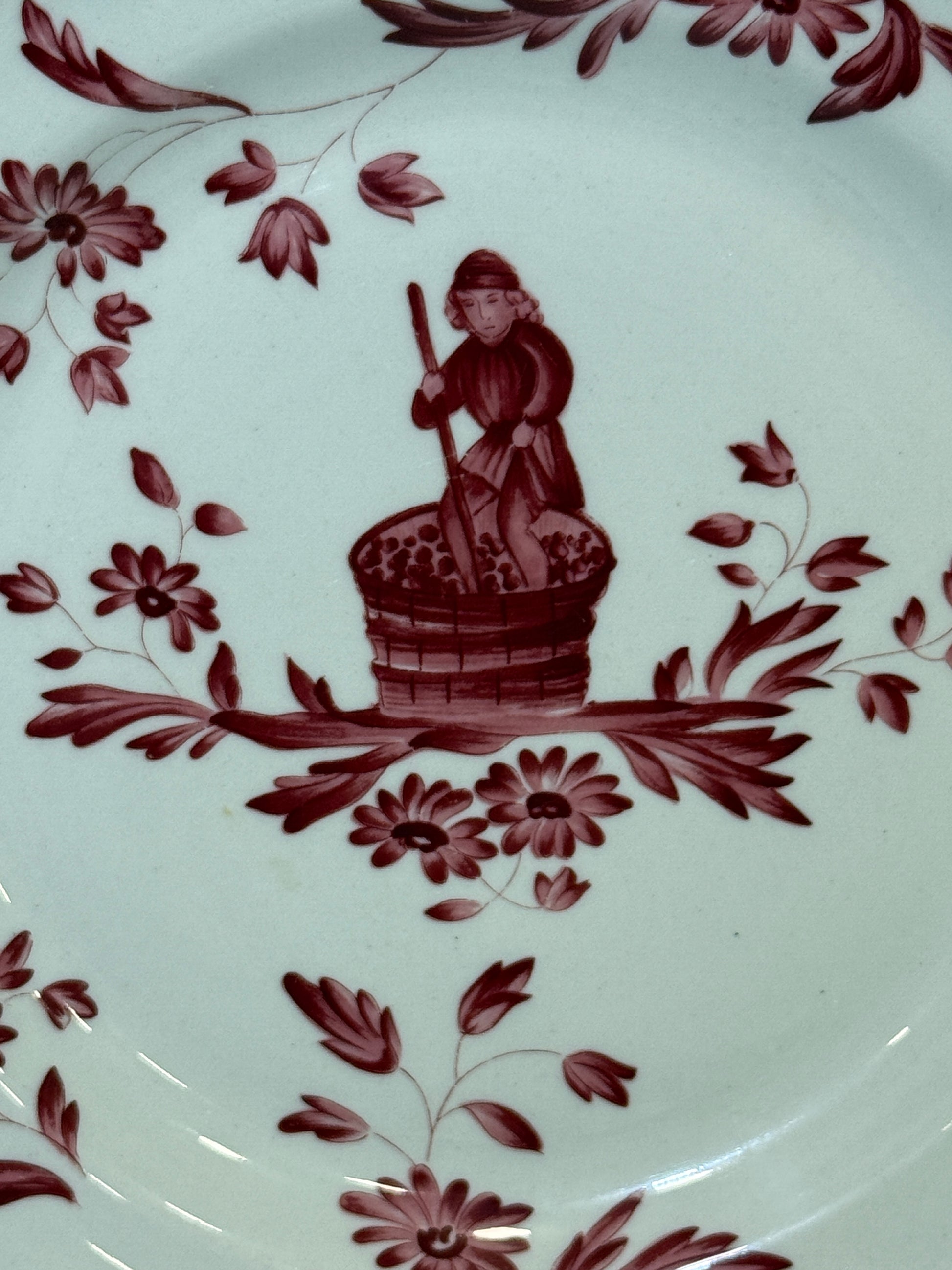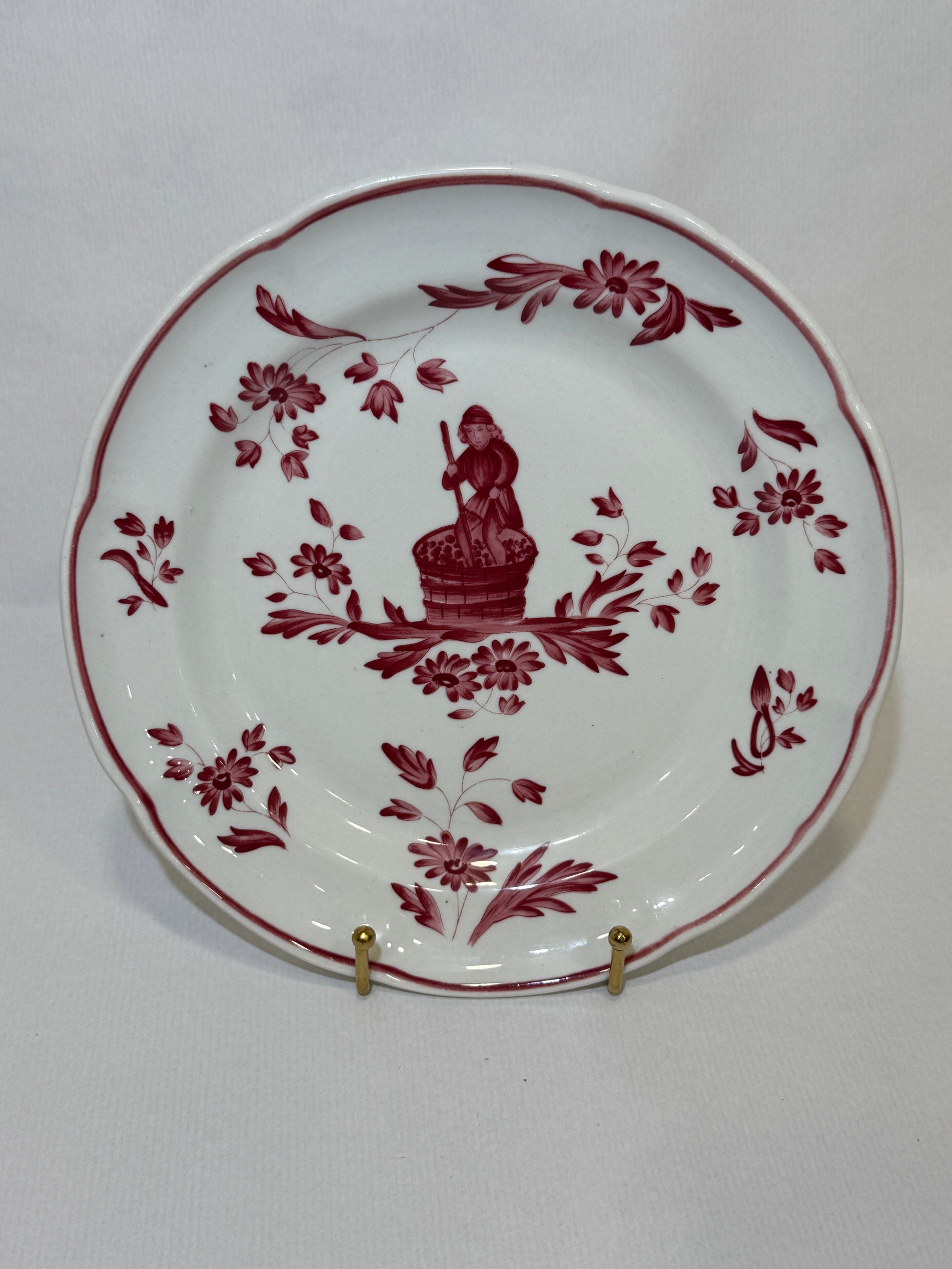 Elegante plato de loza francesa fabricado por Longchamp France, con el característico sello “Décor Inaltérable – Façon main”, que indica que fue pintado a mano y con una decoración resistente al uso y al tiempo. Este modelo presenta una escena tradicional de vendimia en rojo burdeos, enmarcada por un delicado motivo floral, típico de la cerámica decorativa francesa de la segunda mitad del siglo XX. Fabricado entre las décadas de 1970 y 1990, es una pieza ideal tanto para coleccionistas como para decoración de interiores con estilo vintage. En perfecto estado de conservación. Por favor, revise bien las fotografías, ya que son parte importante de la descripción.