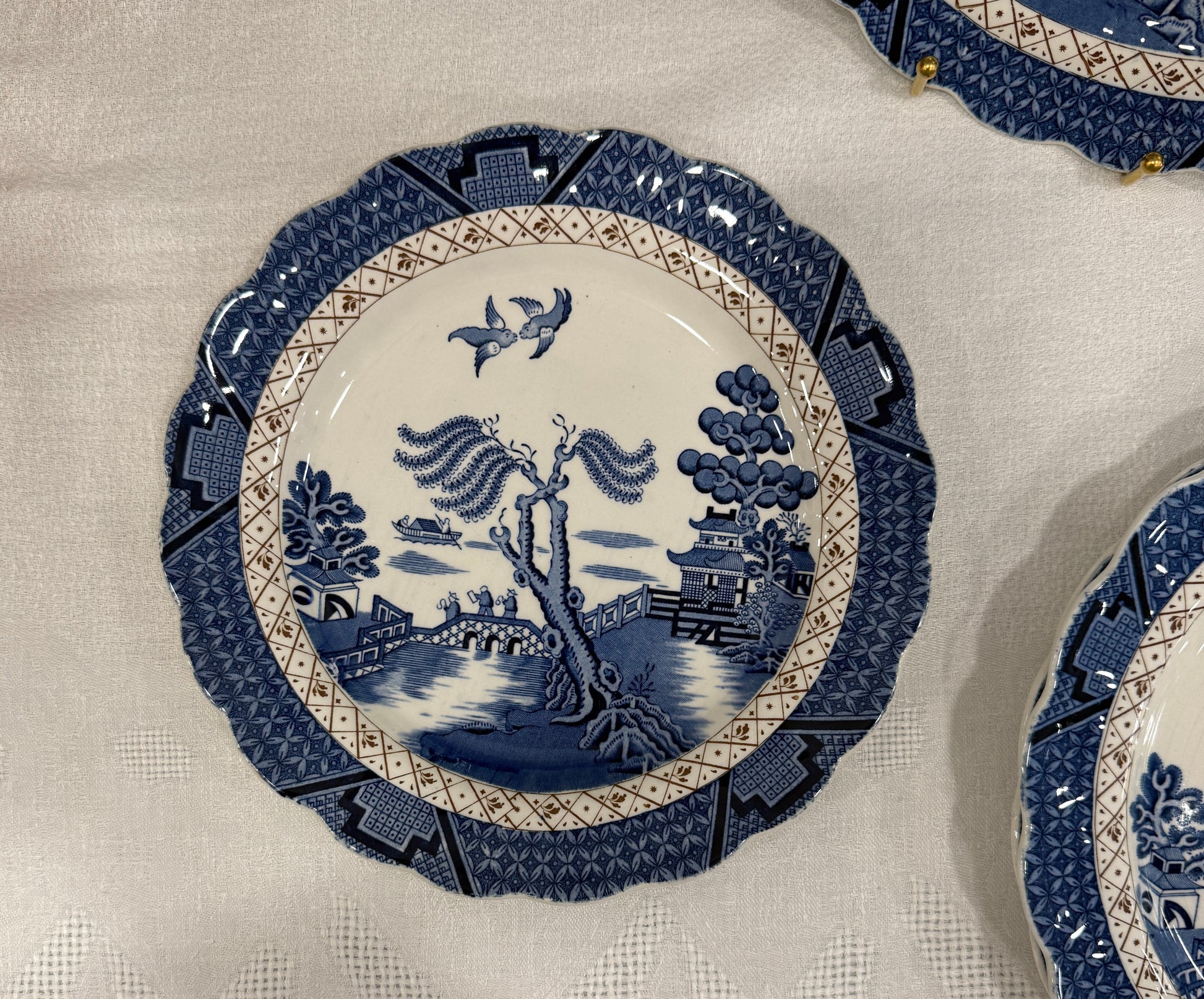 Platos llanos del icónico modelo “Real Old Willow” A8025, creados por la firma inglesa Booths Ltd. en Staffordshire. El clásico diseño Willow en azul cobalto sobre loza blanca muestra escenas orientales con pagodas, sauces y aves, uno de los patrones más reconocidos y coleccionados de la cerámica inglesa. En muy buen estado de conservación, salvo el plato con craquel. Por favor, revise bien las fotografías, ya que son parte importante de la descripción.