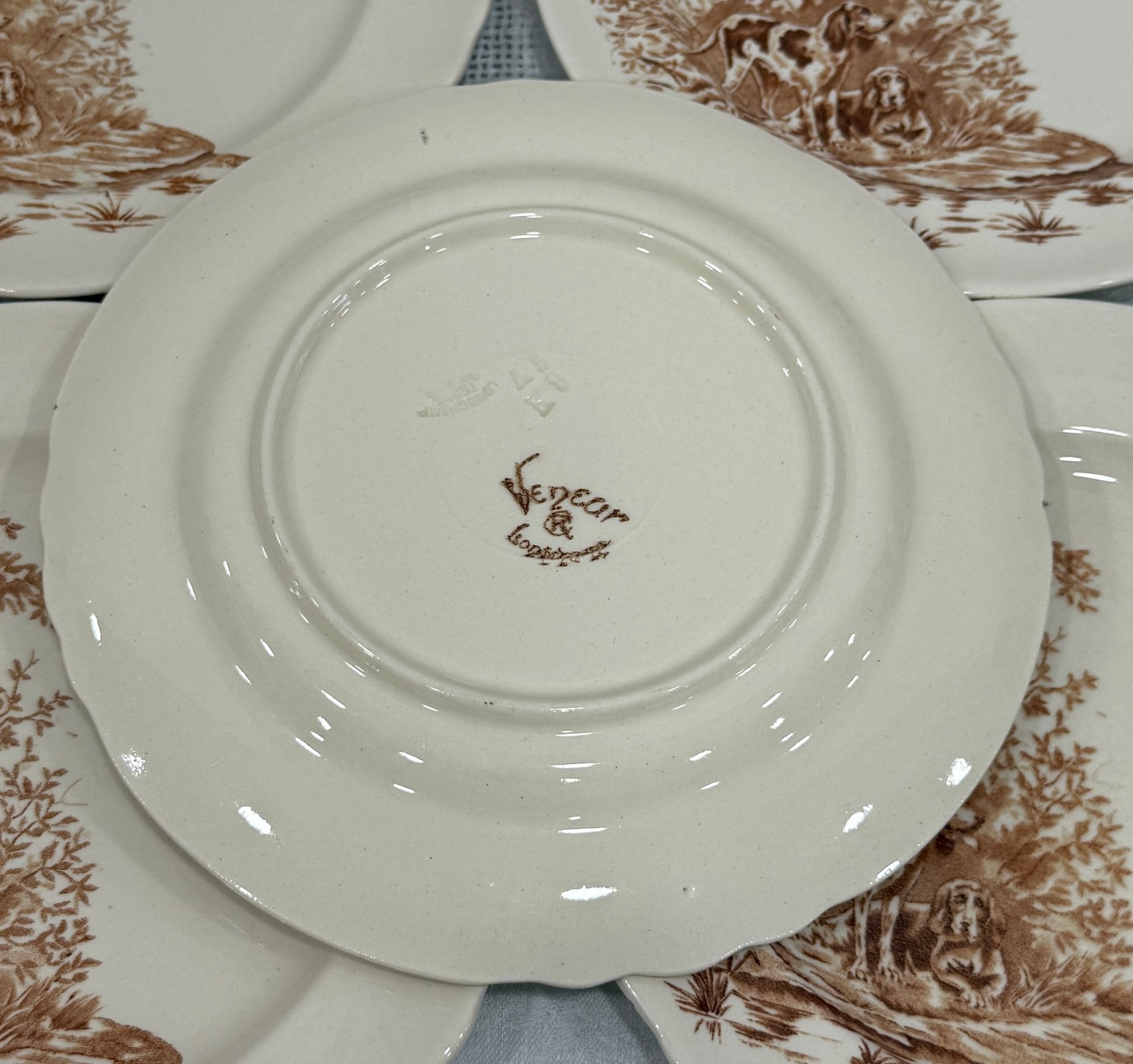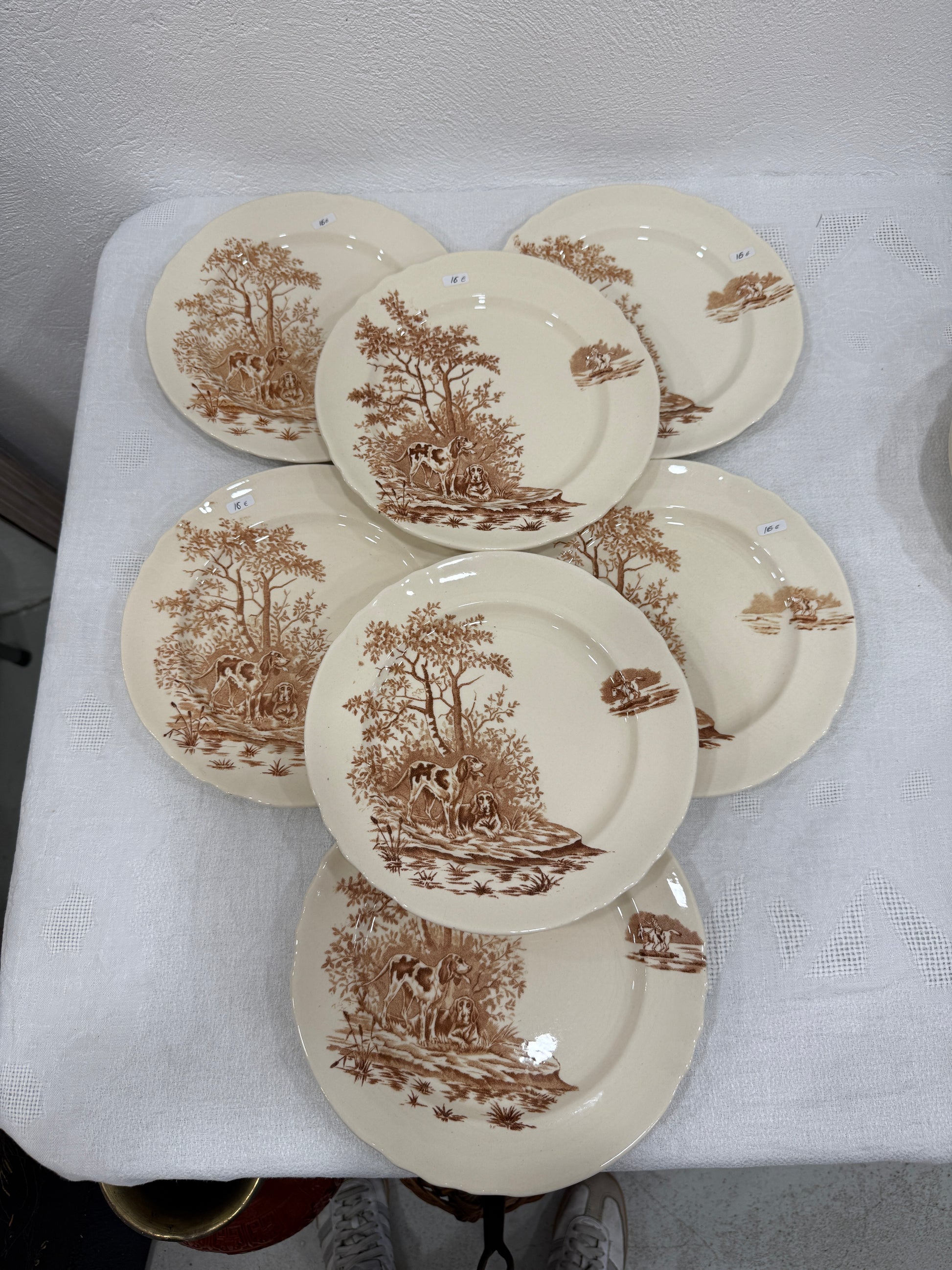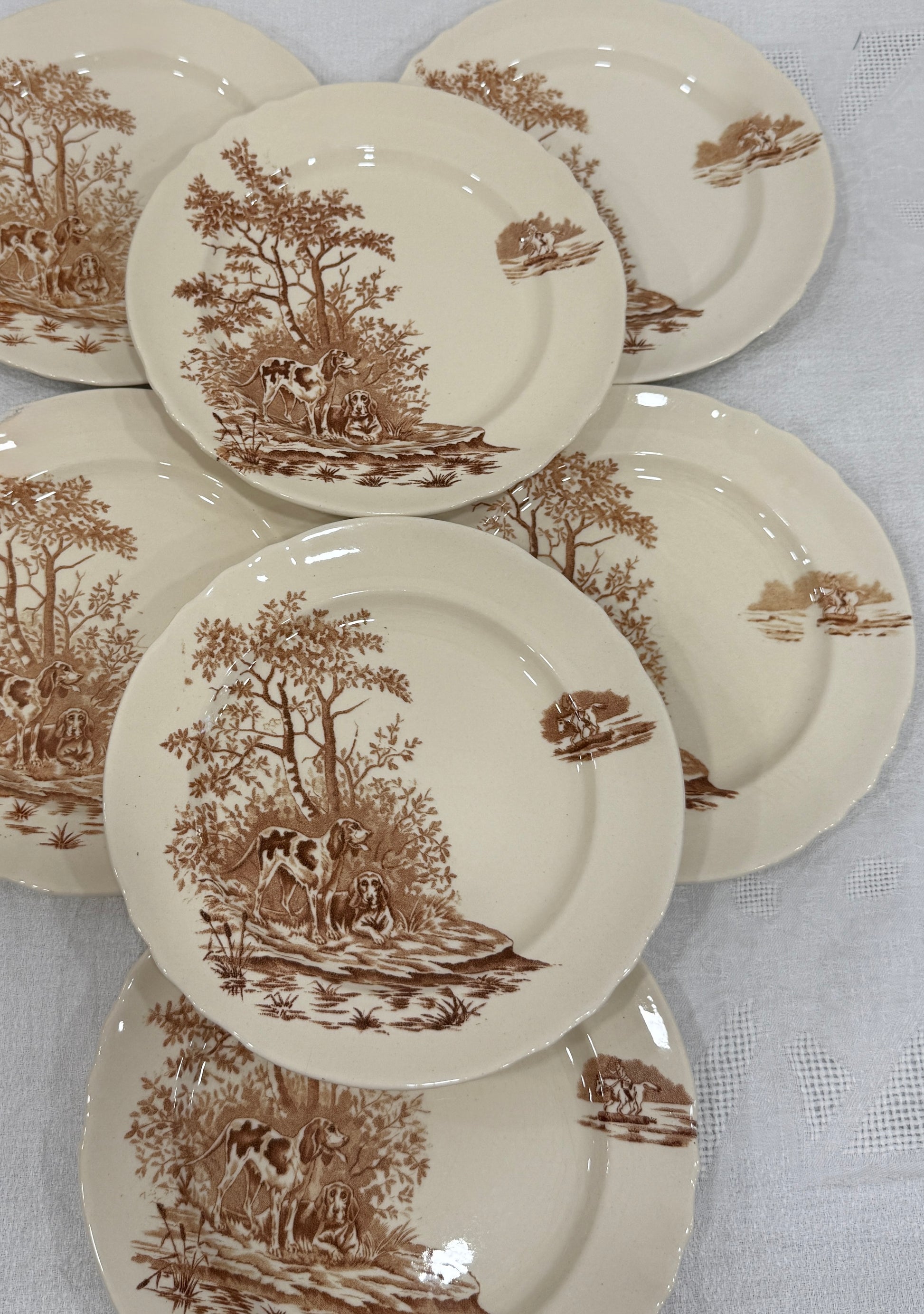 Cada plato presenta una exquisita decoración en tonos sepia: un perro de caza en primer plano y, en segundo plano, un jinete a caballo acompañado de sabuesos. Una iconografía cinegética muy representativa del gusto burgués de finales del siglo XIX.