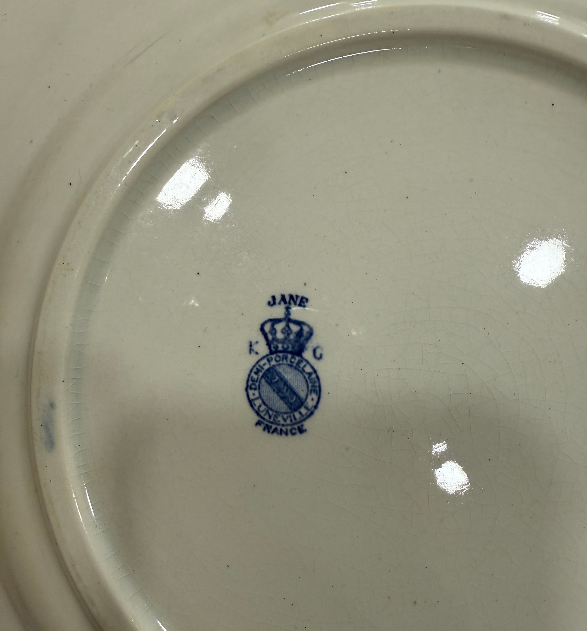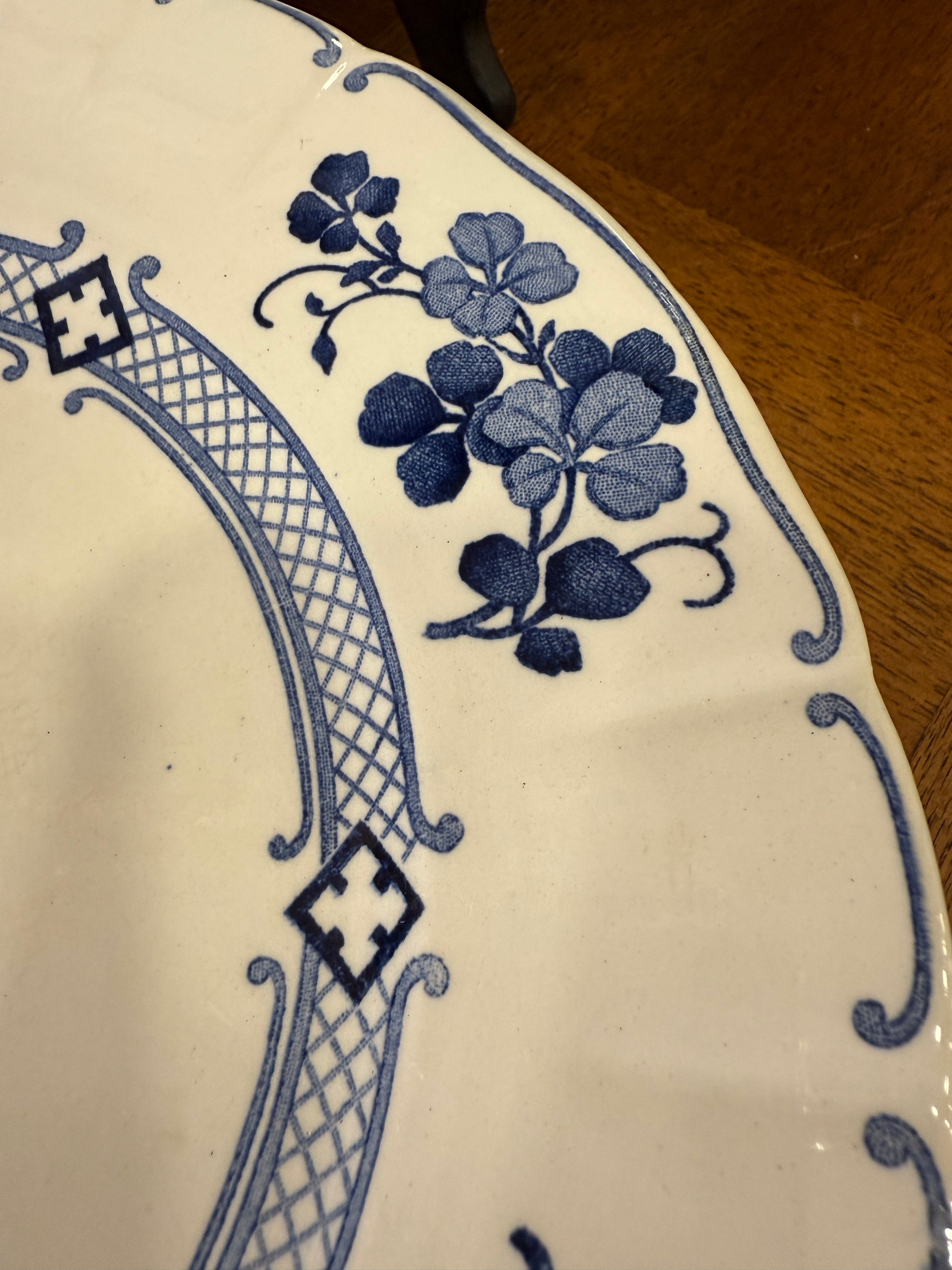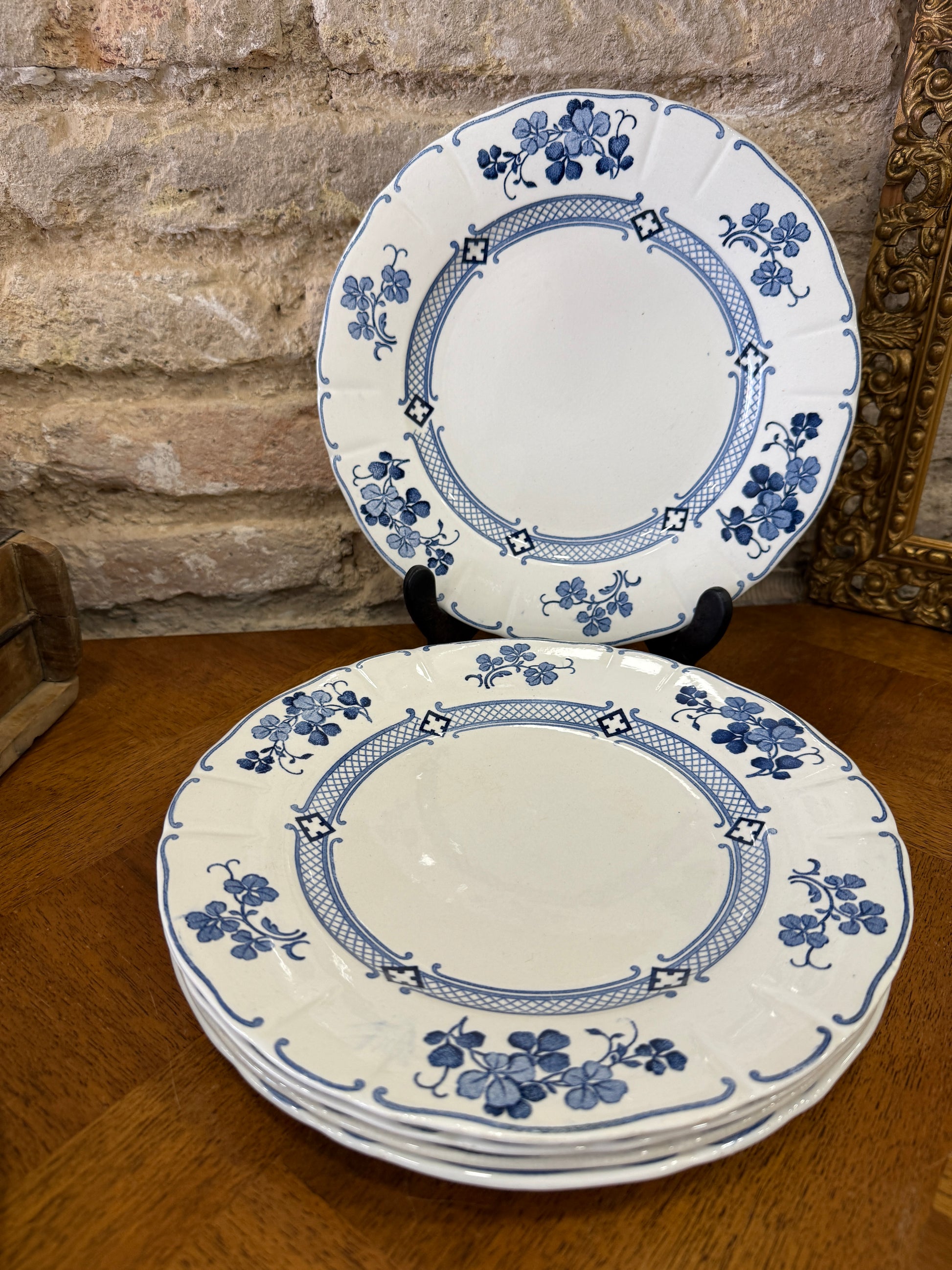 Platos llano de la icónica loza francesa Sarreguemines, modelo Jane , destaca por su delicado motivo floral azul sobre fondo blanco. Una pieza elegante y atemporal, ideal para aportar un toque vintage y sereno a tu mesa. 5 platos disponibles.