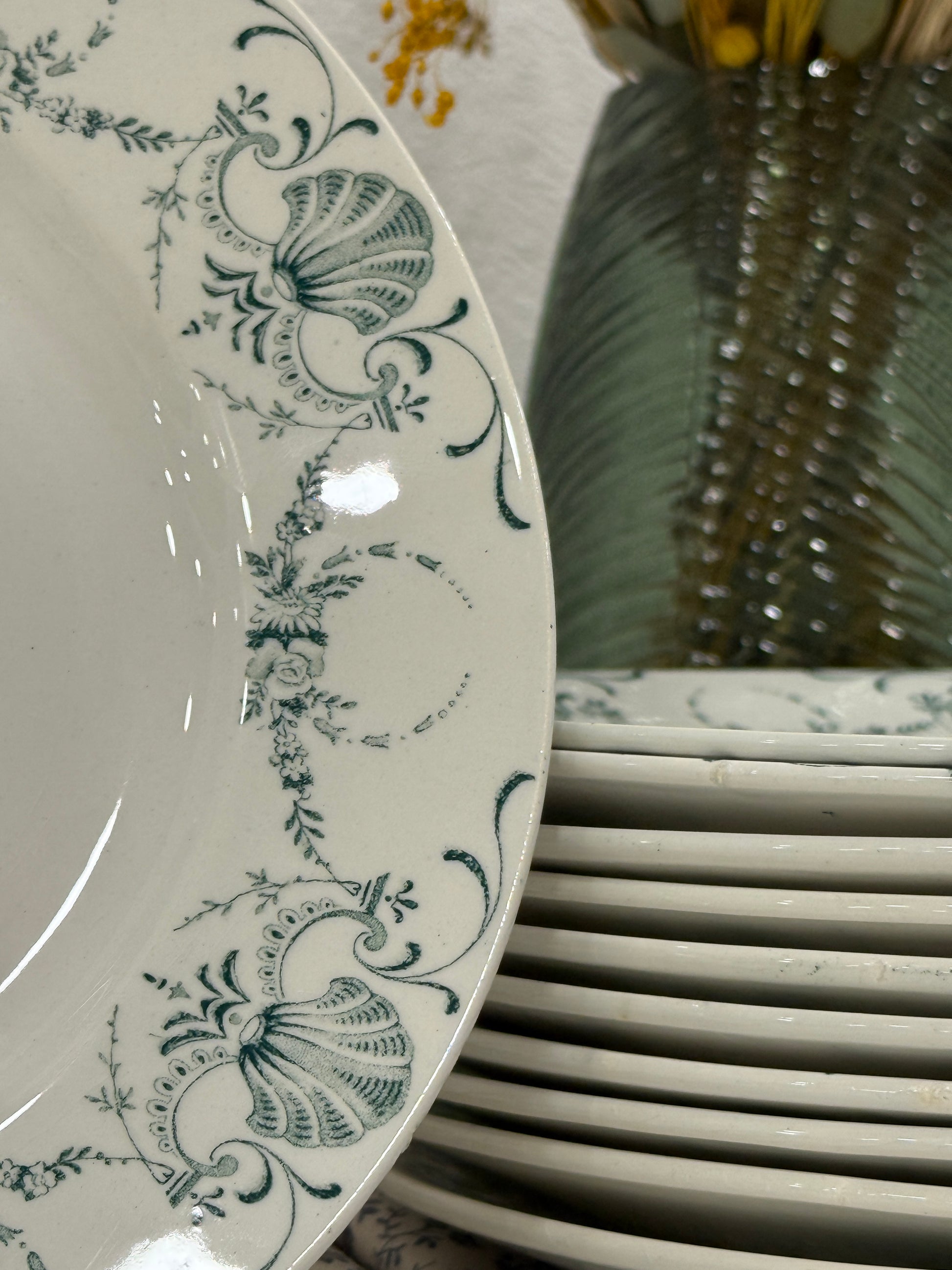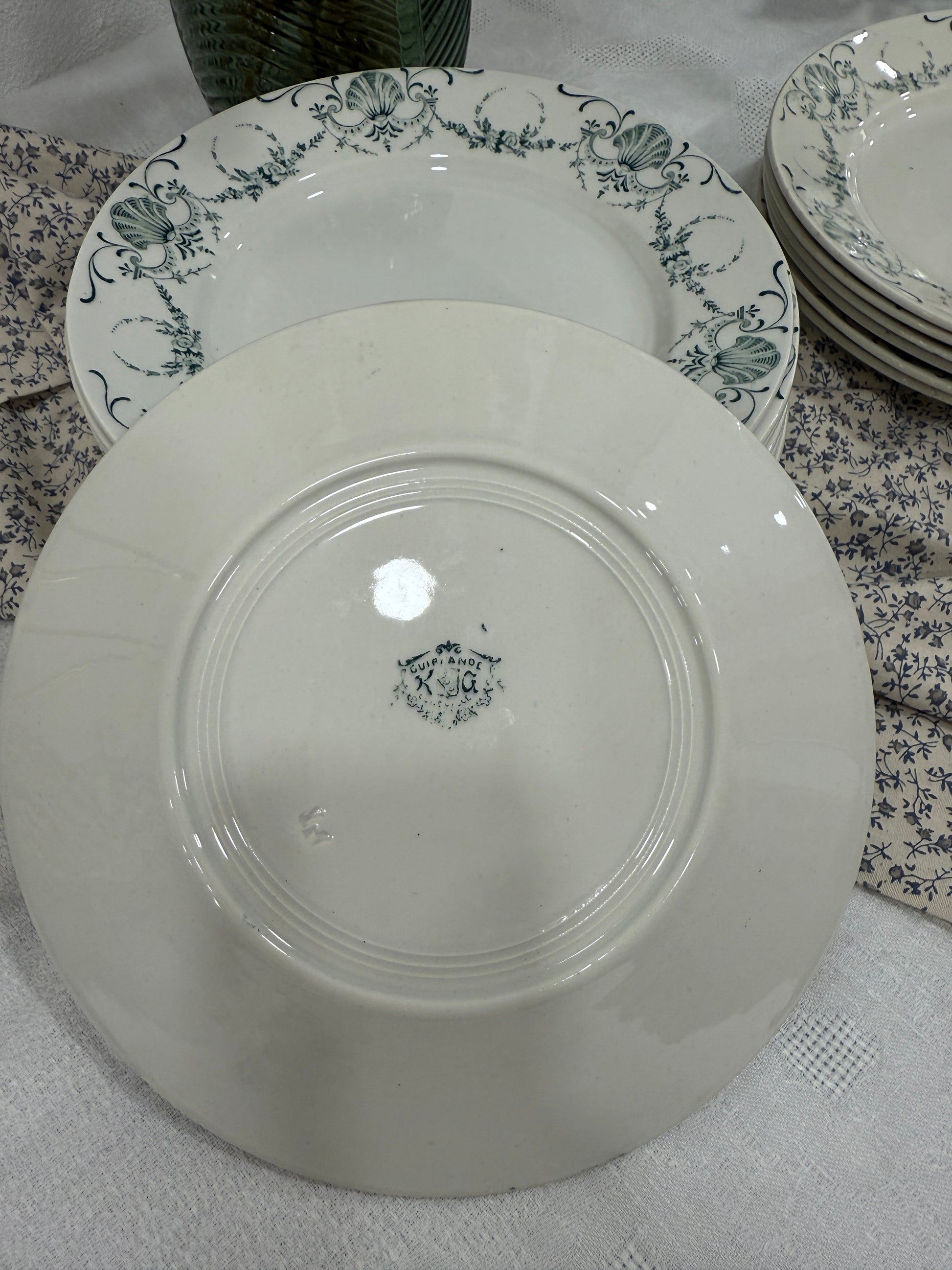 Conjunto de 6 platos llanos de loza francesa, fabricados por Keller & Guérin en Lunéville a finales del siglo XIX – principios del XX. El modelo Guirlande se distingue por su elegante decoración en verde con guirnaldas y conchas estilizadas, típica de la estética francesa de 1900. Uno de ellos no lleva sello, algo frecuente en la época, pero todos forman parte del mismo lote y diseño. En buen estado de conservación, puede presentar signos propios de la antigüedad. Por favor, revise bien las fotografías, ya que son parte importante de la descripción.