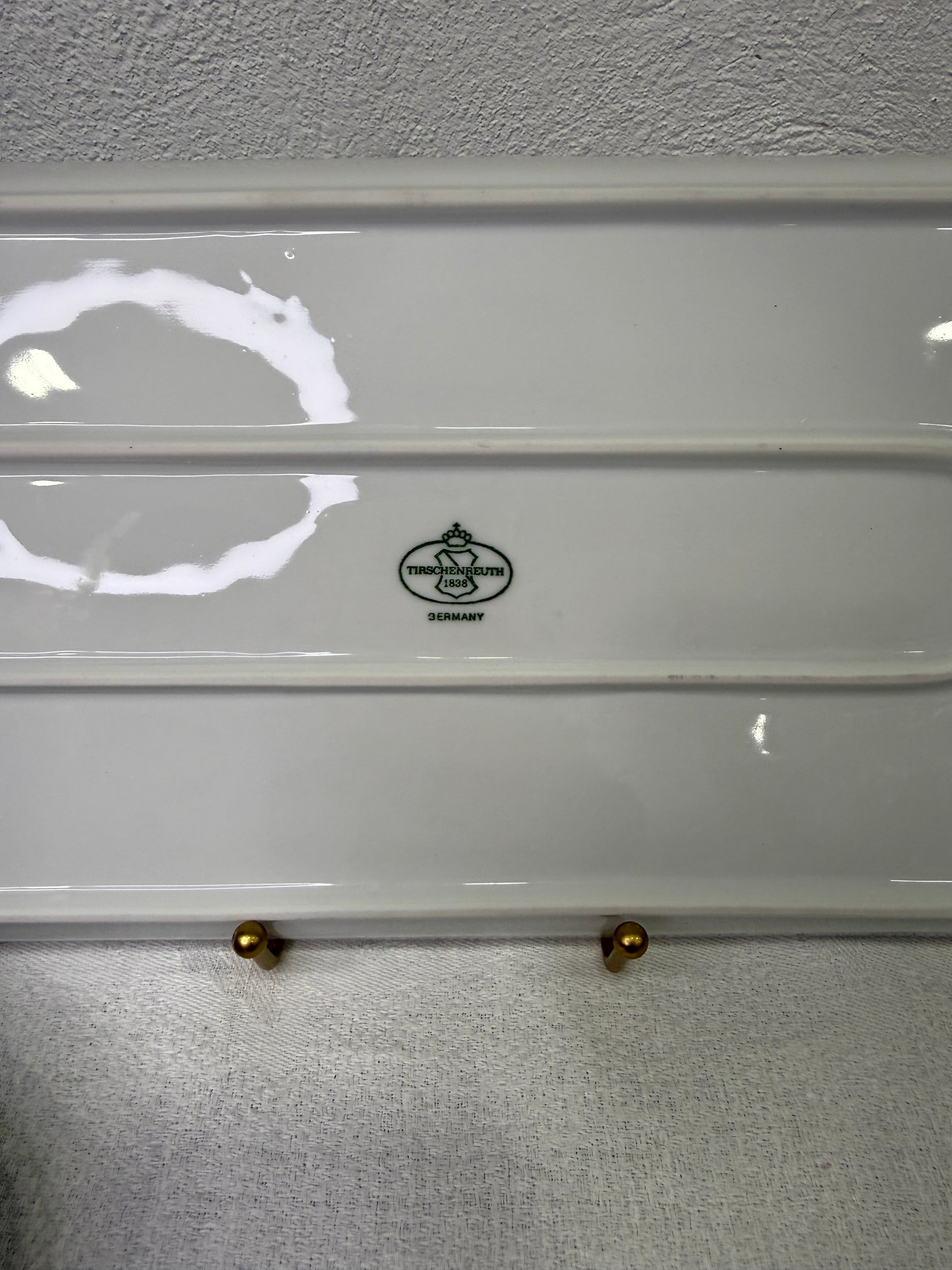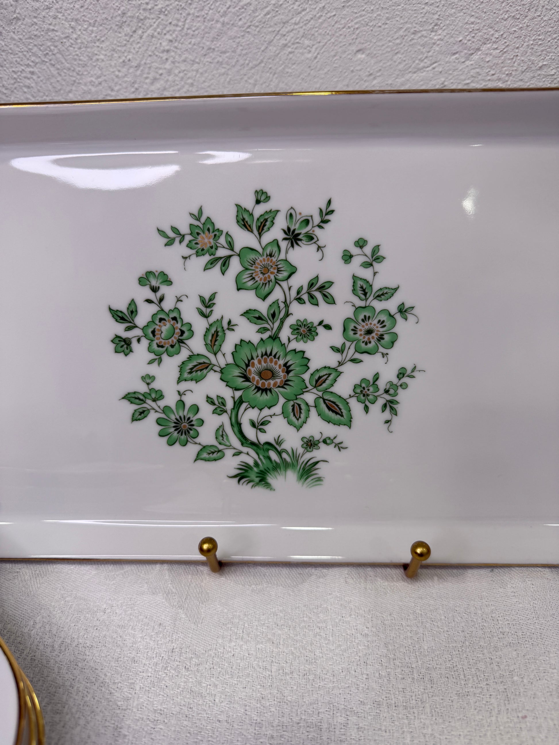 La bandeja grande (37 × 17 cm) y los seis platos de 15 cm forman un set armonioso, perfecto para servir turrones, bombones, frutos secos, quesos o aperitivos festivos. Su combinación de verde navideño y dorado cálido crea una estética refinada, clásica y atemporal, ideal para vestir la mesa en Nochebuena, Navidad o fin de año. Fabricada en Alemania por la histórica casa Tirschenreuth, esta porcelana destaca por su calidad fina, su brillo suave y su decoración minuciosa. En muy buen estado de conservación. Por favor, revise bien las fotografías, ya que son parte importante de la descripción.