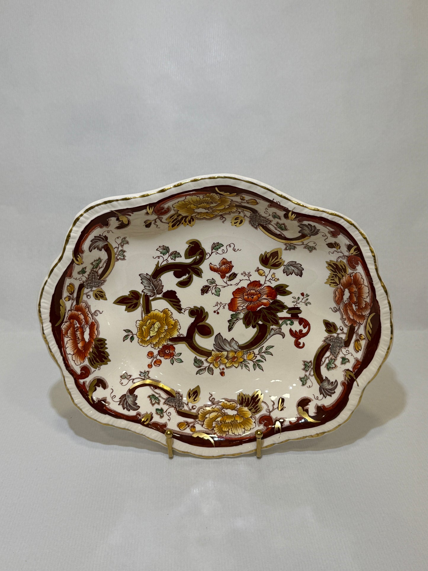 Elegante fuente ovalada de loza inglesa firmada por Mason’s Ironstone, una de las marcas más emblemáticas de la cerámica británica. Esta pieza pertenece al modelo Brown Velvet, conocido por su rica decoración floral en tonos cálidos (rojo, amarillo, ocre y verde), con detalles en dorado y un perfil ondulado que realza su forma.Es una pieza versátil y decorativa, ideal para servir en ocasiones especiales o para lucirse en una vitrina o aparador con encanto. En buen estado de conservación. Por favor, revise bien las fotografías, ya que son parte importante de la descripción.