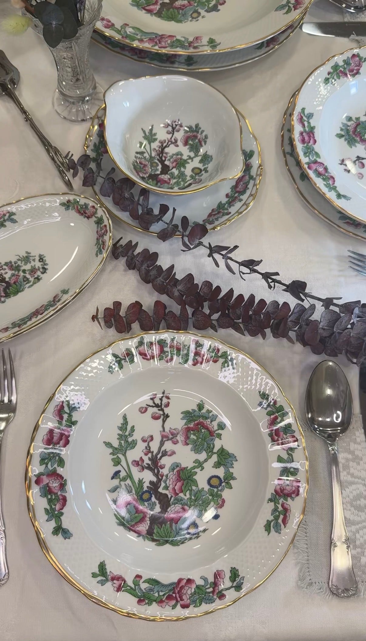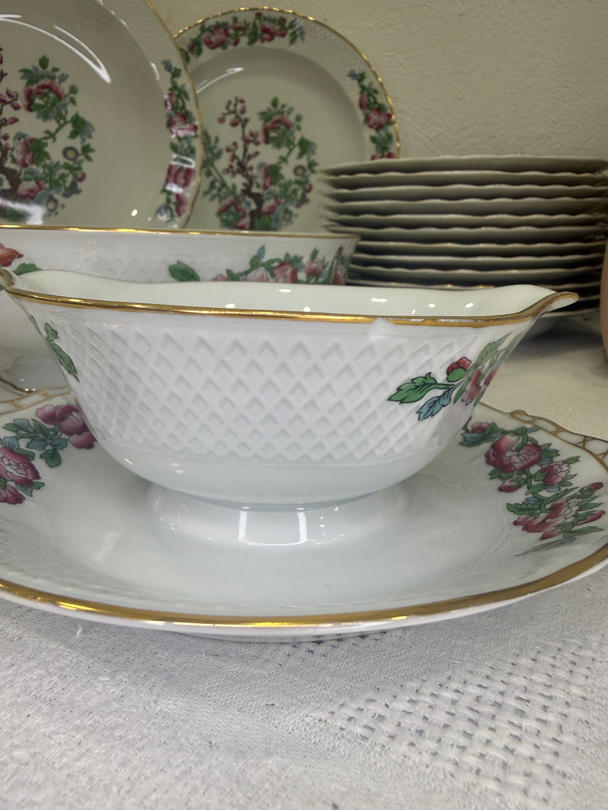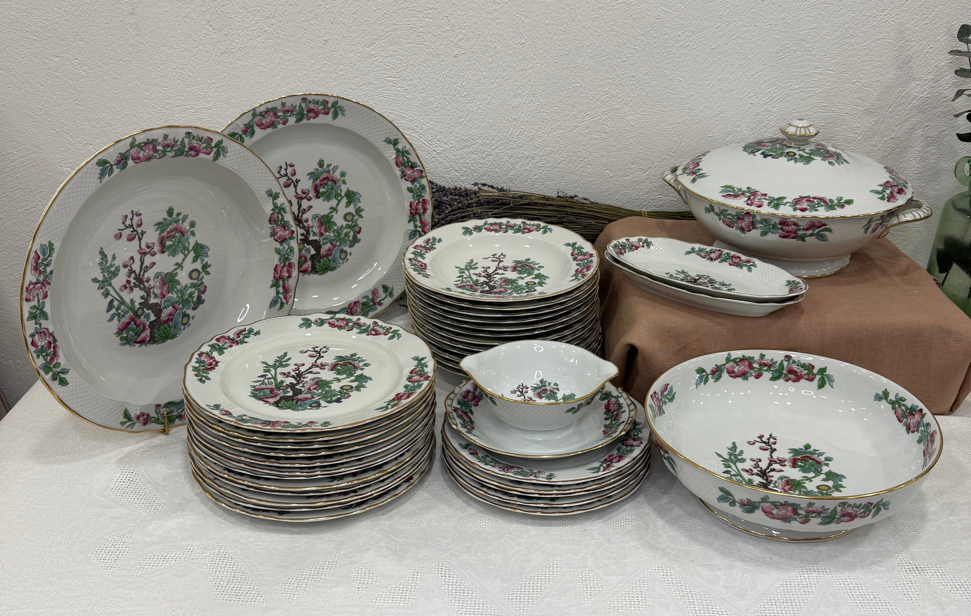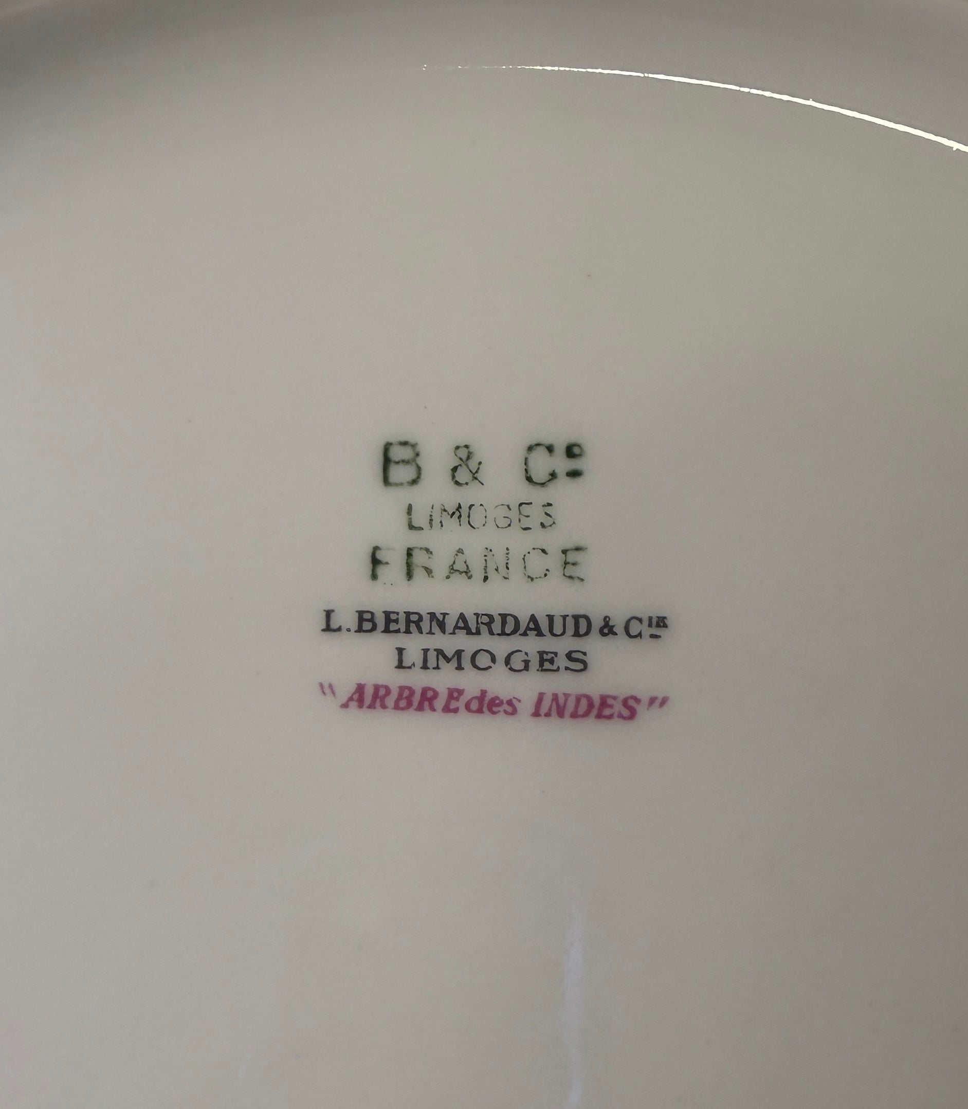 Elegante vajilla francesa de porcelana Bernardaud, modelo Arbre des Indes, una de las decoraciones clásicas más apreciadas de la firma. Inspirada en la estética oriental y realizada en fina porcelana de Limoges, es un modelo muy buscado por coleccionistas y amantes de la porcelana francesa por su delicadeza, color y refinados detalles dorados.