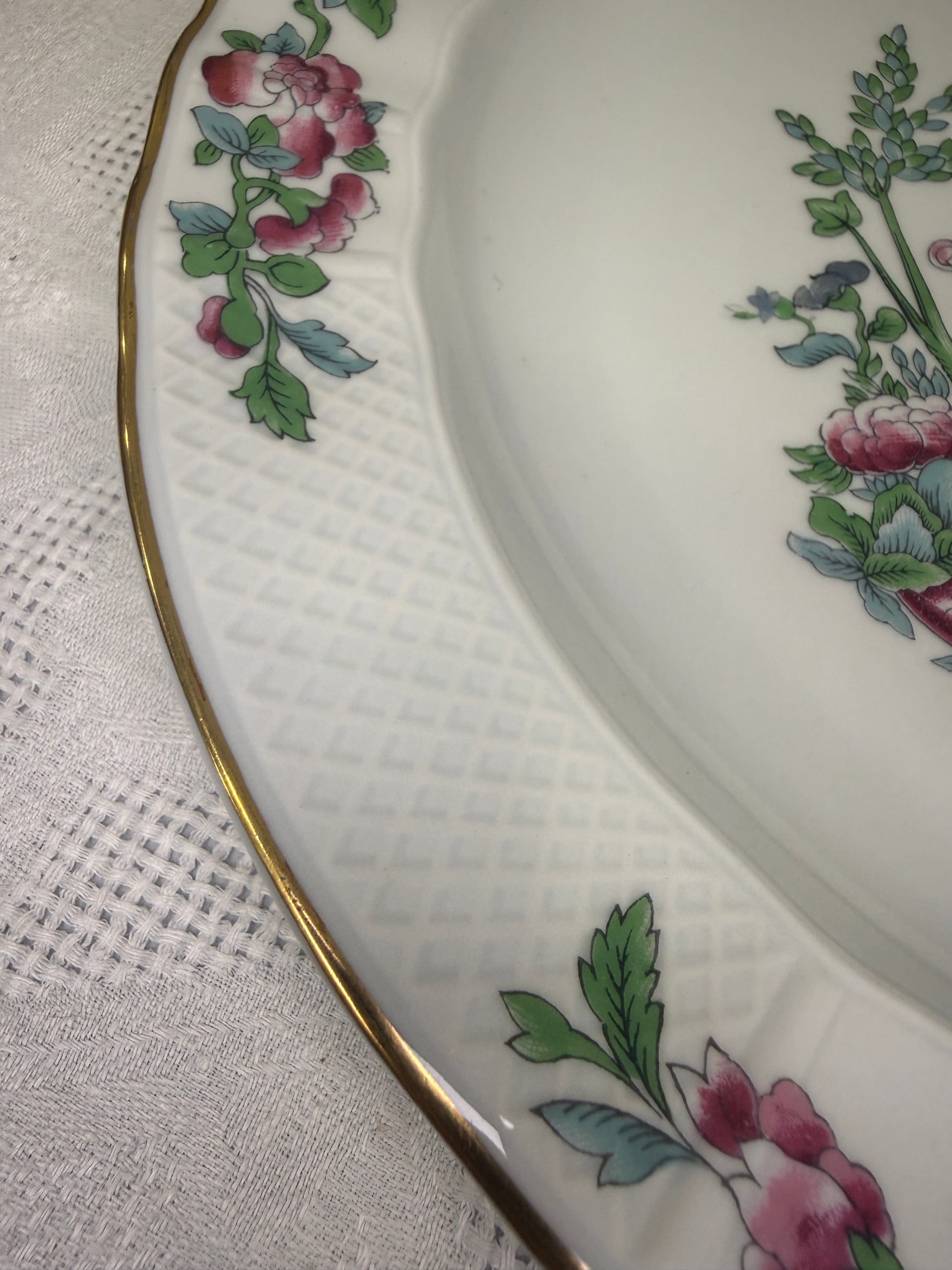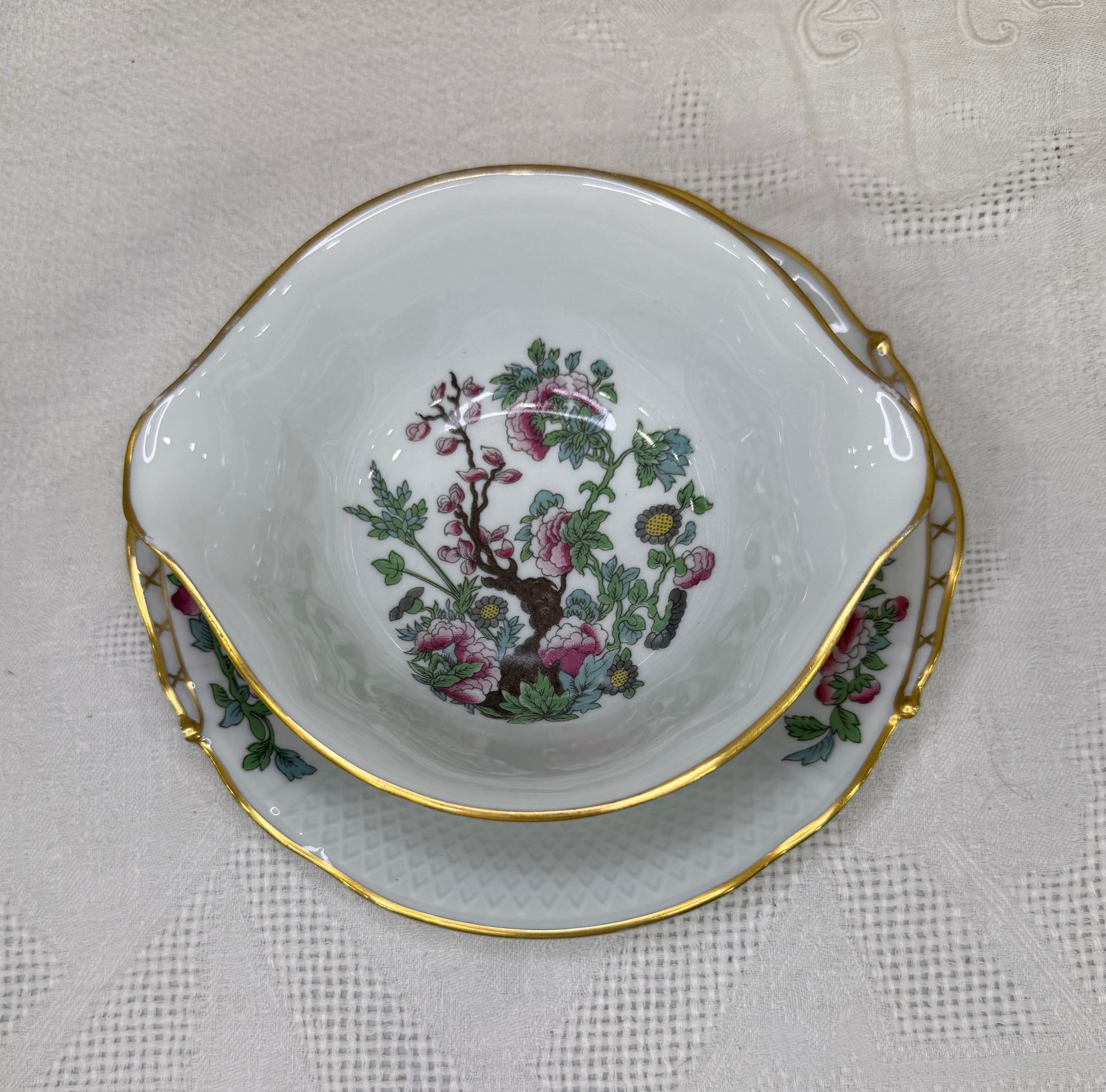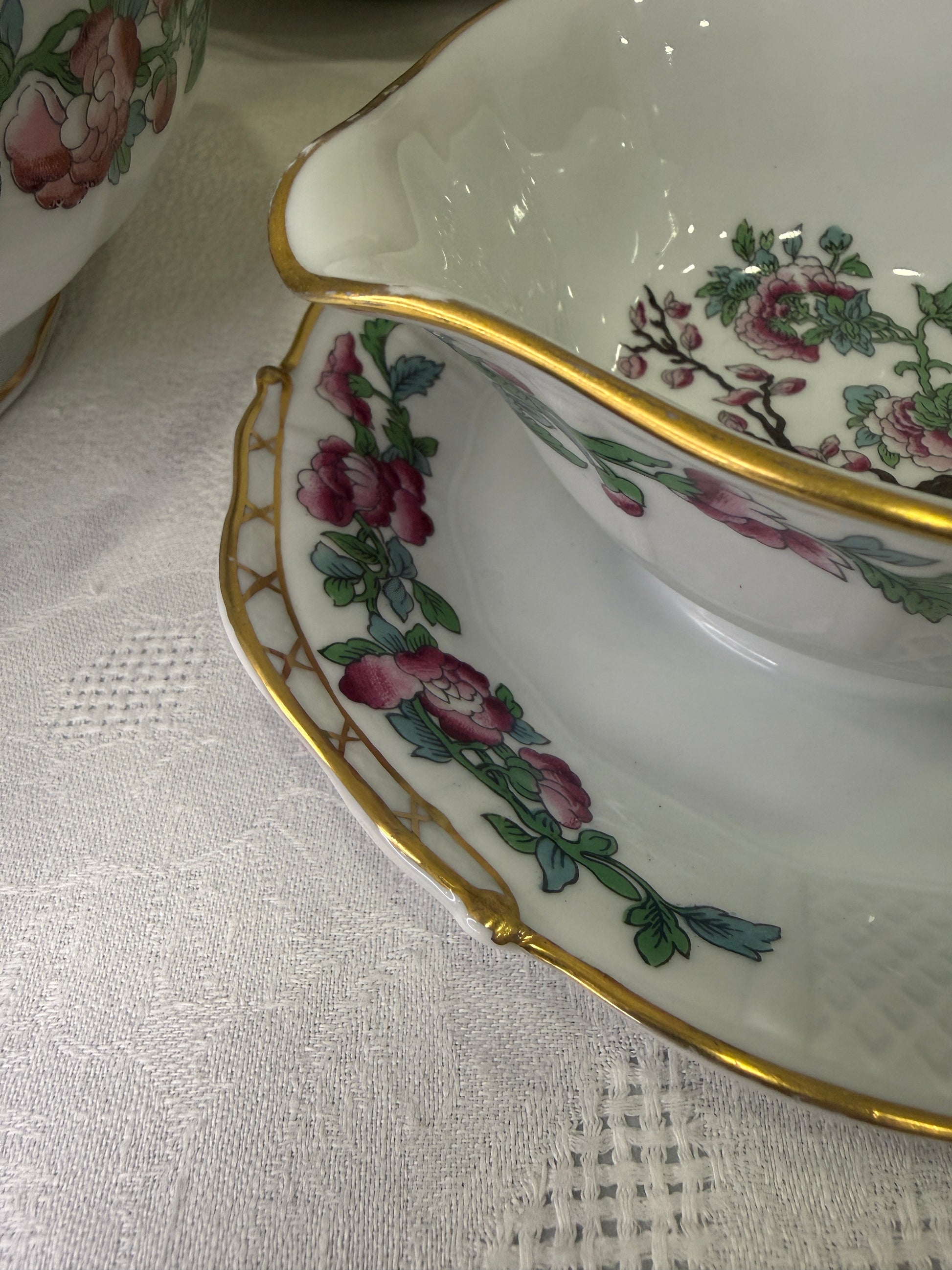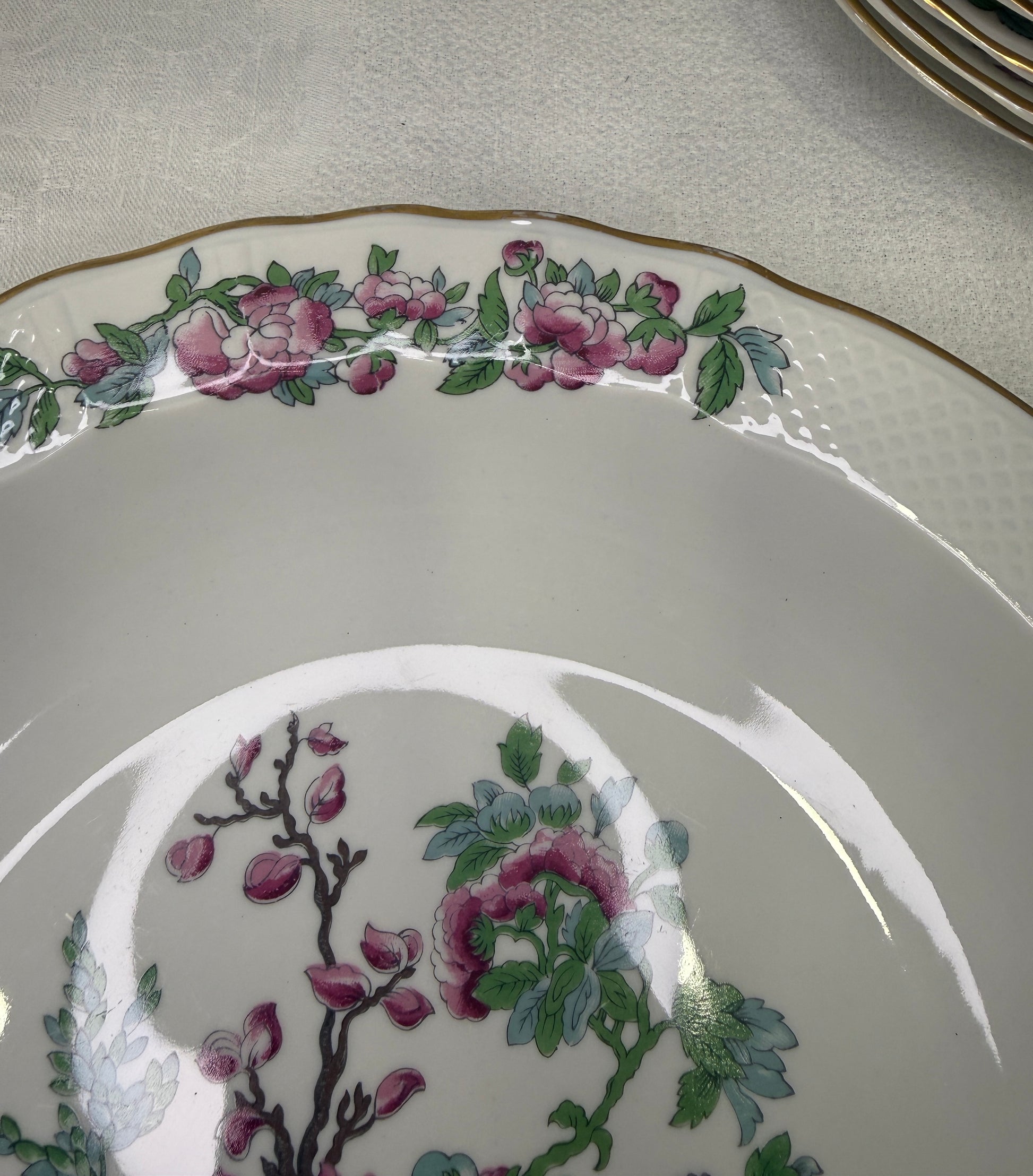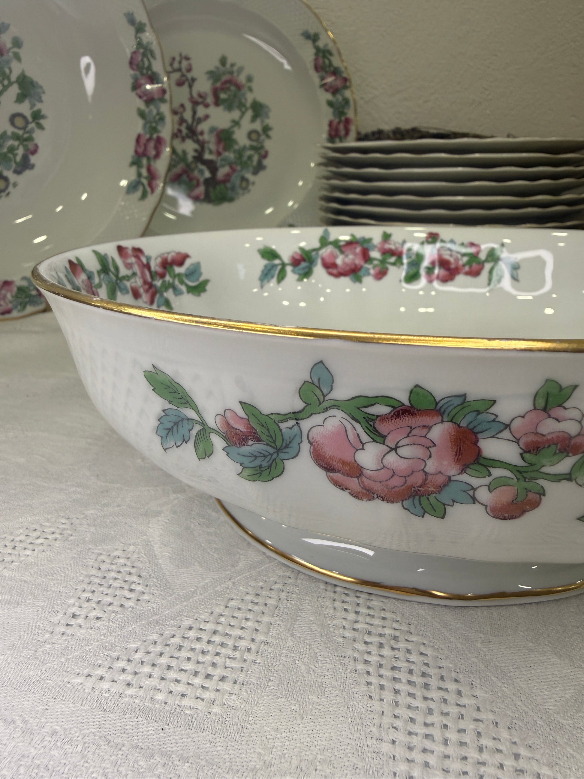 Elegante vajilla francesa de porcelana Bernardaud, modelo Arbre des Indes, una de las decoraciones clásicas más apreciadas de la firma. Inspirada en la estética oriental y realizada en fina porcelana de Limoges, es un modelo muy buscado por coleccionistas y amantes de la porcelana francesa por su delicadeza, color y refinados detalles dorados.