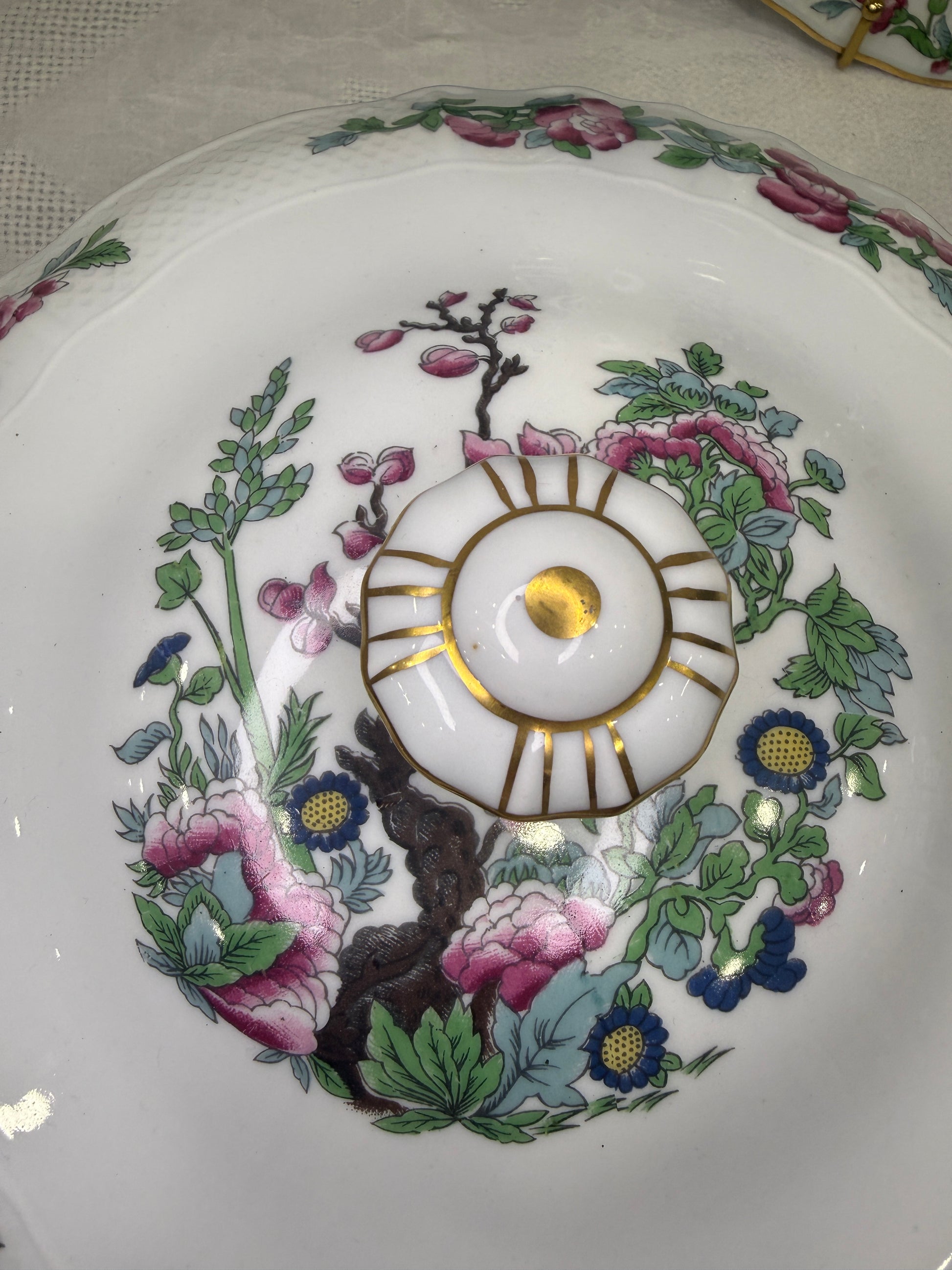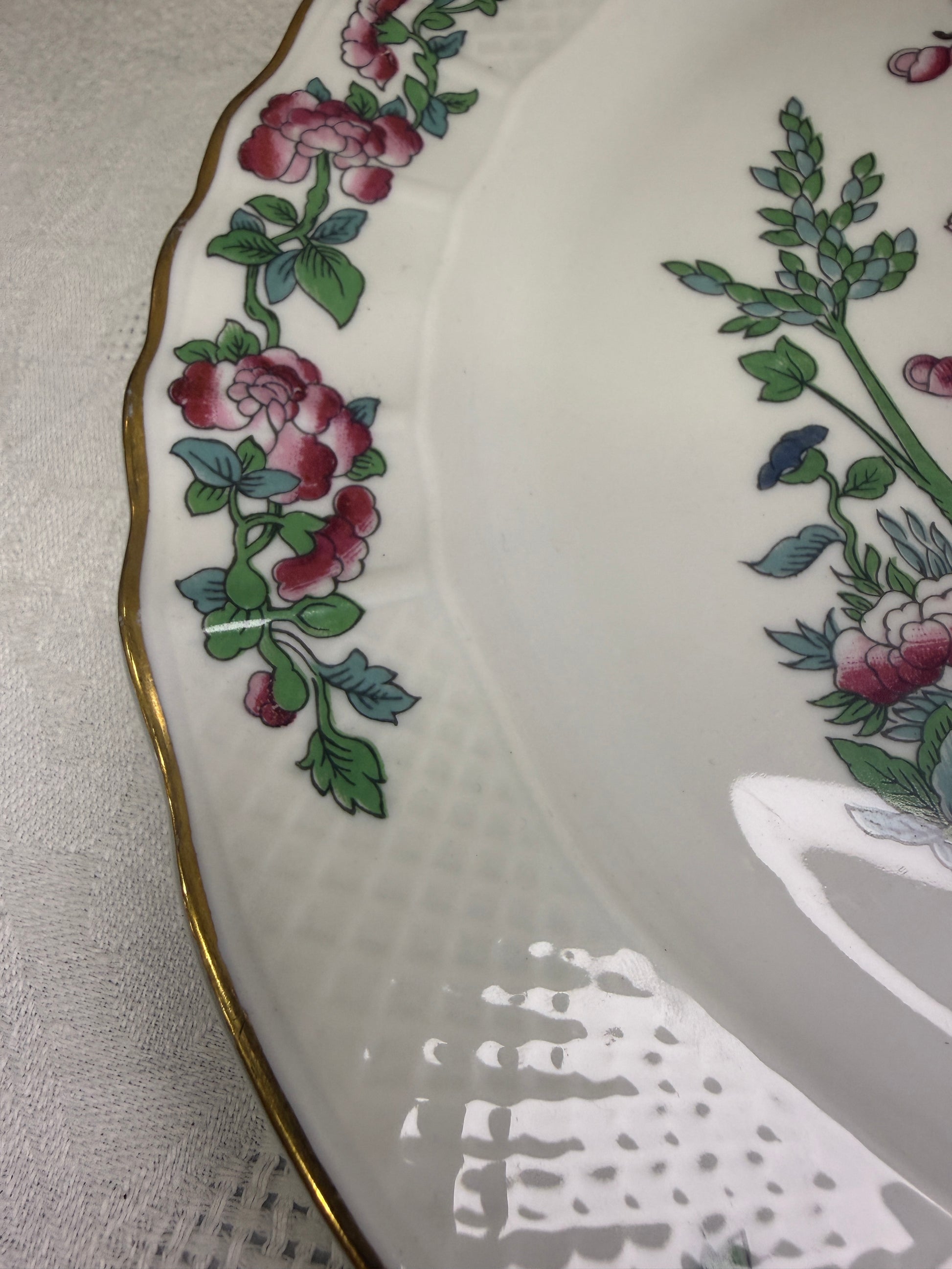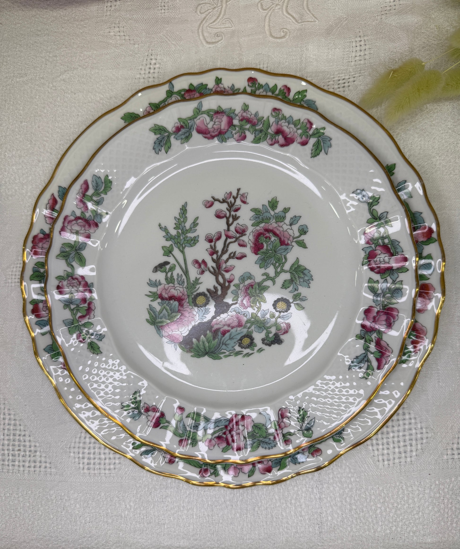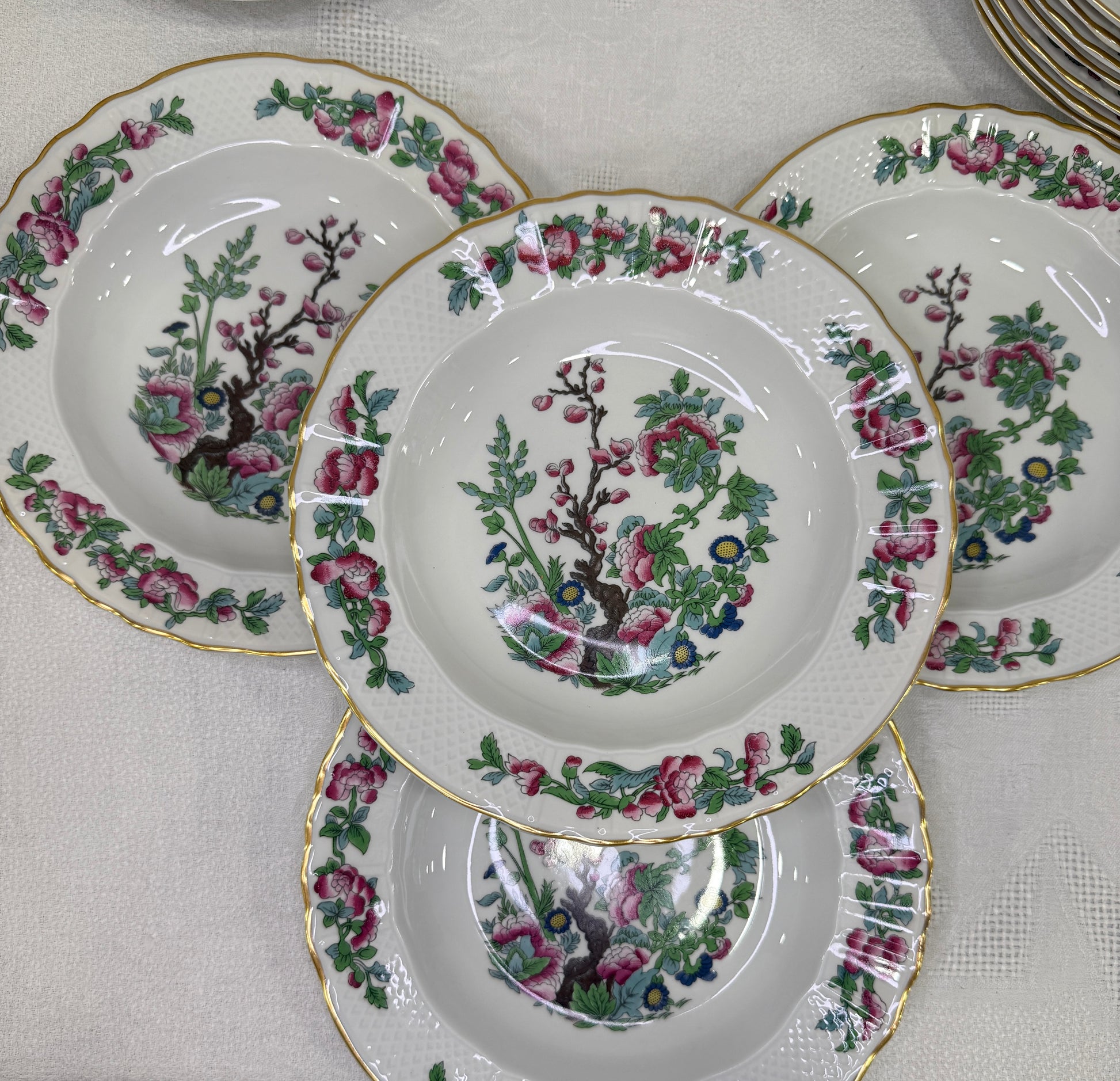 Elegante vajilla francesa de porcelana Bernardaud, modelo Arbre des Indes, una de las decoraciones clásicas más apreciadas de la firma. Inspirada en la estética oriental y realizada en fina porcelana de Limoges, es un modelo muy buscado por coleccionistas y amantes de la porcelana francesa por su delicadeza, color y refinados detalles dorados.