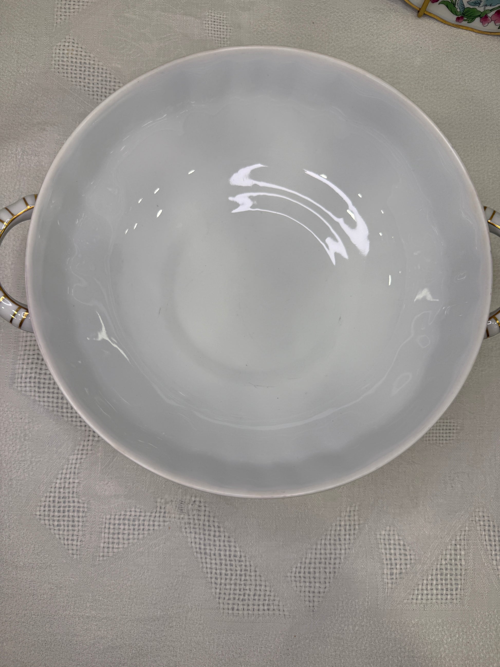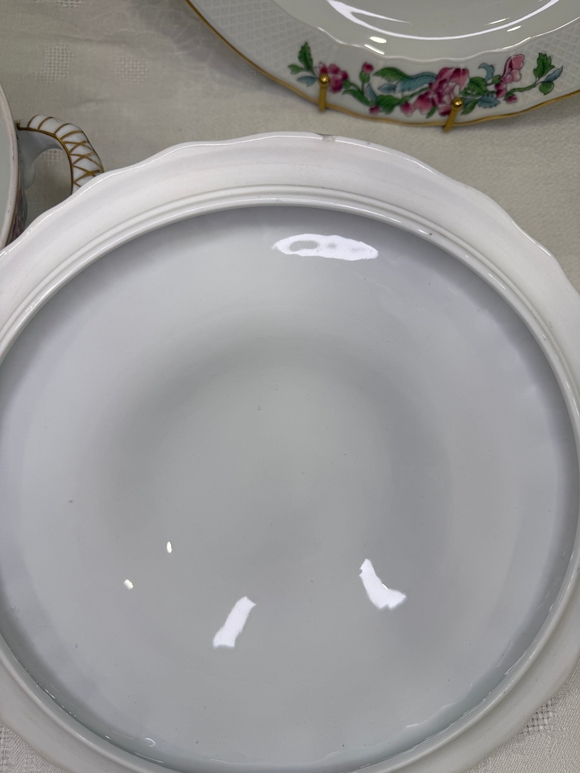 La salsera tiene un pequeño chip, y la tapa de la sopera presenta un mínimo defecto o pequeño chip en su parte interior, no visible en el uso normal. Por favor, revise bien las fotografías, ya que son parte importante de la descripción.