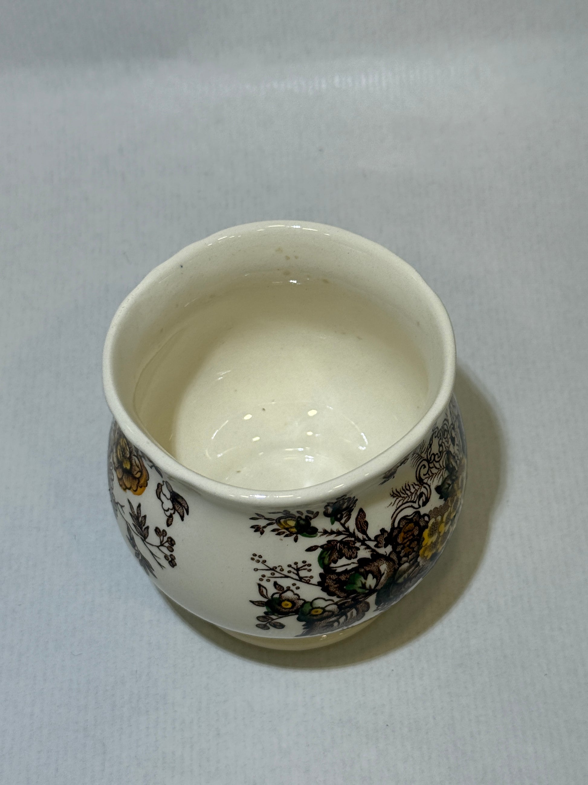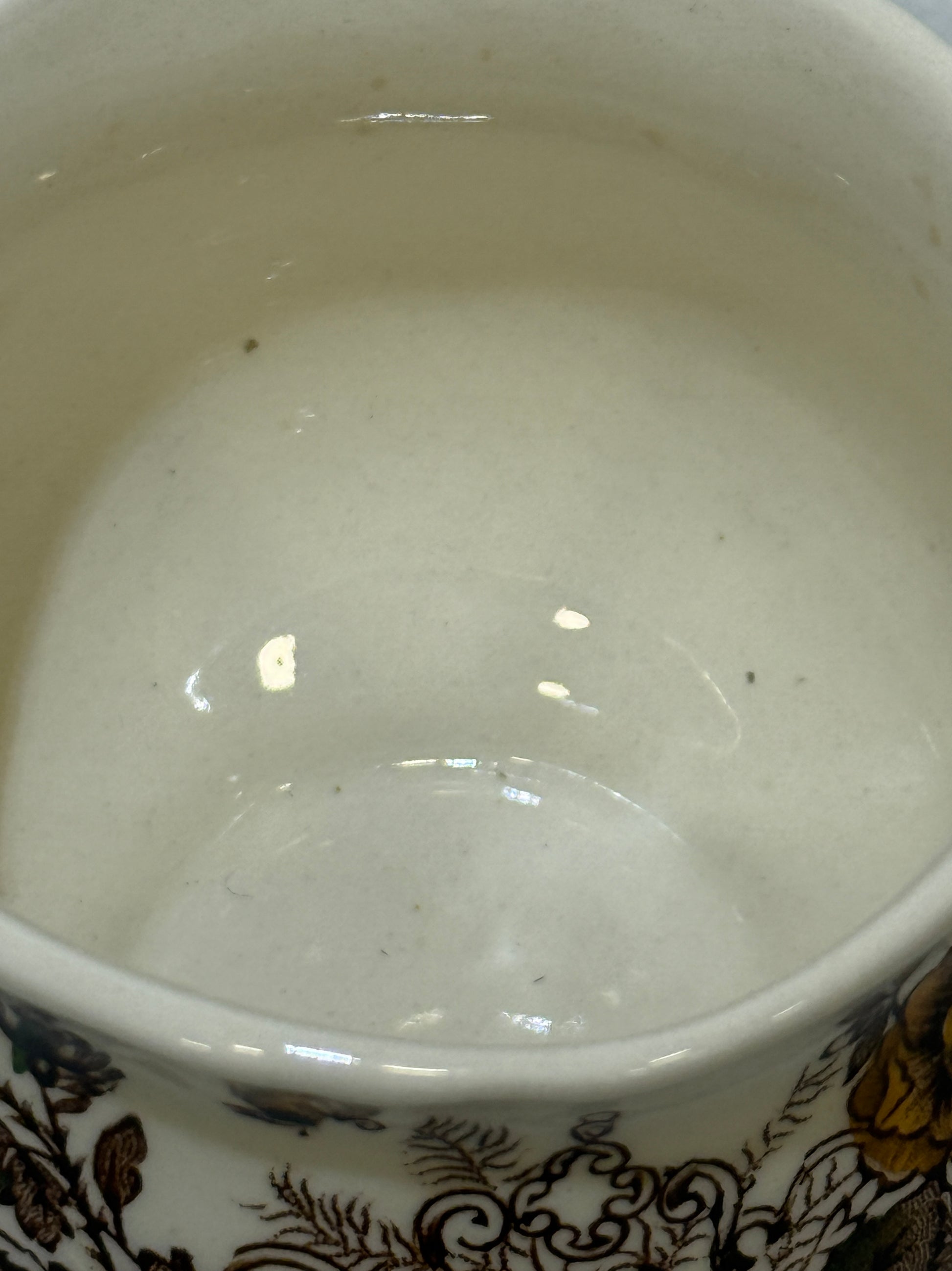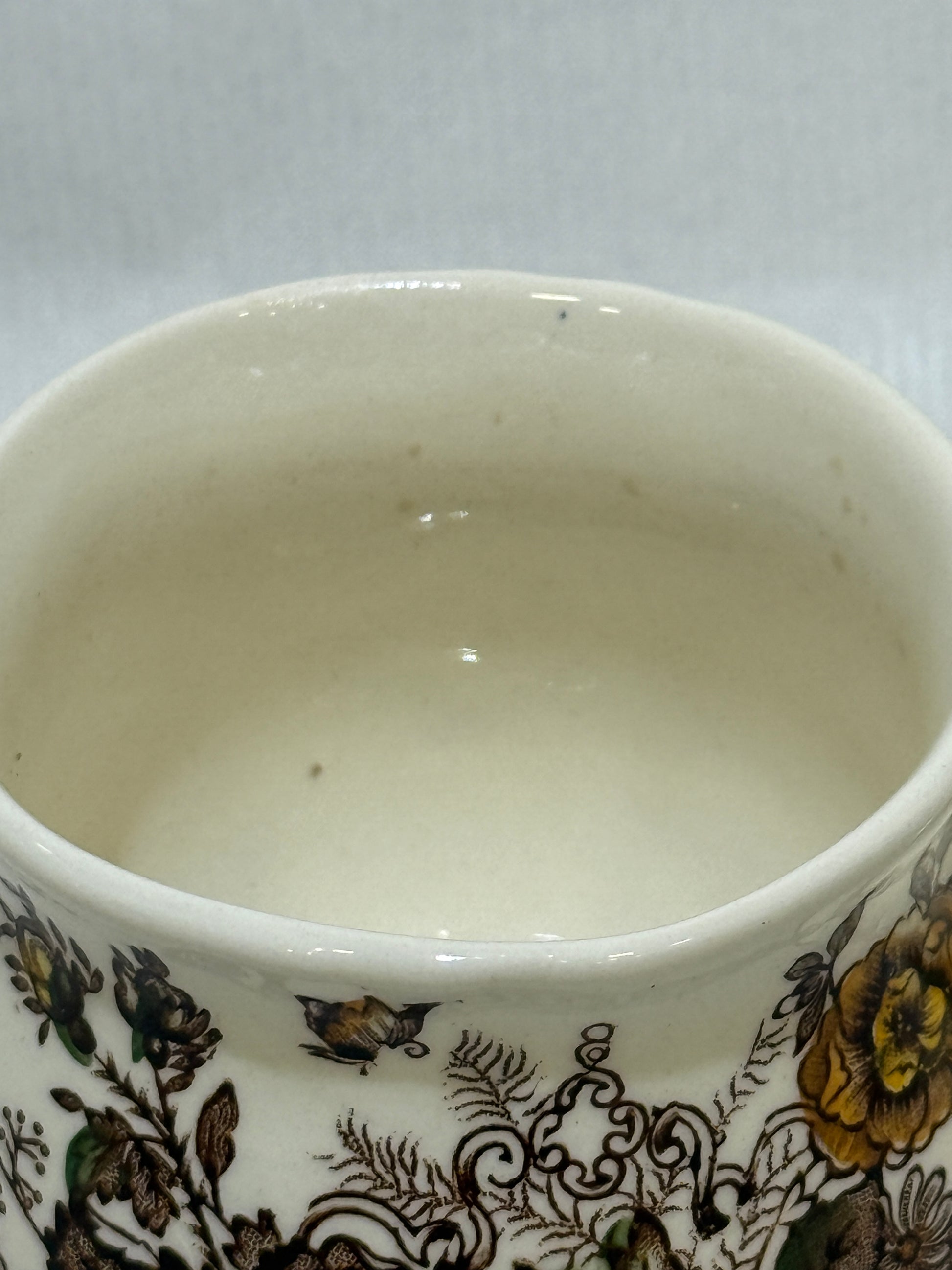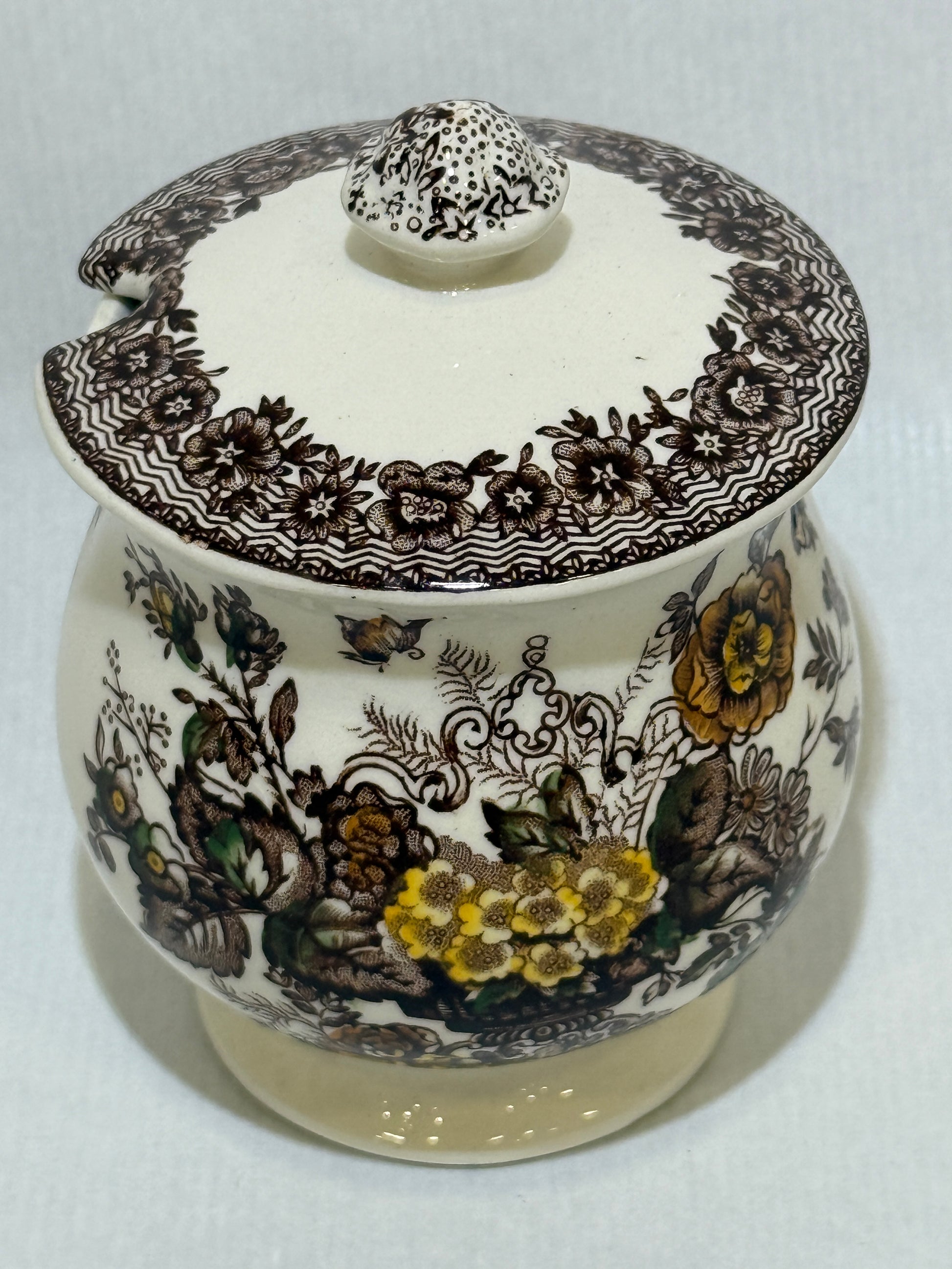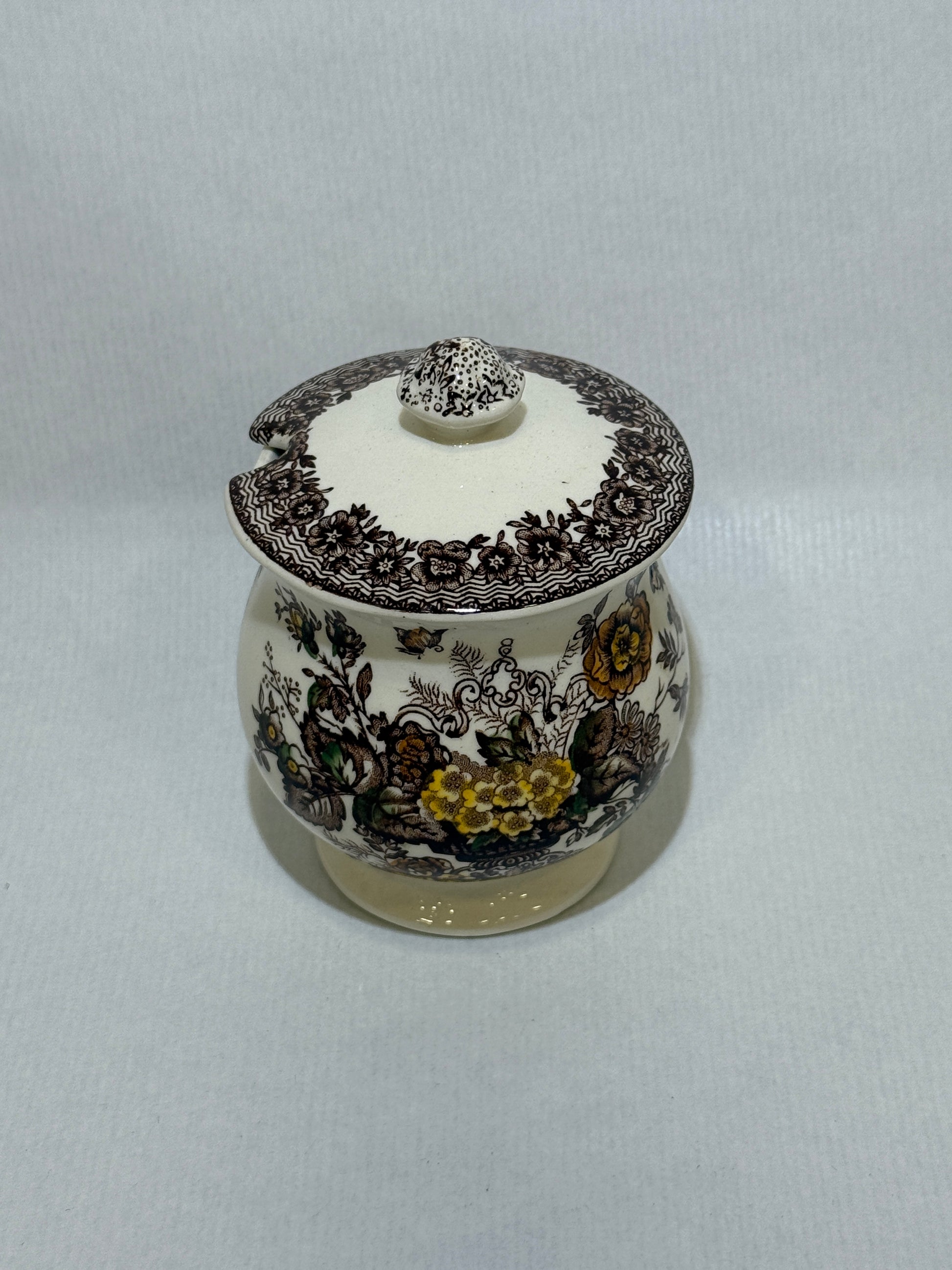 Este precioso tarro con tapa pertenece a la colección “Ascot” de la prestigiosa firma inglesa Mason’s Patent Ironstone. Decorado con un delicado estampado floral en tonos tierra, amarillos y verdes sobre fondo marfil, y rematado con cenefas marrones de inspiración victoriana, es una pieza ideal para aportar carácter a la mesa o la cocina. Lo hace perfecto como: Mostacero, tarro de miel, contenedor para salsas o condimentos, pequeño azucarero o tarro decorativo ideal para pinceles y más. En buen estado de conservación. Por favor, revise bien las fotografías, ya que son parte importante de la descripción.