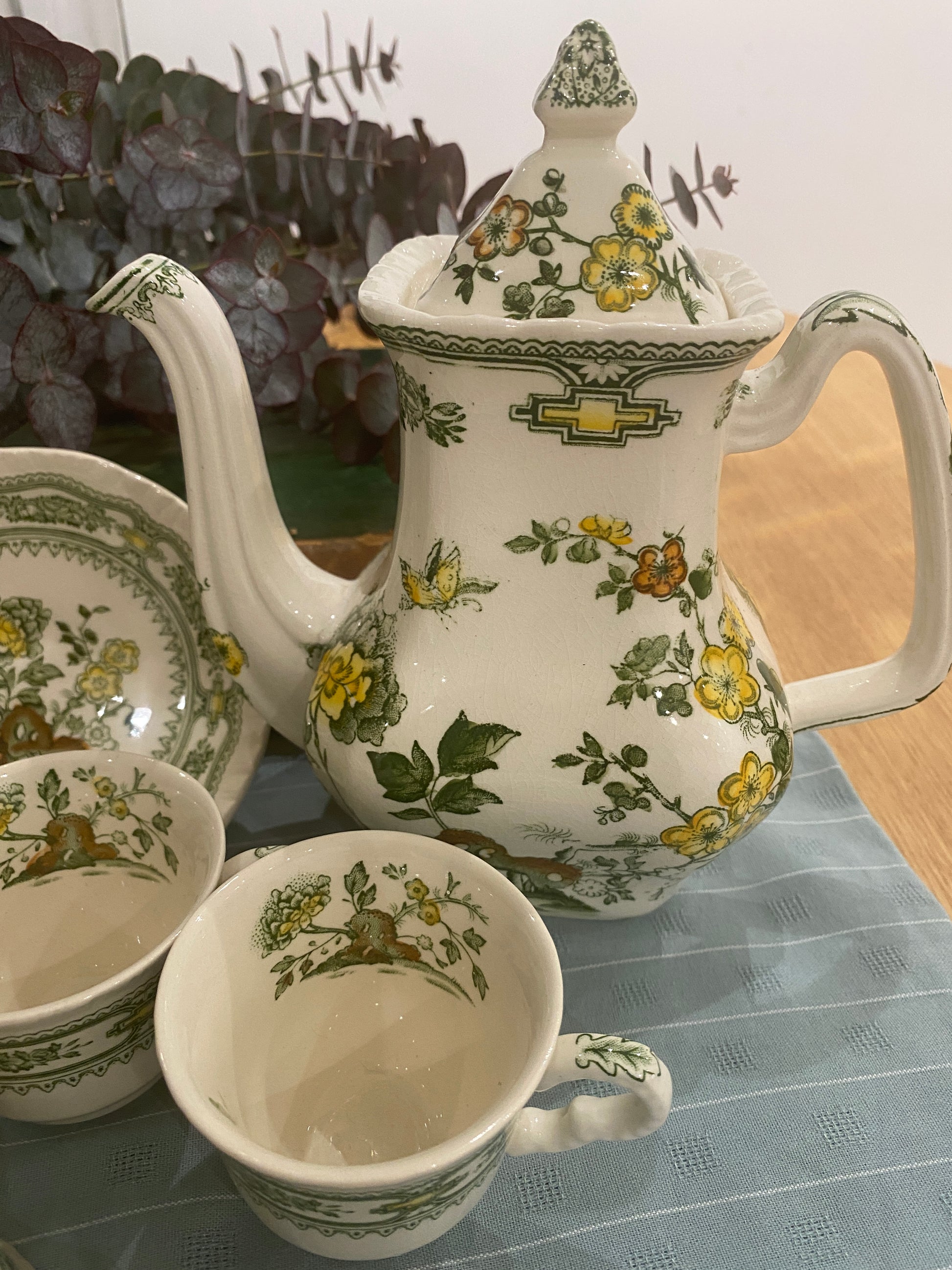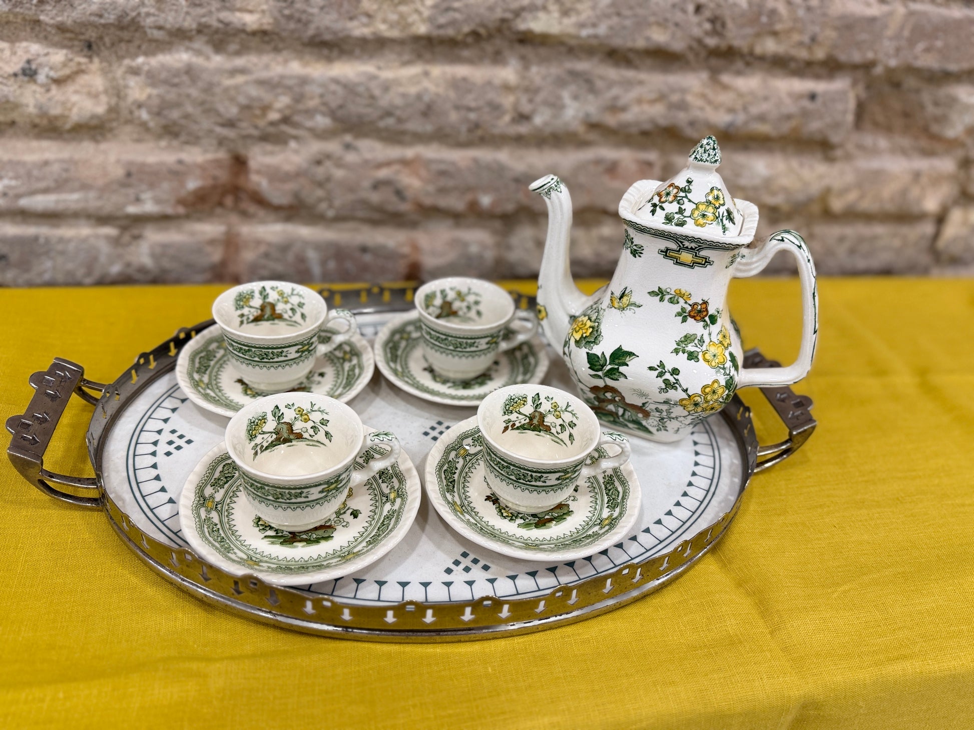 Elegante cafetera de loza inglesa de la reconocida firma Mason’s Ironstone, en su clásico modelo Manchu, decorada en un intenso verde jade con escenas orientales de inspiración chinoiserie. Esta pieza combina el encanto de la porcelana inglesa con el exotismo del diseño oriental tan característico de la marca. Fabricada en Inglaterra durante el siglo XX, la cafetera conserva el característico sello de Mason’s y está elaborada en ironstone, una loza vitrificada especialmente resistente. Ideal para coleccionistas o amantes de las piezas con carácter, tanto para uso como para decoración. En perfecto estado de conservación. Por favor, revise bien las fotografías, ya que son parte importante de la descripción.