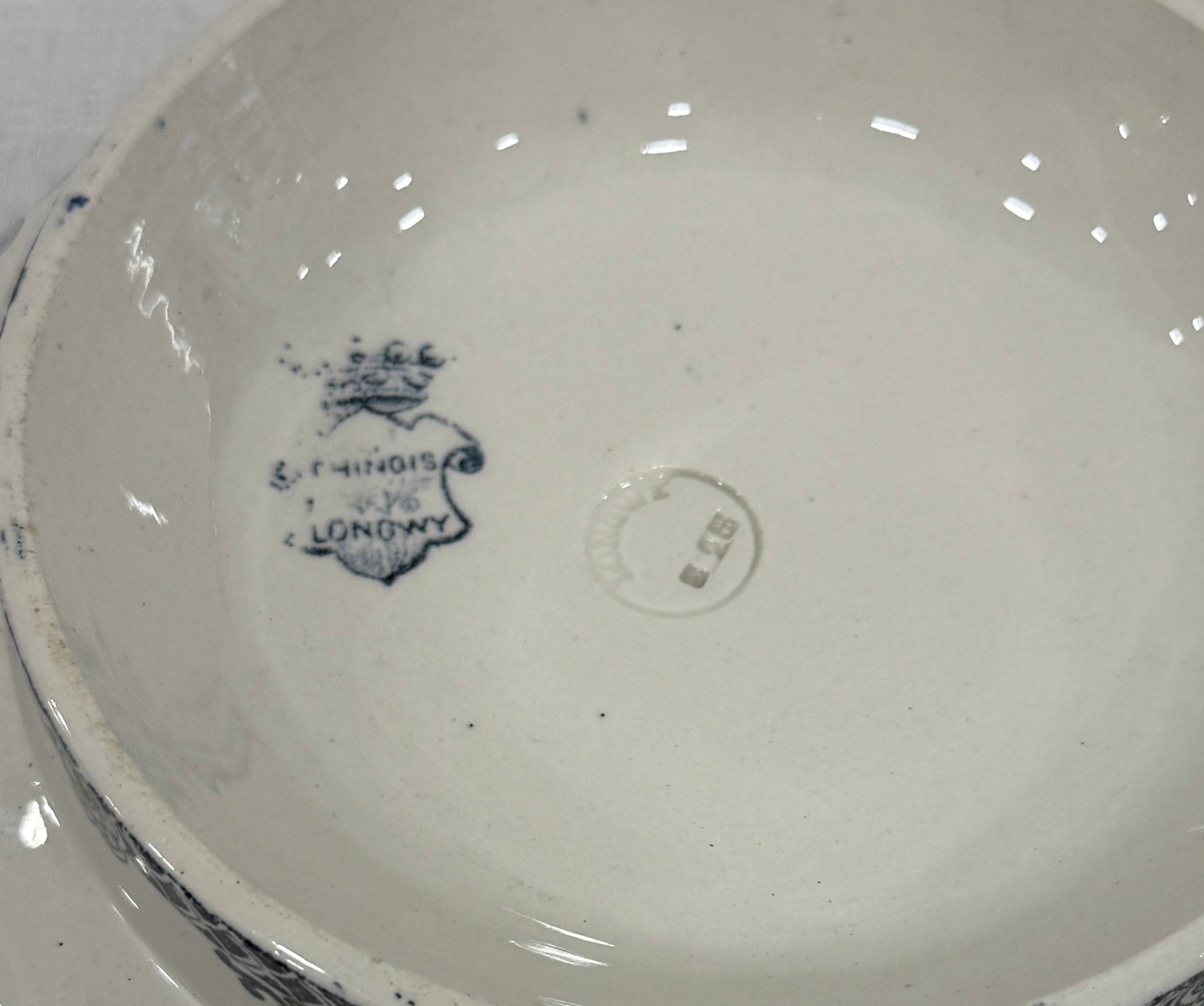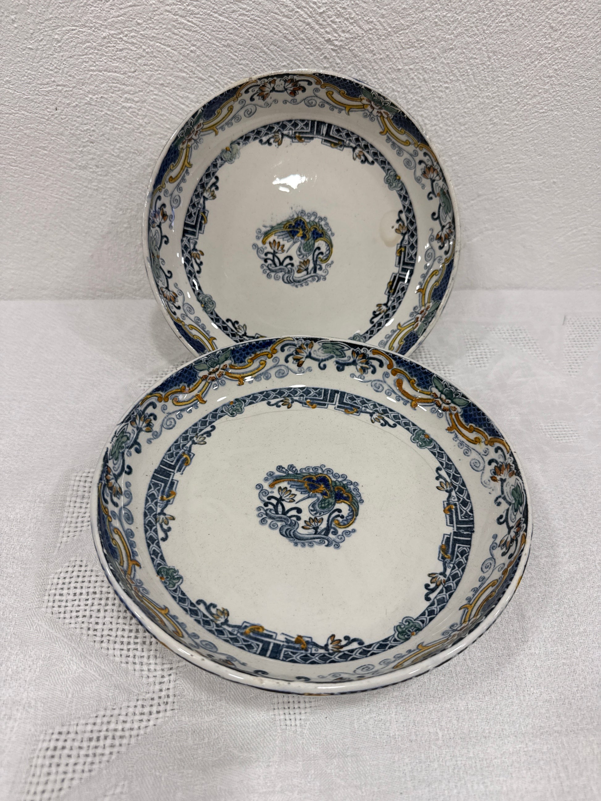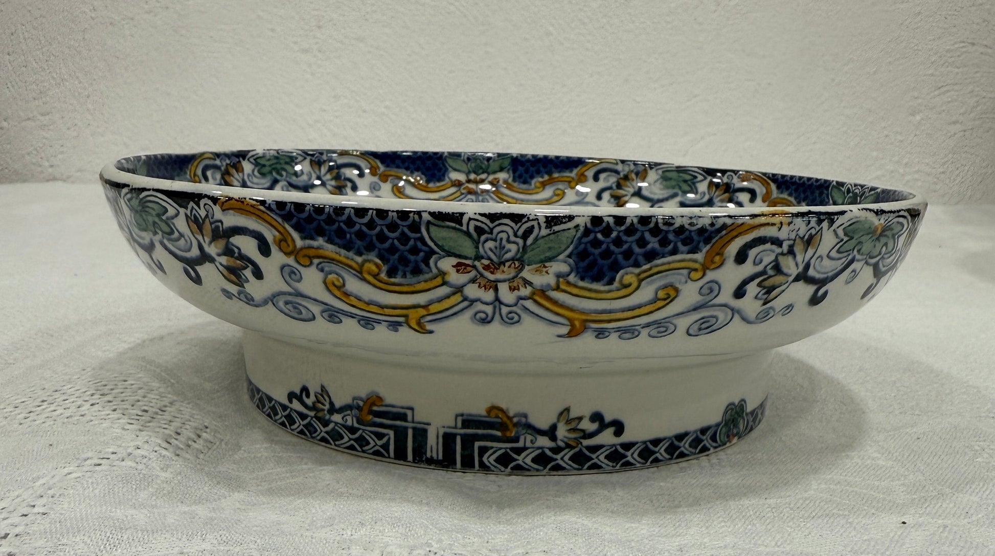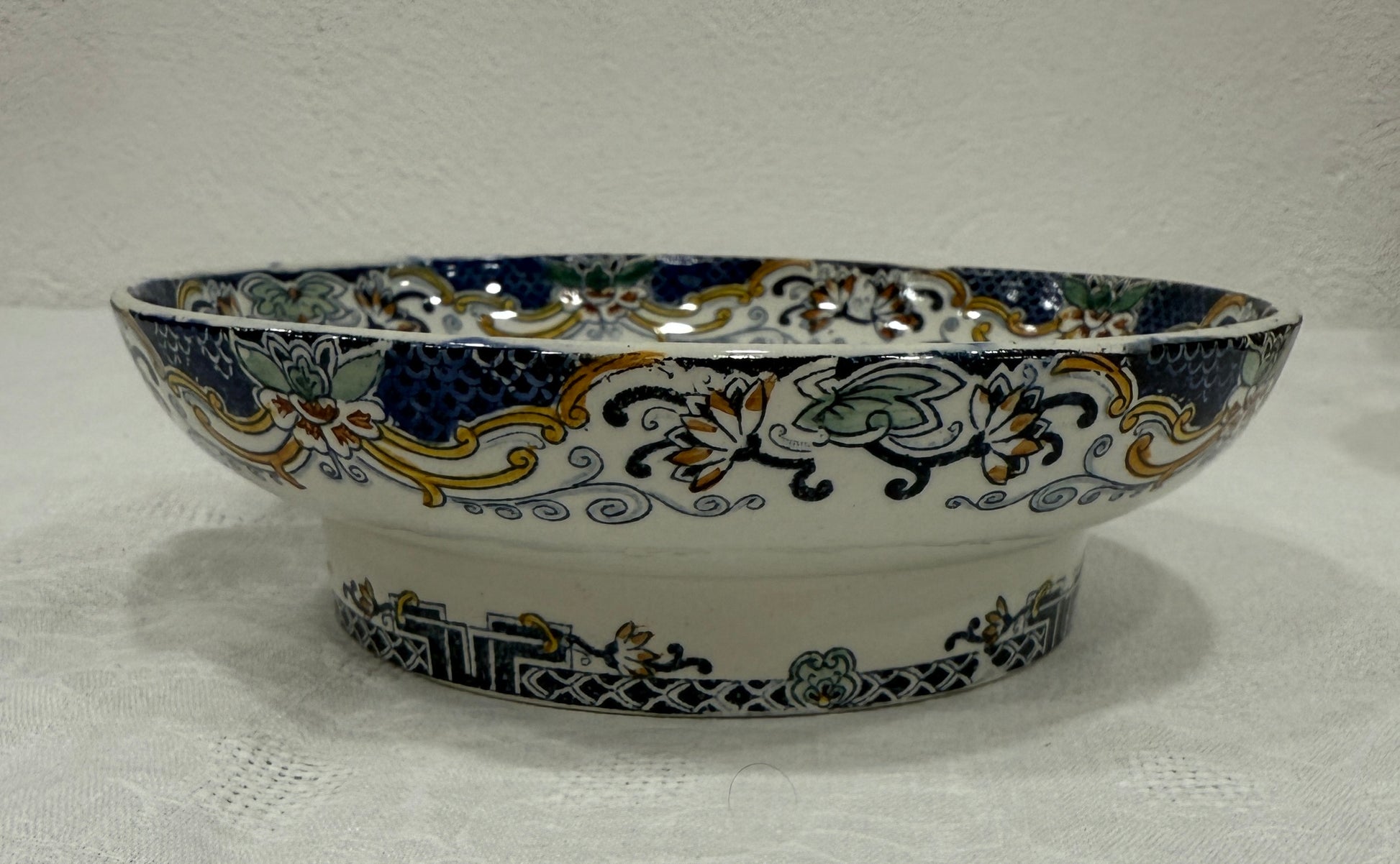 Compotier antiguo bajo hondo de la prestigiosa fábrica Longwy (Francia), perteneciente al modelo Chinois, un diseño inspirado en la estética oriental tan apreciada a finales del siglo XIX. Decorado en tonos azul cobalto, amarillo mostaza y verde con motivos florales y geométricos, es una pieza que refleja la maestría del transferware francés de la época.