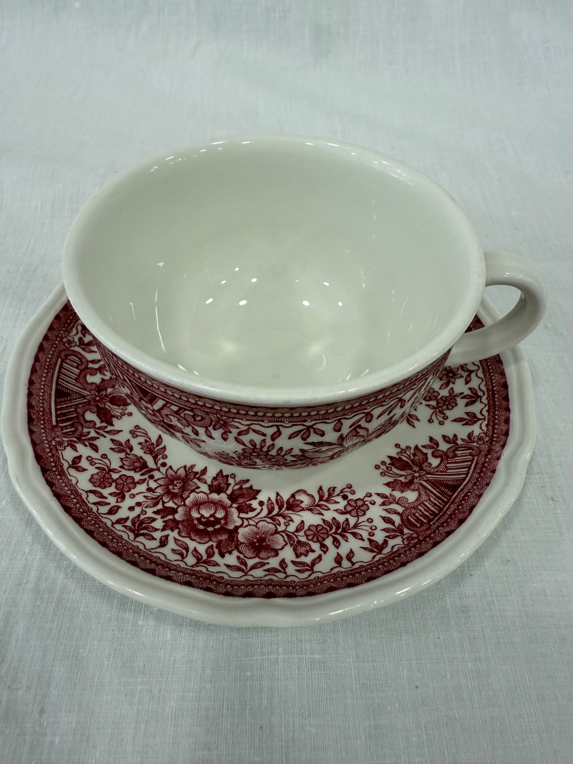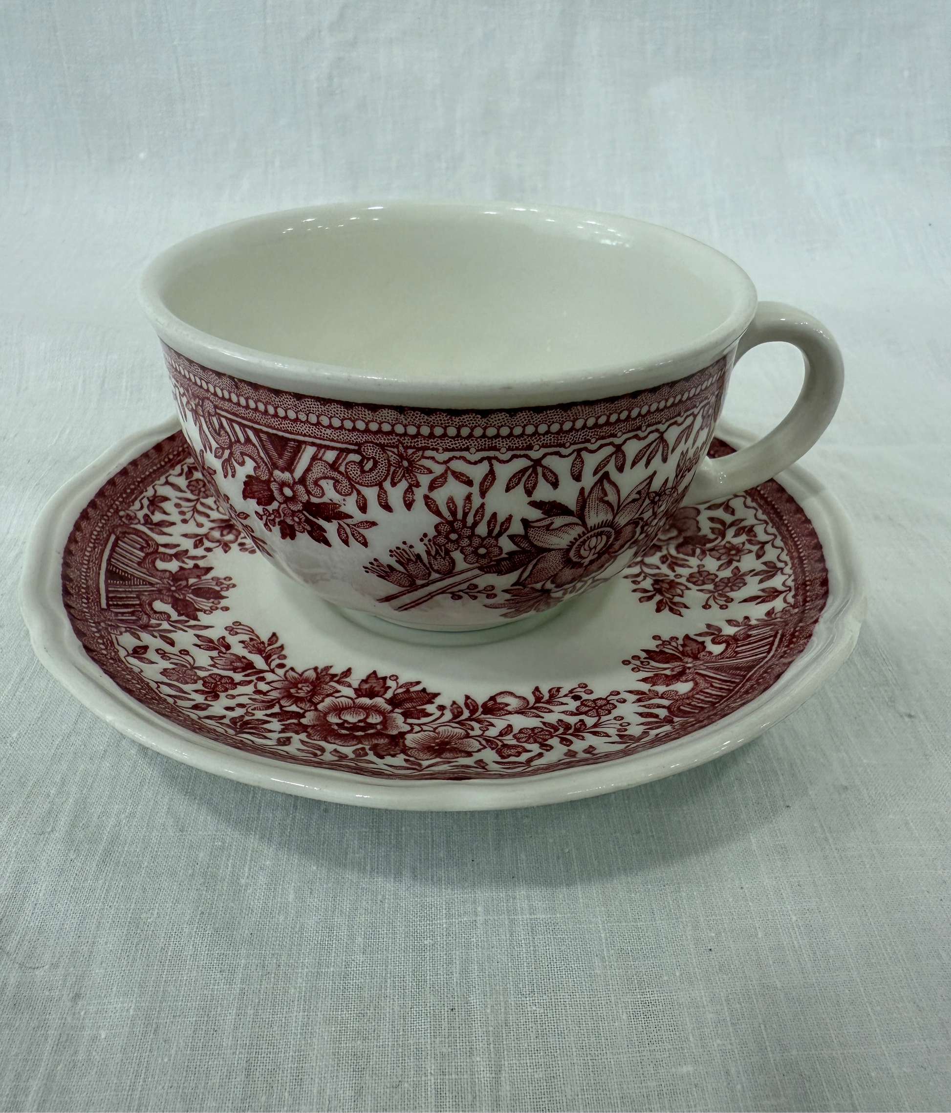 Encantadora taza con plato del modelo Fasan de Villeroy & Boch, en color rojo burdeos sobre fondo blanco, fabricada en Alemania entre 1960 y 1975. Este set pertenece a una de las colecciones más clásicas de la firma alemana. El diseño presenta un elegante patrón floral con cenefa decorativa, típico del estilo tradicional europeo. Su delicada forma y su material resistente (vitroporcelana) la hacen ideal tanto para el uso diario como para coleccionistas de vajilla antigua. En perfecto estado de conservación. Por favor, revise bien las fotografías, ya que son parte importante de la descripción. 4 unidades disponibles