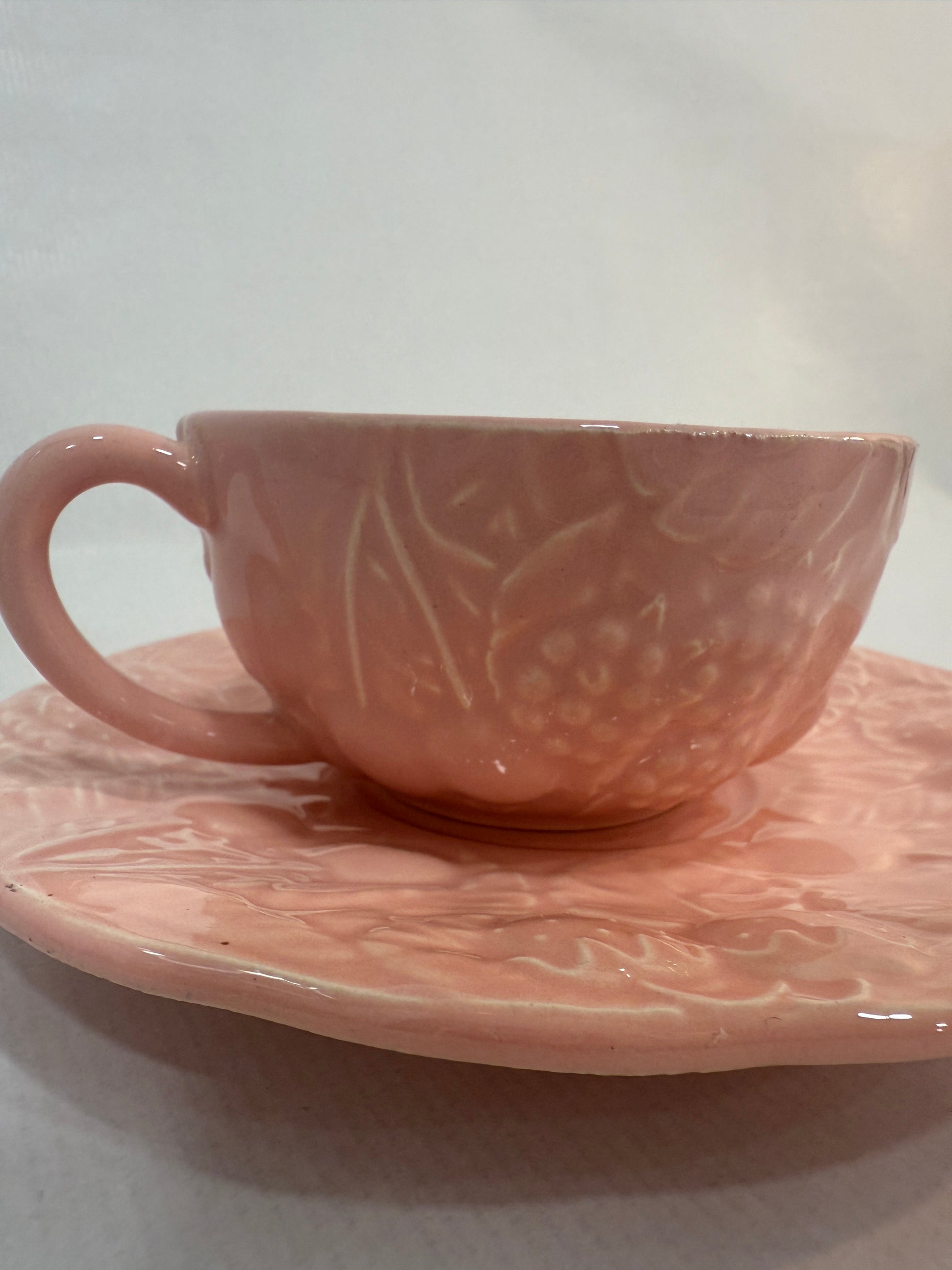 Delicada taza con plato a juego de la reconocida firma francesa Geneviève Lethu, famosa por sus diseños elegantes y funcionales. Esta pieza en cerámica esmaltada rosa presenta un precioso relieve de fresas y hojas, típico de sus colecciones más icónicas de los años 80–90. Con un diseño moldeado en relieve y un acabado brillante, es ideal tanto para disfrutar de una infusión como para decorar una cocina con encanto vintage. Su color rosa empolvado y su estética naturalista la convierten en una pieza muy especial y buscada por amantes del diseño retro francés. En buen estado de conservación. Por favor, revise bien las fotografías, ya que son parte importante de la descripción. 4 unidades disponibles.