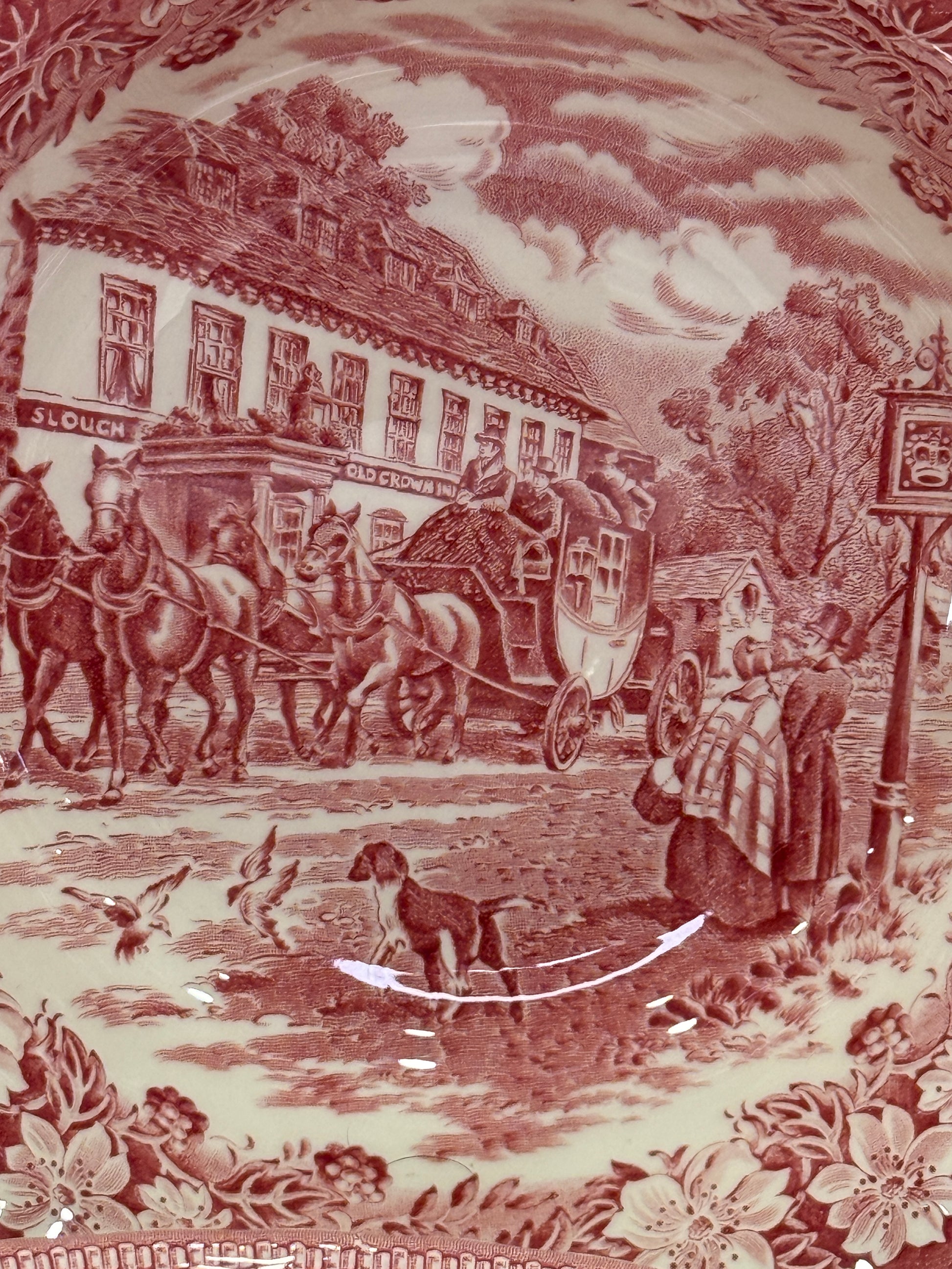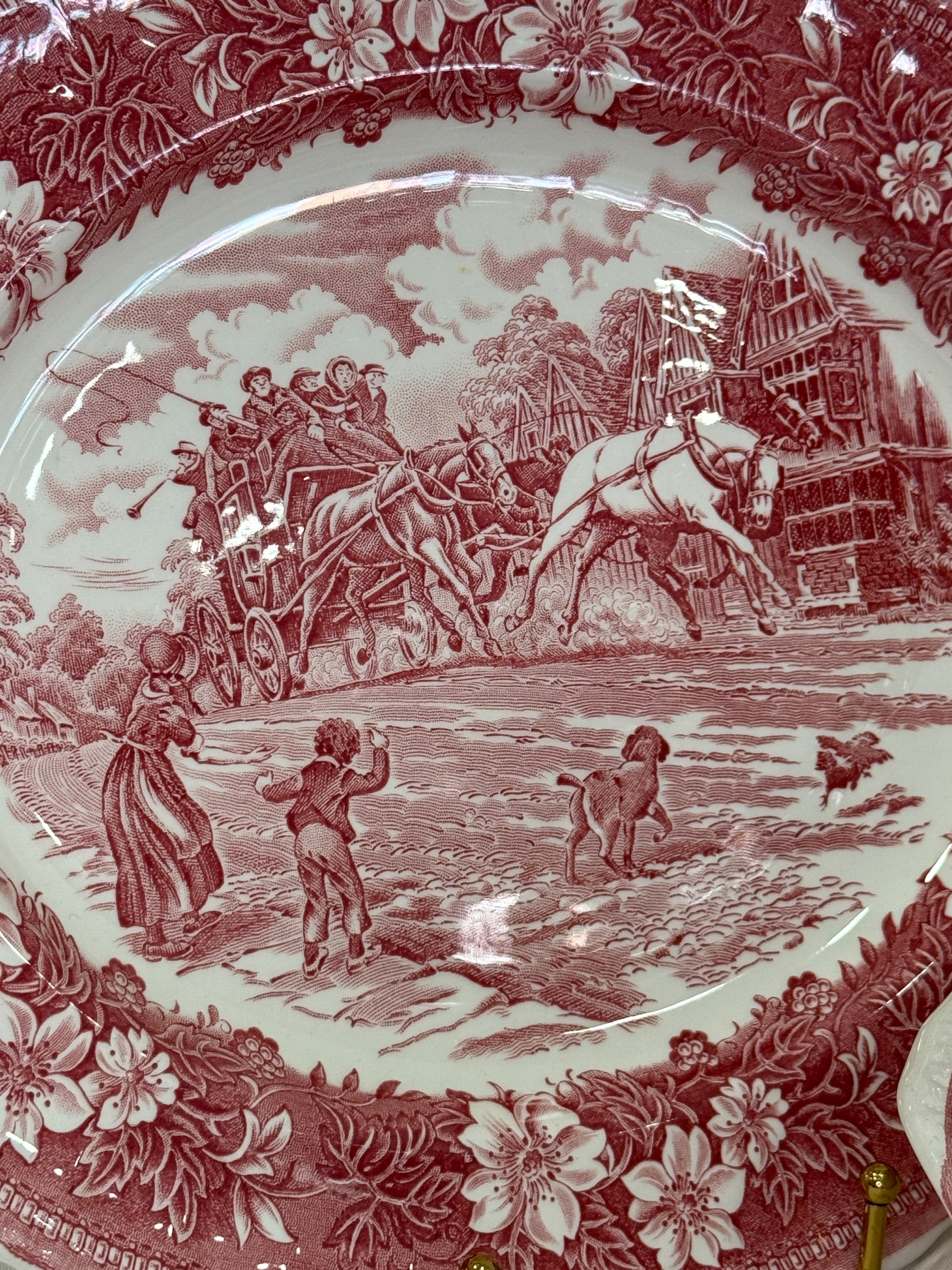 El modelo “Coaching Taverns”, diseñado y grabado a mano por H. M. Ellor, reproduce escenas de posadas y diligencias inglesas del año 1828, en un exquisito tono burdeos sobre fondo marfil. Sus motivos florales en relieve enmarcan las escenas campestres con un estilo típicamente victoriano, elegante y nostálgico.